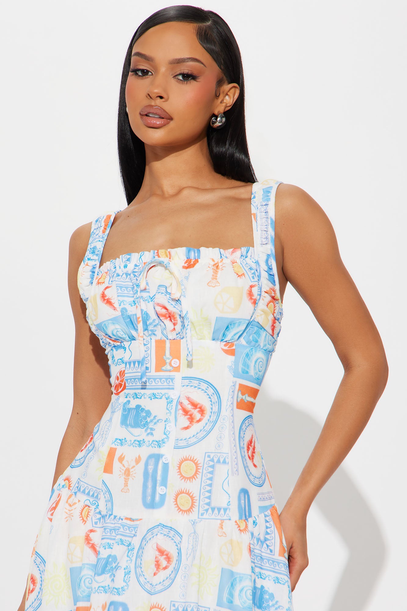 Available In Blue/combo. Vacation Print Maxi Dress Sleeveless Square Neckline Tie Front Faux Button Front Drop Waist Hidden Back Zipper Lining No Stretch Disclaimer: Print Placement Will Vary Self/Lining: 100% Polyester Imported |