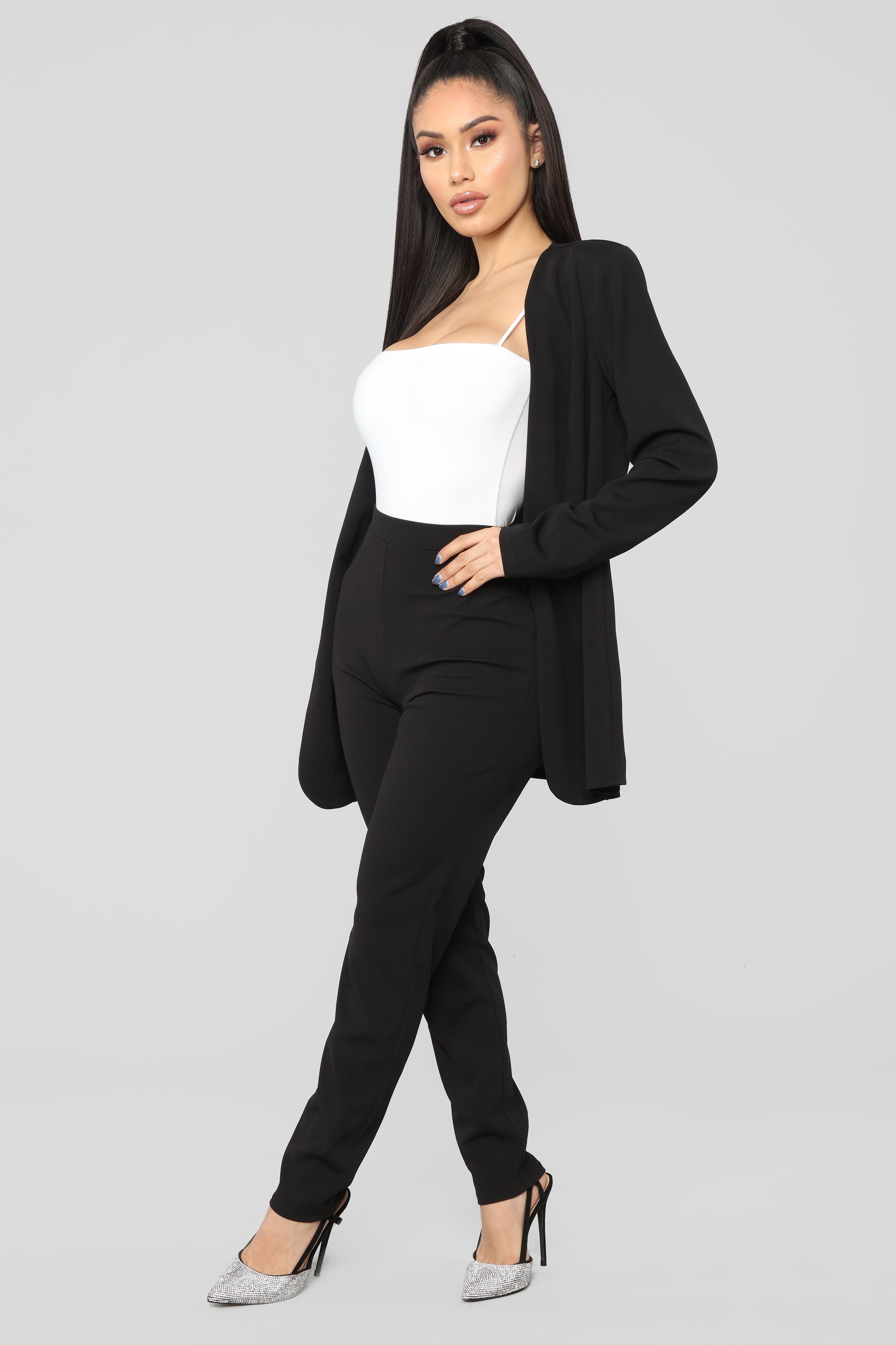 Available In Black, Mauve, Mocha, Mustard, And Mint Stretch Crepe Set Open Blazer Shoulder Pads Skinny Leg Pant High Waisted 29 Inseam Stretch 95% Polyester 5% Spandex Imported |