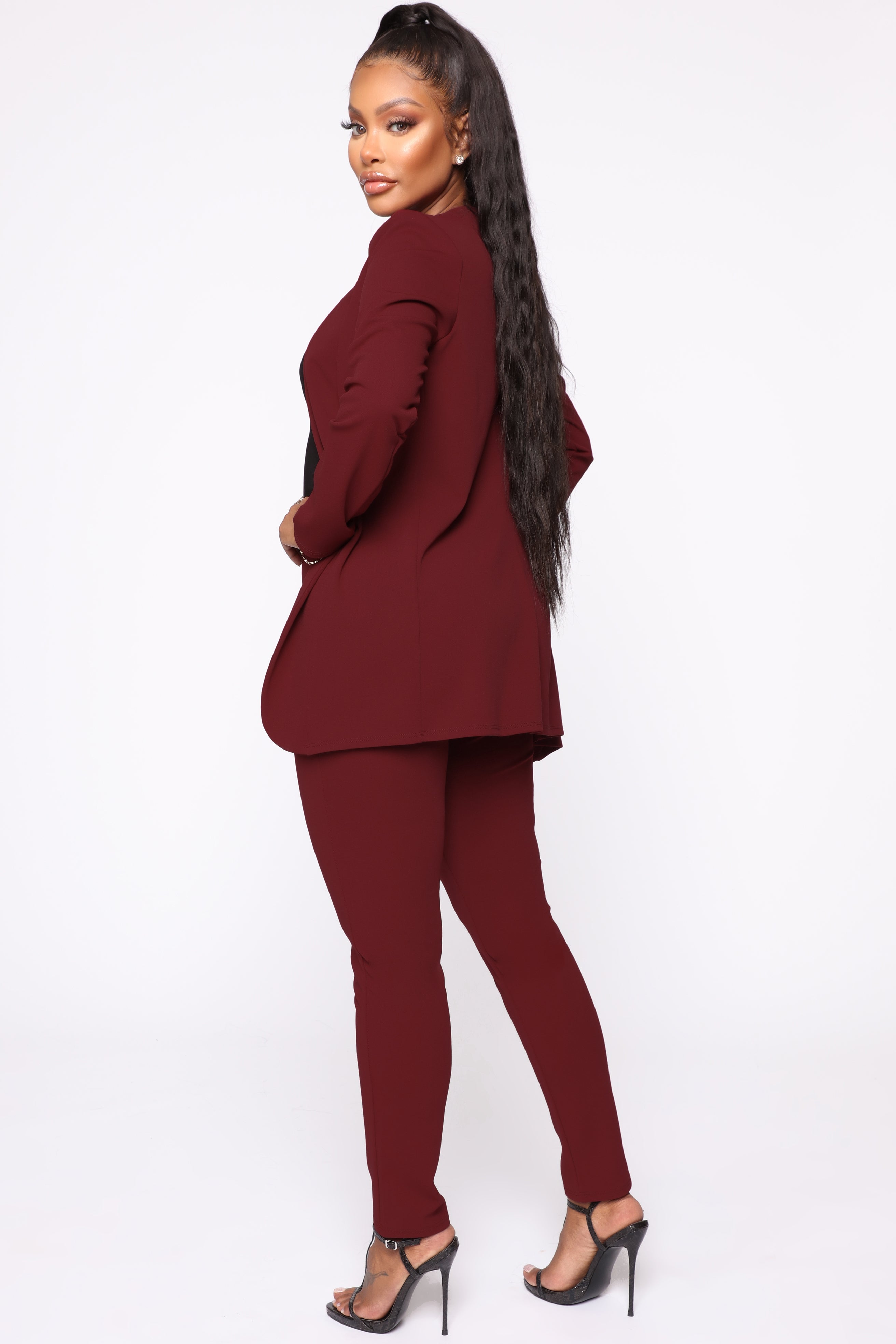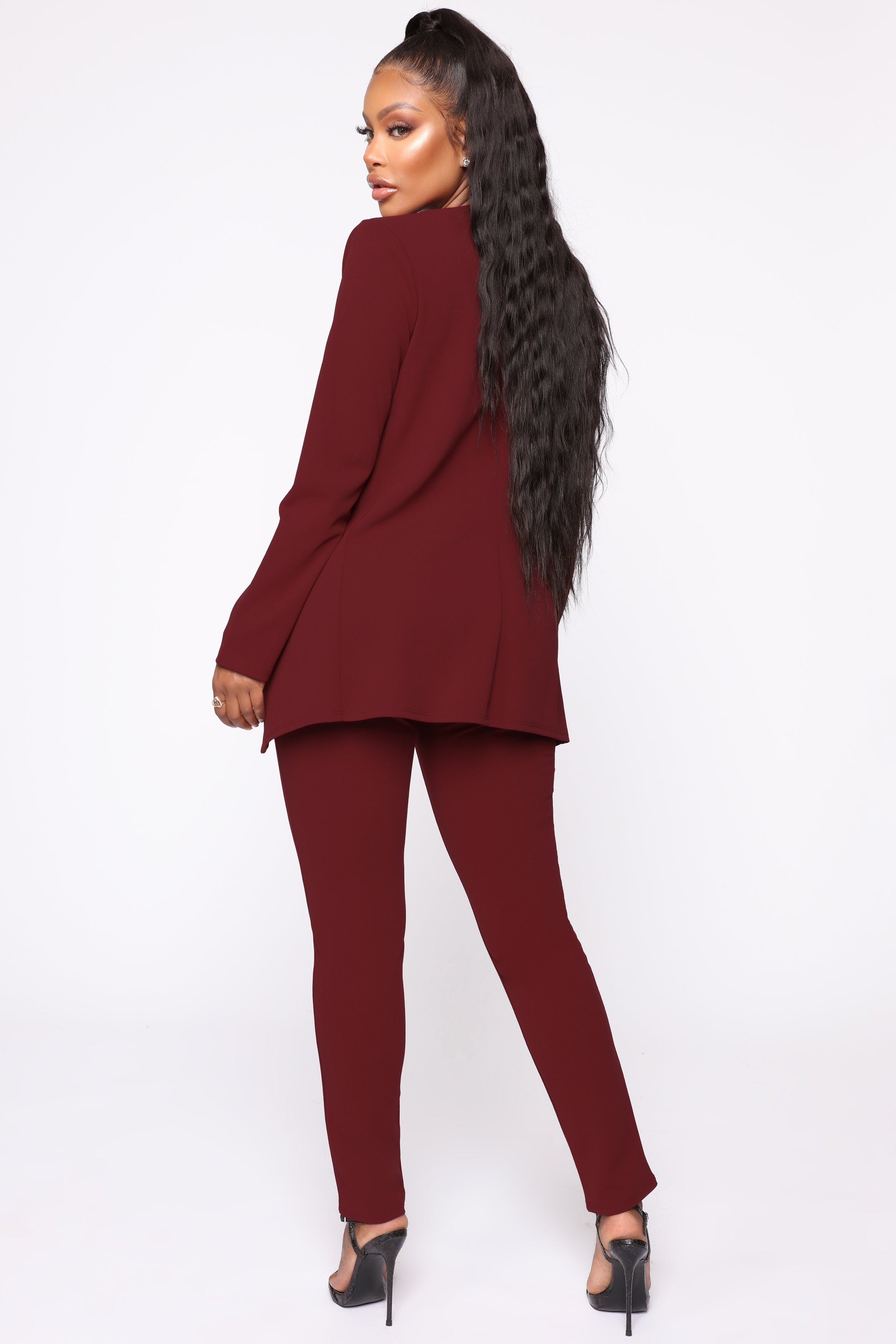 Available In Black, Mauve, Mocha, Mustard, Navy, Burgundy And Mint Stretch Crepe Set Open Blazer Shoulder Pads Skinny Leg Pant High Waist 28.5 Inseam Stretch 95% Polyester 5% Spandex Imported |