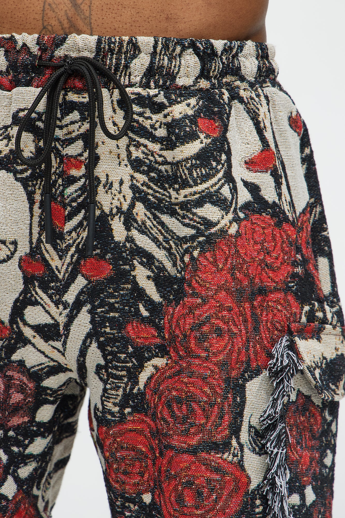 Available In Red/combo. Elastic Waist Drawstrings Side Pockets Pair With "Scheletro Tapestry Short Sleeve Button Up Shirt" Tapestry Disclaimer: Pattern Placement May Vary. Shell: 80% Polyester, 20% Cotton Imported |