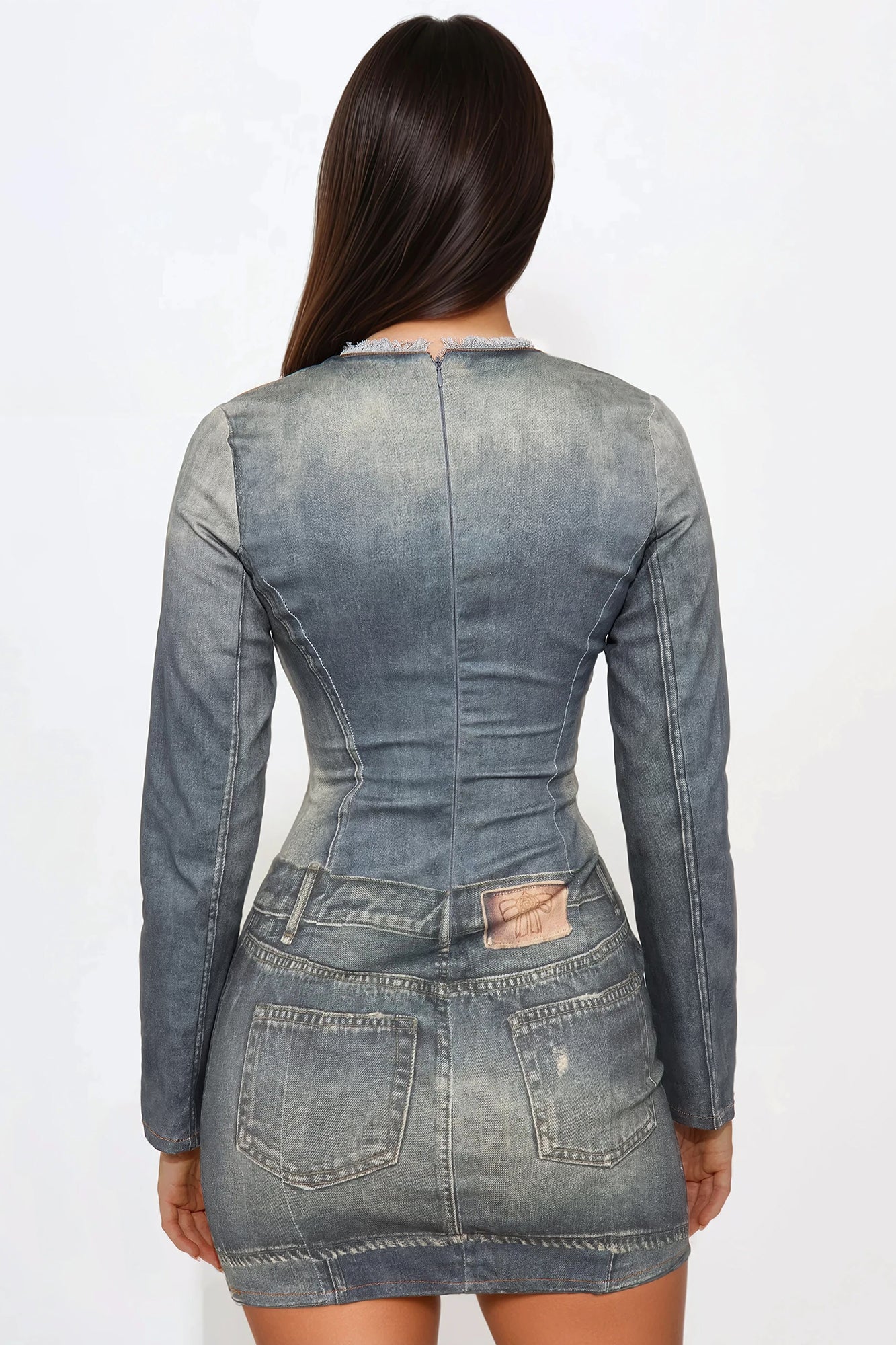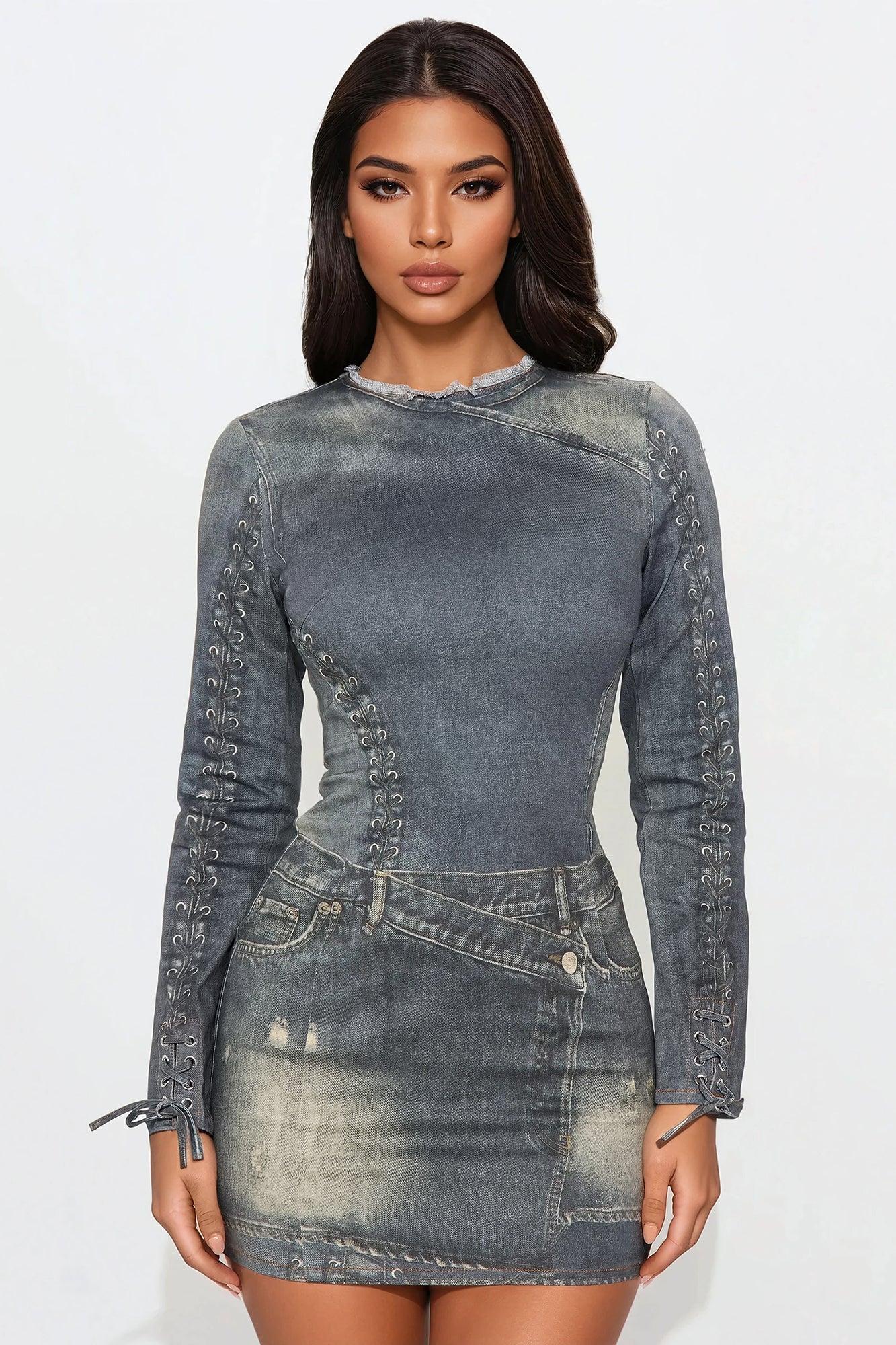 Available In Denim. Printed Denim Micro Mini Dress Distressed mock neckline Long sleeves Lace up detail Back zipper Length measured flat = 31" Disclaimer: Due To The Specialized Wash Process, Each Garment Is Unique. Self: 97% Cotton 3% Spandex Imported |