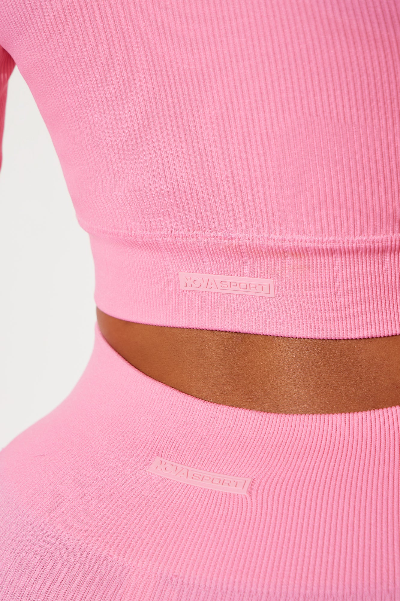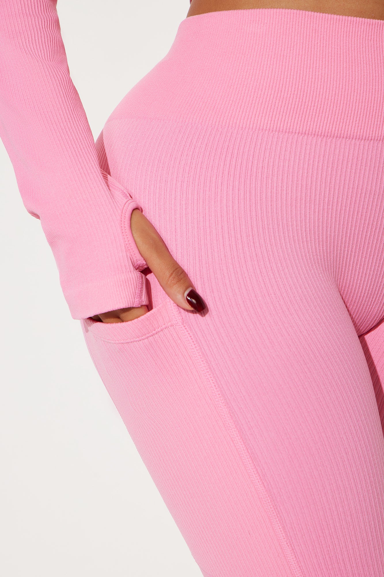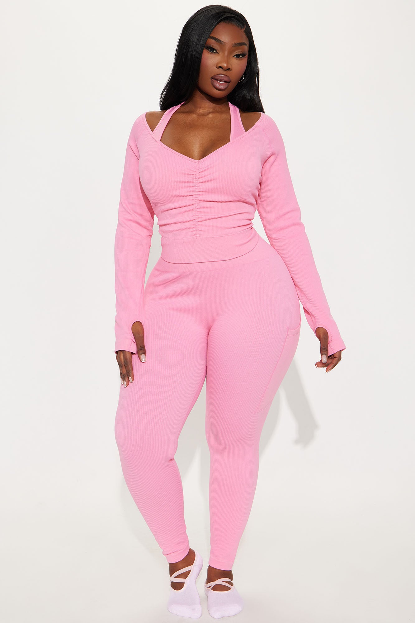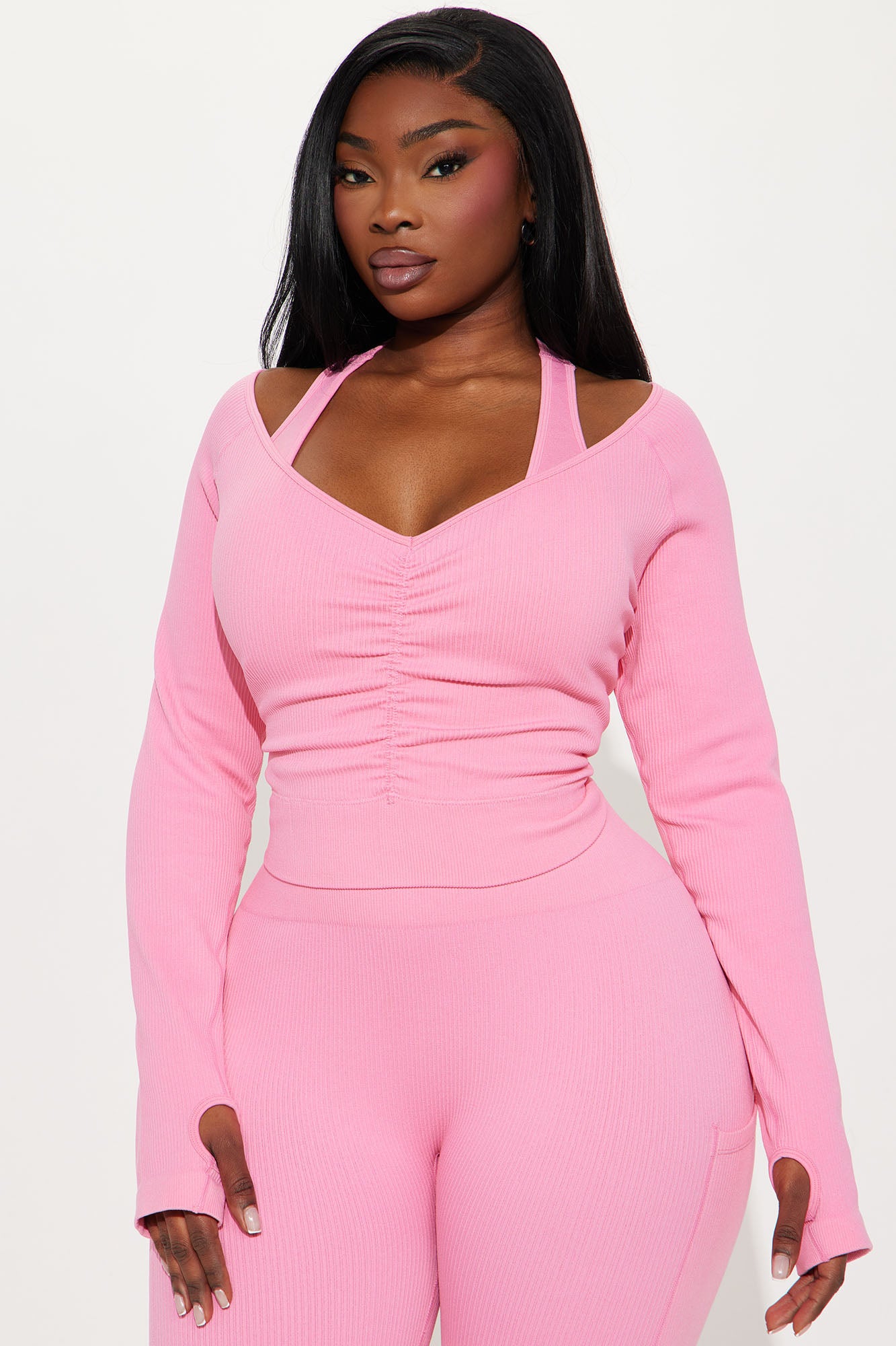 Available In Black, Bubblegum Pink, And Light Taupe. Active Set Active Top Deep V Neck Long Sleeve Thumbhole Cropped Active Legging High Waisted Effortless Seamless High Impact Stretch 92% Nylon 8% Elastane Imported |