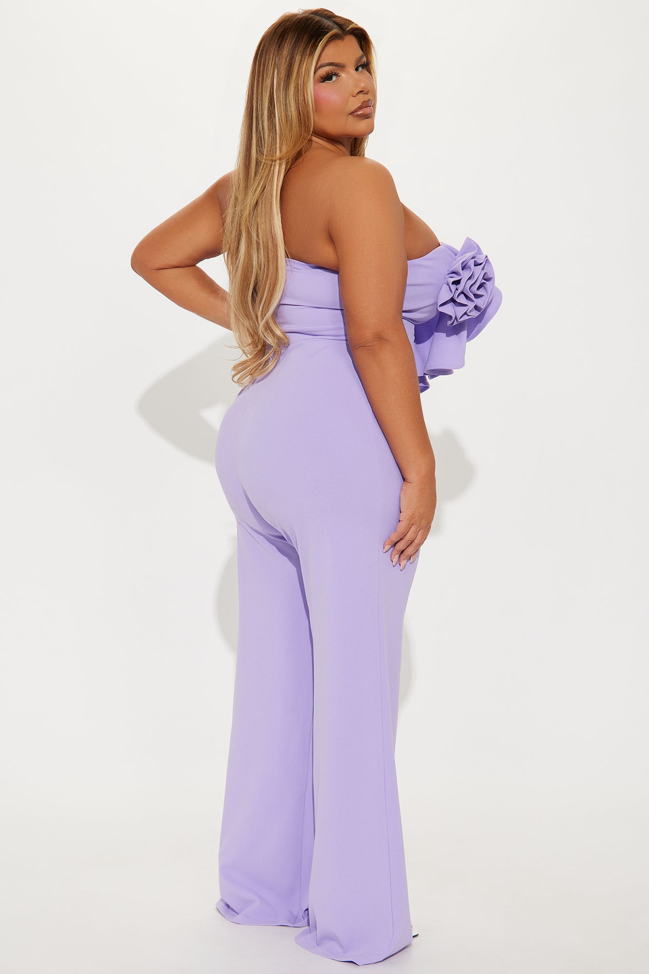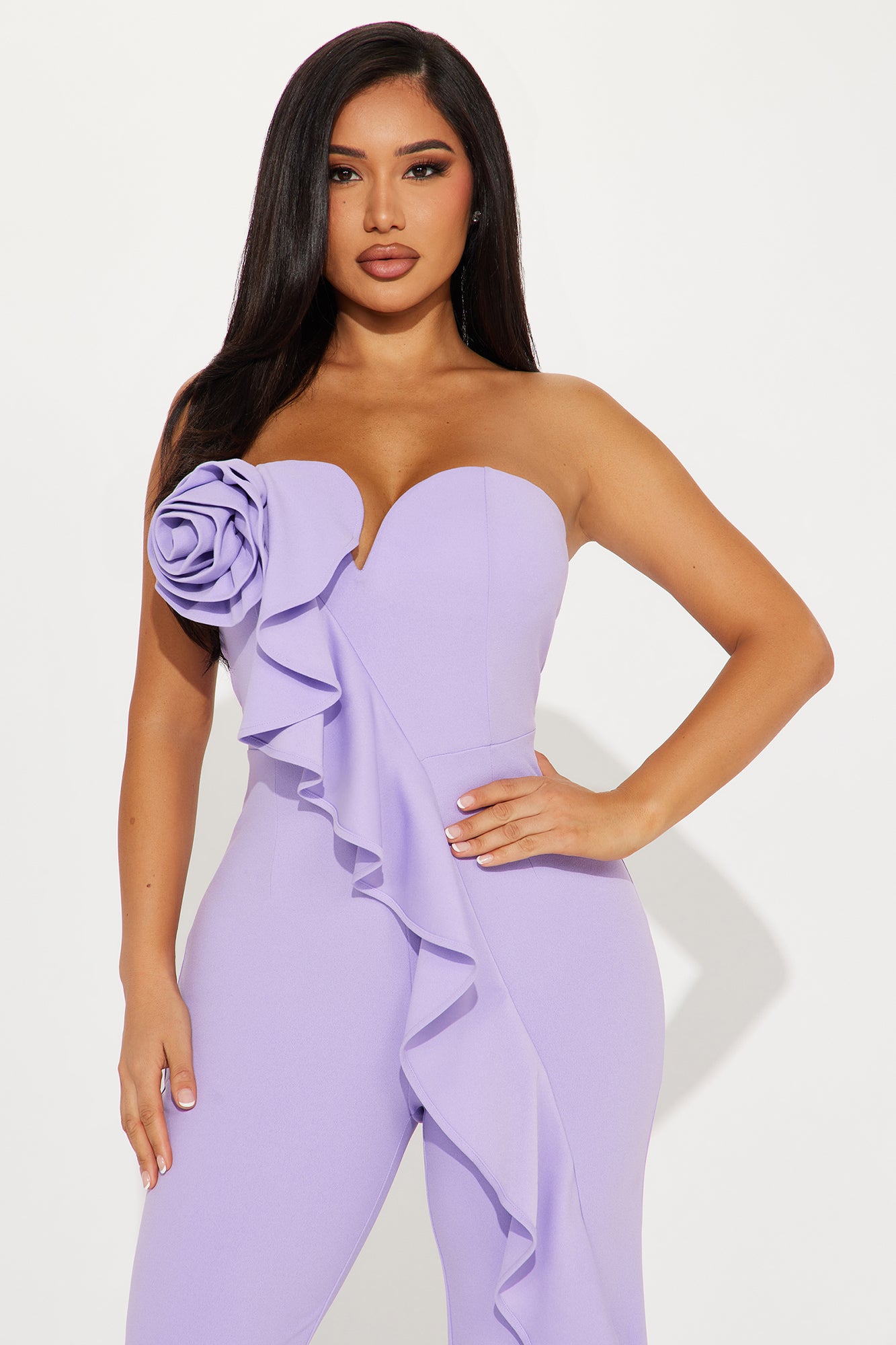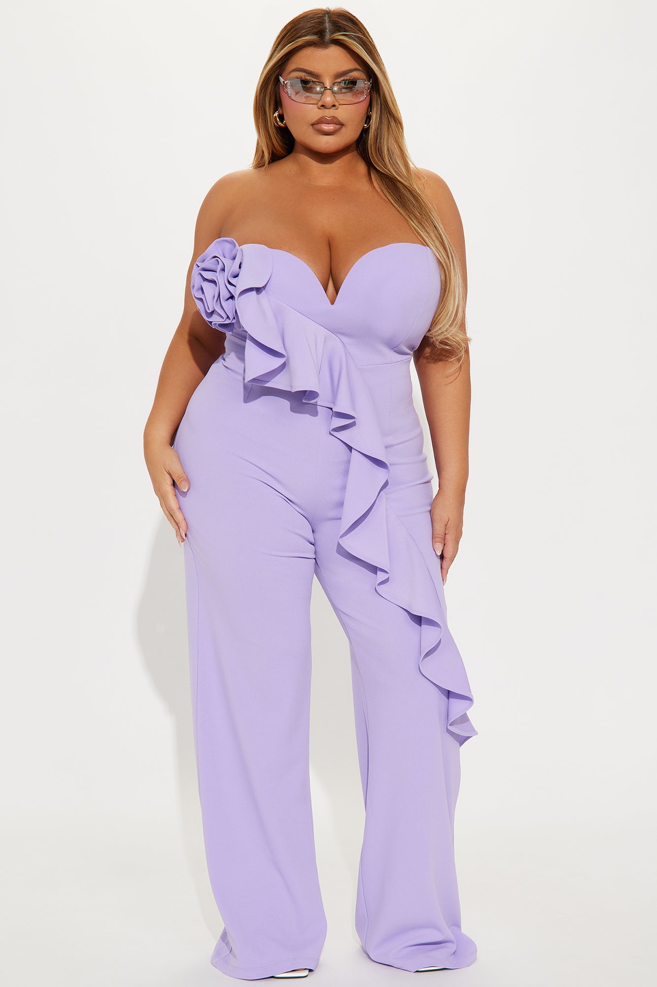 Available In Black And Lavender. Strapless Jumpsuit Sweetheart Neckline V-Wire Flower Applique Ruffle Detail Hidden Back Zipper Wide Leg Stretch Inseam=34" Self: 95% Polyester 5% Spandex Imported |