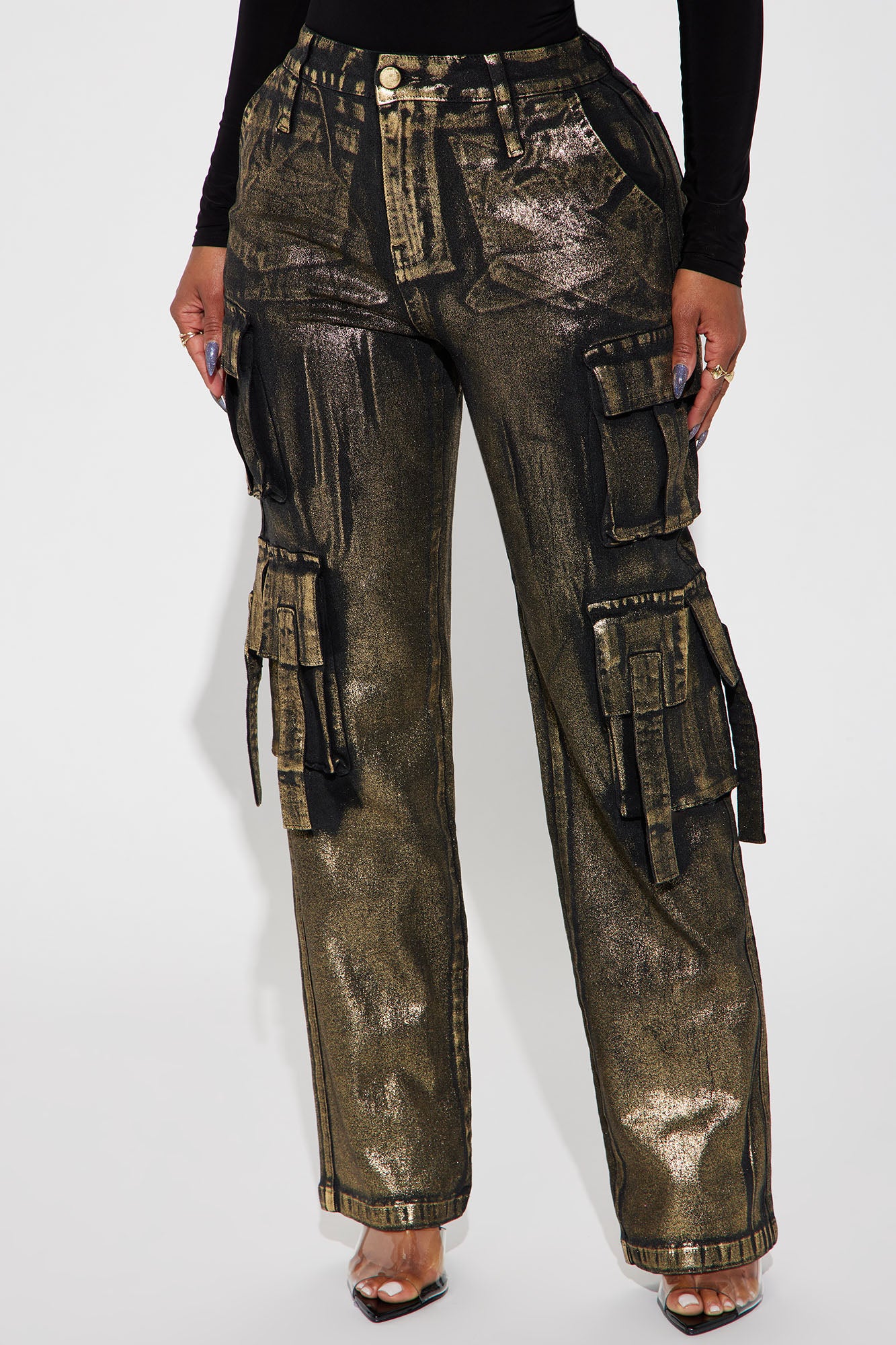 Available In Gold/combo. Cargo Pant High Rise Button & Zipper Closure Cargo Pockets Strap Detail Straight Leg Metallic Foil Stretch 47% Cotton 32% Polyester 20% Rayon 1% Spandex Imported |
