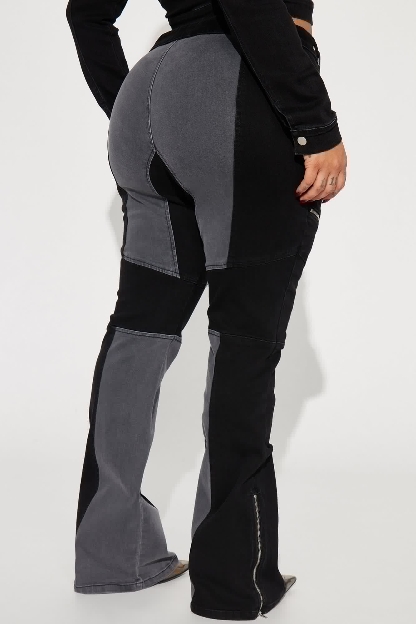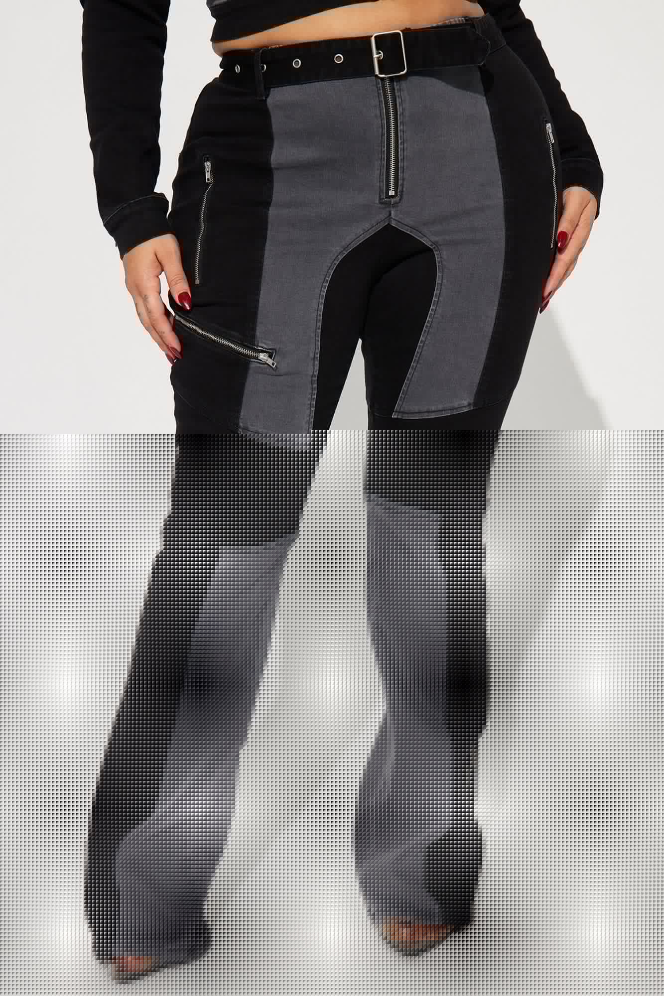Available In Black/Grey. Pair With Off To The Races Denim Moto Jacket Moto Bootcut Jean Medium Stretch Two Tone Zip Detail Adjustable Belt 34" Inseam 10" High Rise Disclaimer: Due To The Specialized Wash Process, Each Garment Is Unique. Self A: 66% Cotton 32% Polyester 2% Spandex Self B: 73% Cotton 22.5% Polyester 2.5% Viscose 2% Spandex Imported |