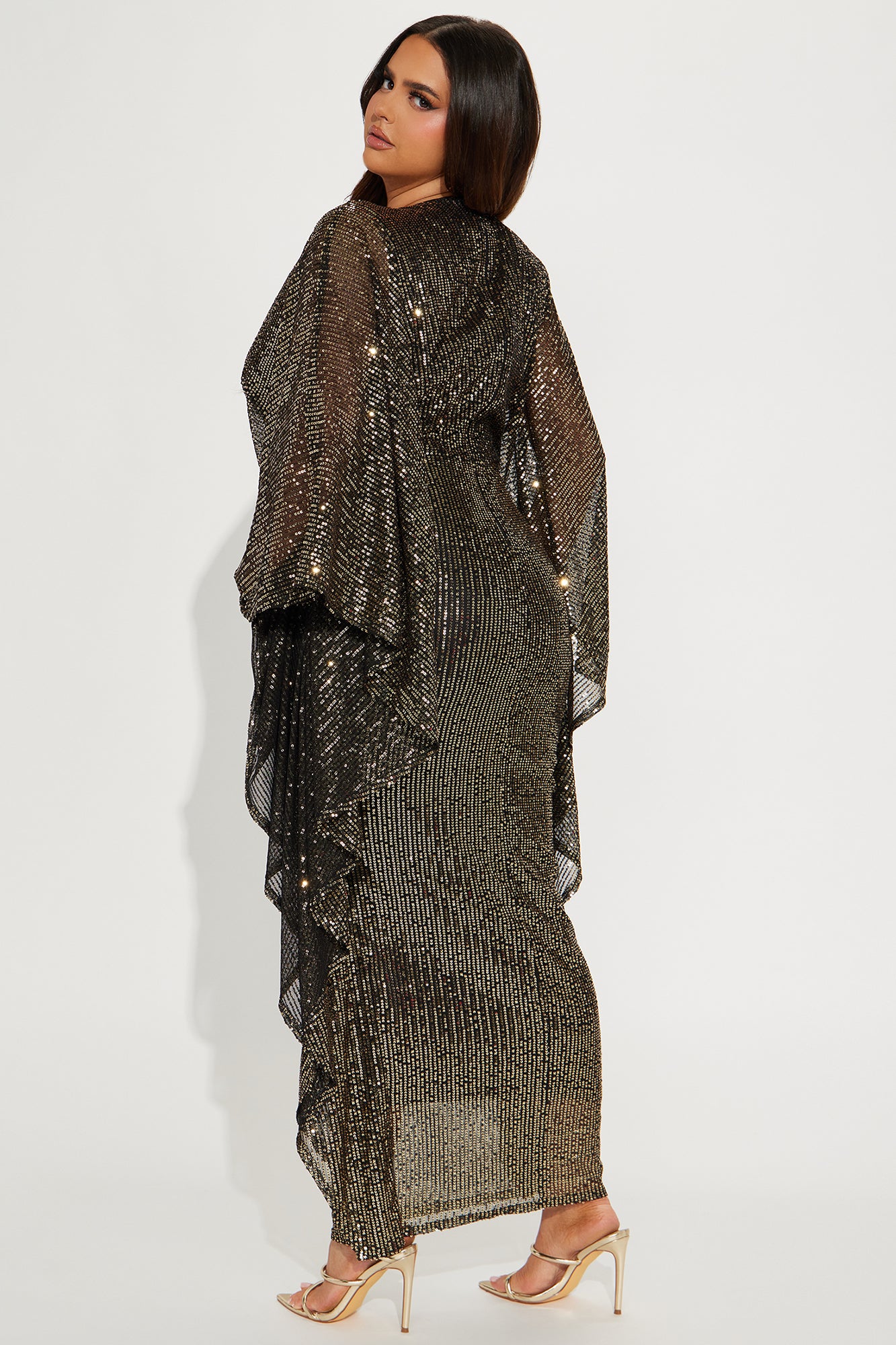 Available In Black/combo And Champagne. Sequin Maxi Dress V-Neckline Long Sleeve Draped Ruched Hidden Back Zipper Stretch Self / Lining 100% Polyester Imported |