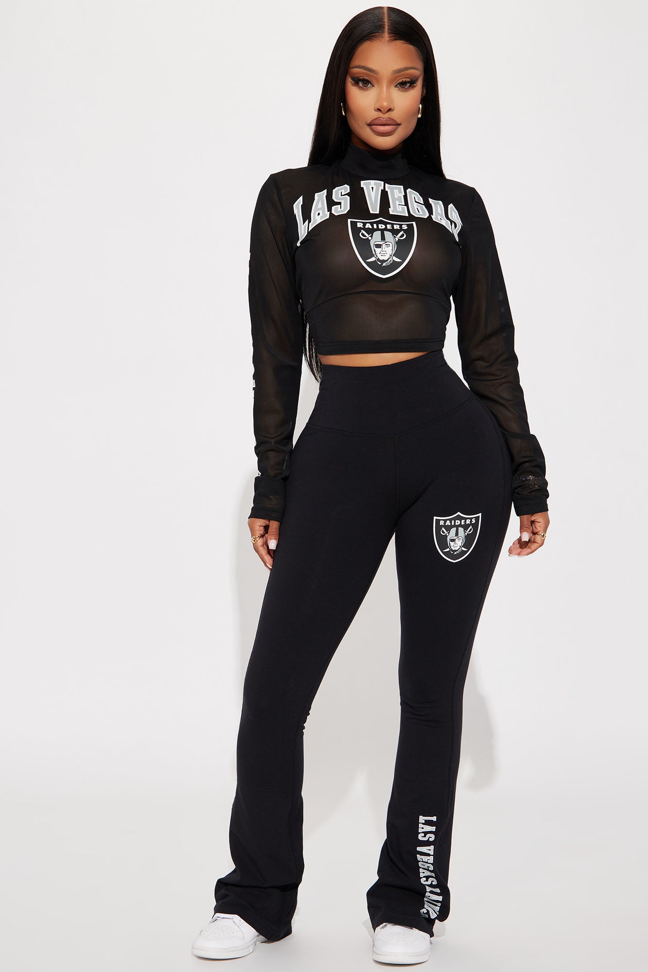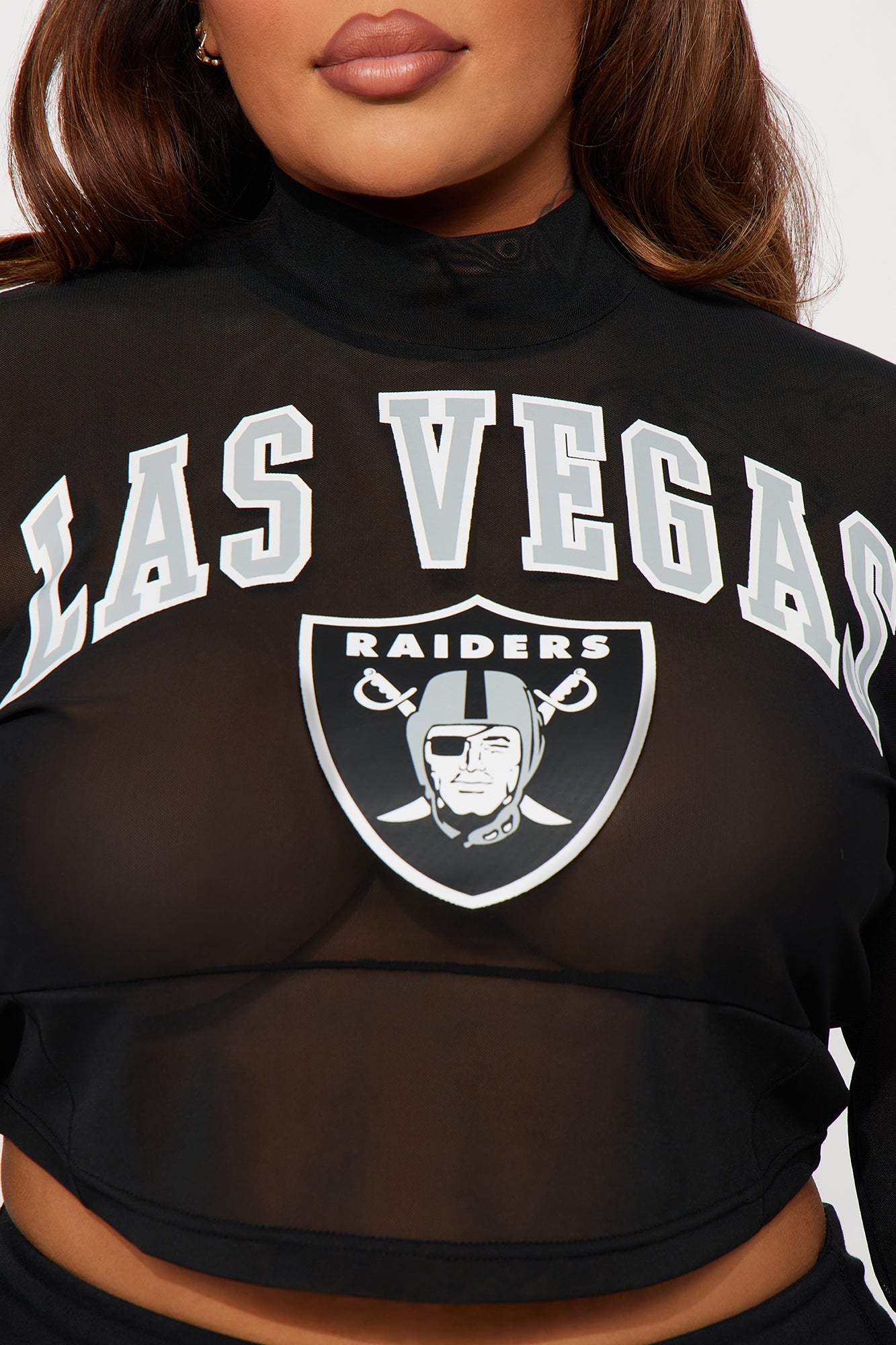 | Available In Black. Mock Neck Long Sleeve Las Vegas Raiders Graphic Front Screen Cropped Mesh Stretch Pair Back To "Las Vegas Raiders Flare Pant" Disclaimer: Due To The Printing Process A Difference In Saturation May Occur. Each Garment Is Unique. 92% Polyester 8% Spandex Imported |