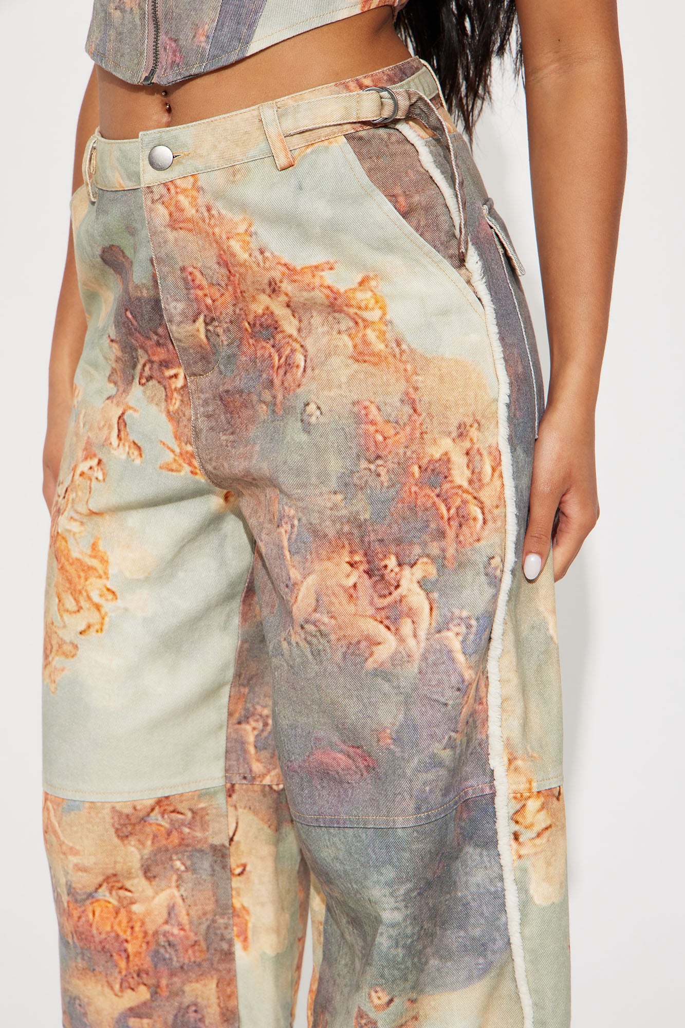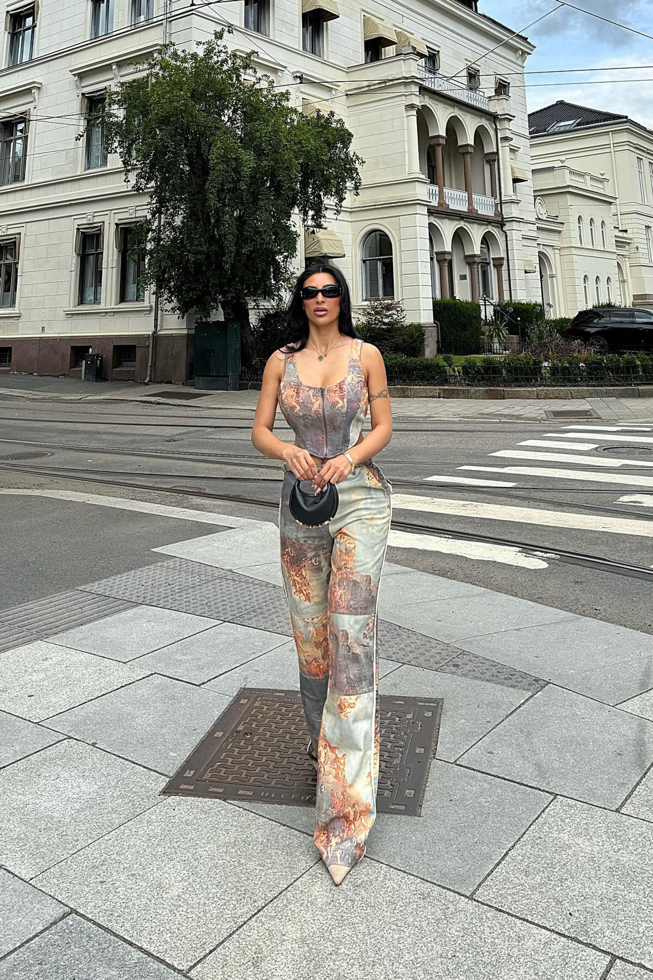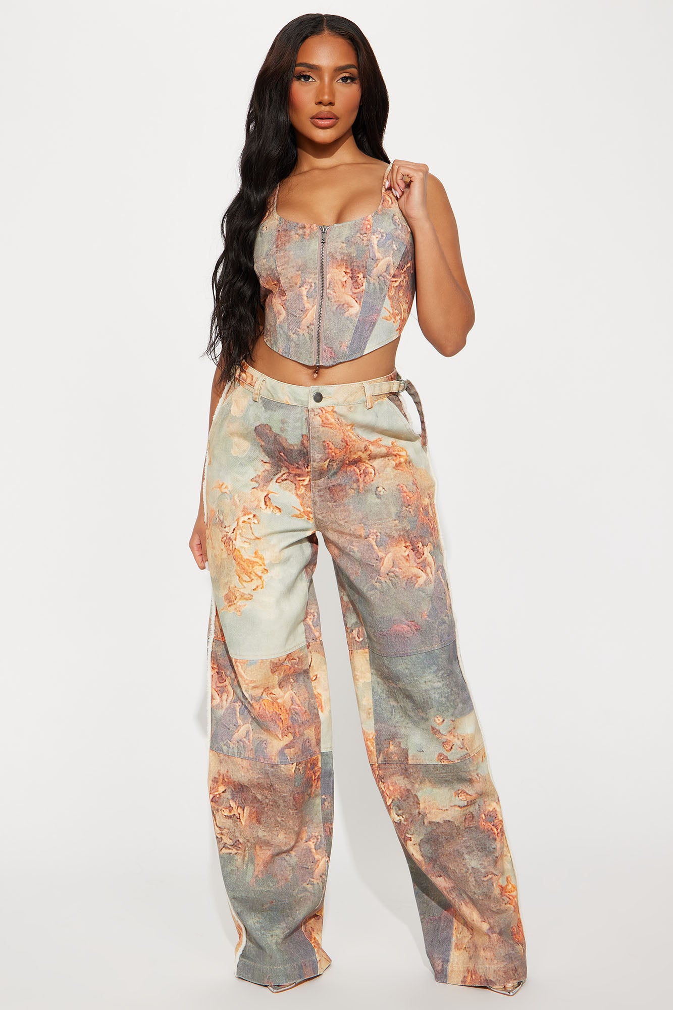 Available In Taupe/combo. Denim Pant Set Sleeveless Corset Hook And Eye Closure Wide Leg Pant Button And Zipper Closure Belt Loops Pockets Non-Stretch Inseam: 31" Disclaimer: Due To The Specialized Wash, Distressing And Printing Process, Each Garment Is Unique. Top/Bottom: Shell: 100% Cotton Top: Lining: 100% Polyester Imported |