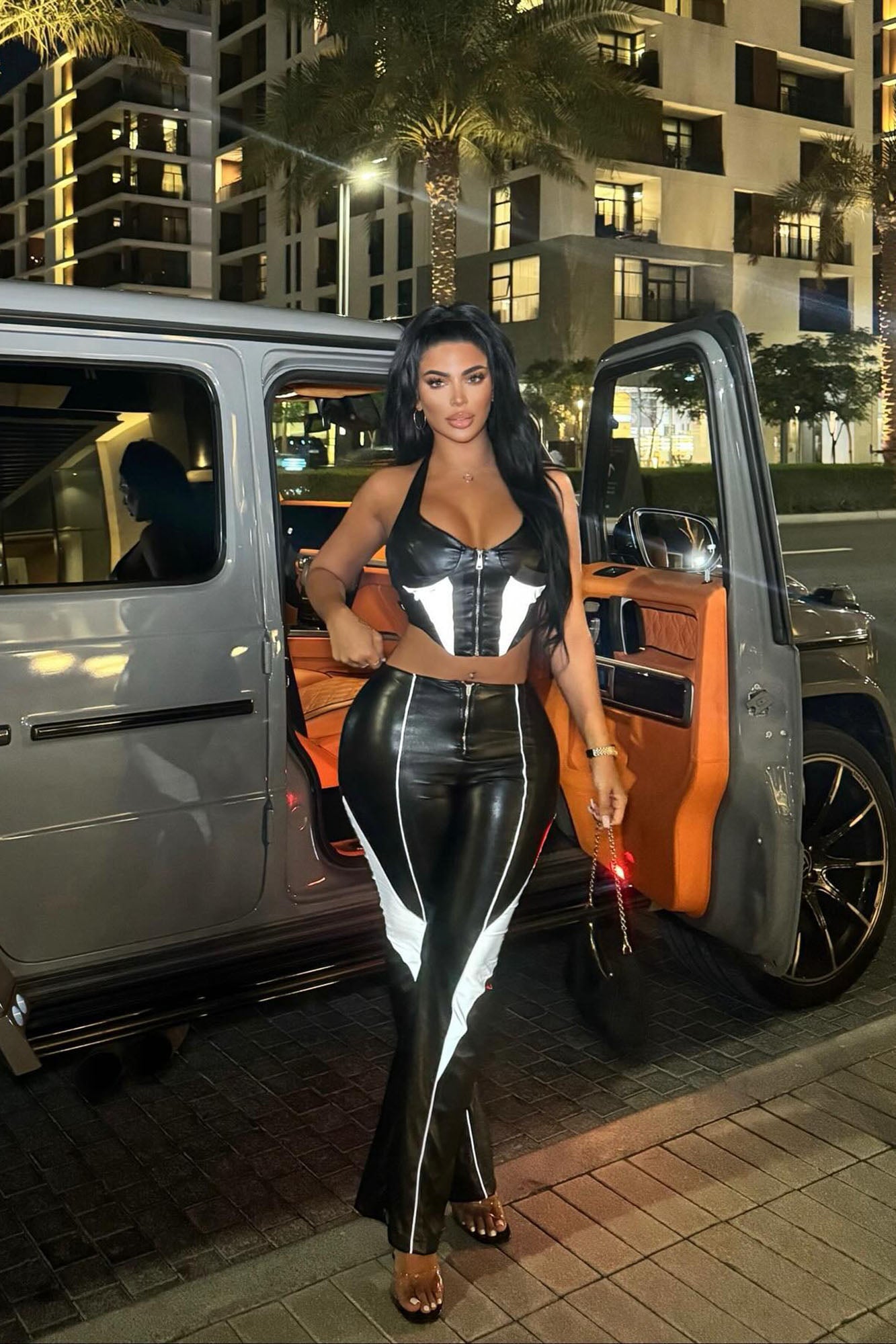 Available In Black. Faux Leather Pant Set Halter Front Zipper Closure Reflective Detail Wide Leg Pant Non-Stretch Inseam: 31" Coating 100% Polyurethane Backing 100% Polyester Lining 94% Polyester 6% Spandex Imported |