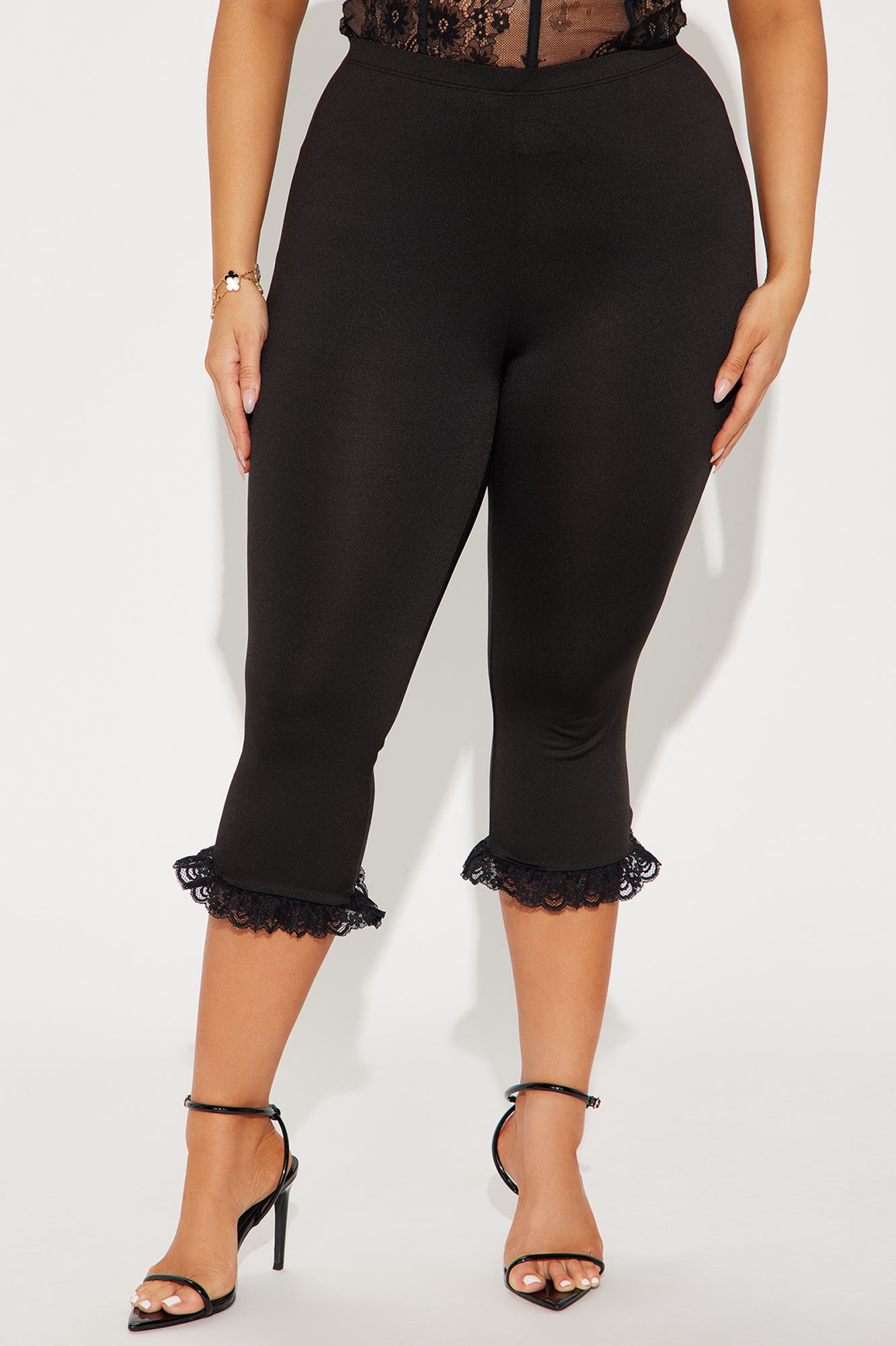Available In Black. Capri Legging Mid Rise Elastic Waistband Ruffle Lace Trim Stretch 80% Polyester 20% Spandex Imported |