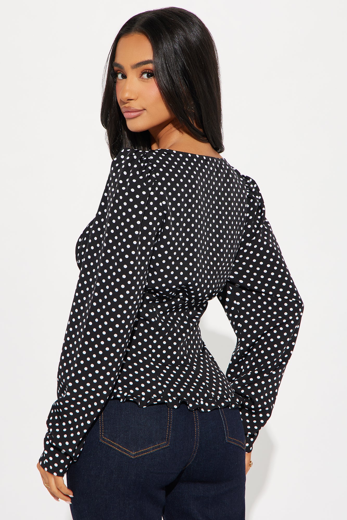 Available In Black/White And White/Black. Polka Dot Puff Sleeve Top Long Sleeve Non Stretch Invisible Zipper Self 100% Polyester Imported |