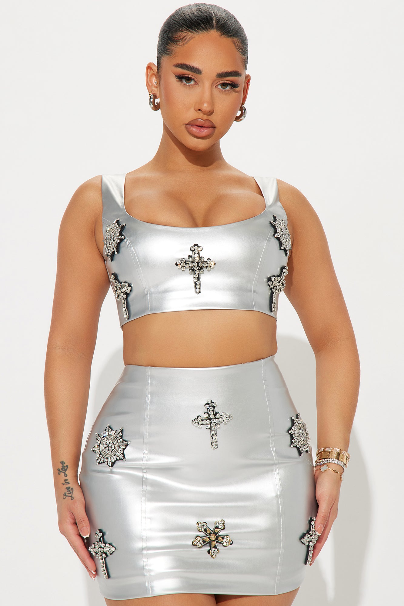Available In Silver And Black. Metallic Skirt Set Scoop Neck Sleeveless Cropped Mini Skirt Rhinestone Applique Fully Lined Back Zipper Stretch Self 50% Polyurethane 50% Polyester Lining 100% Polyester Imported |