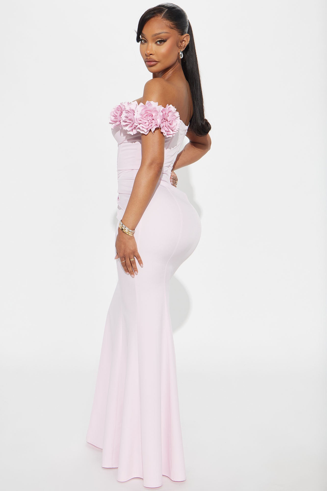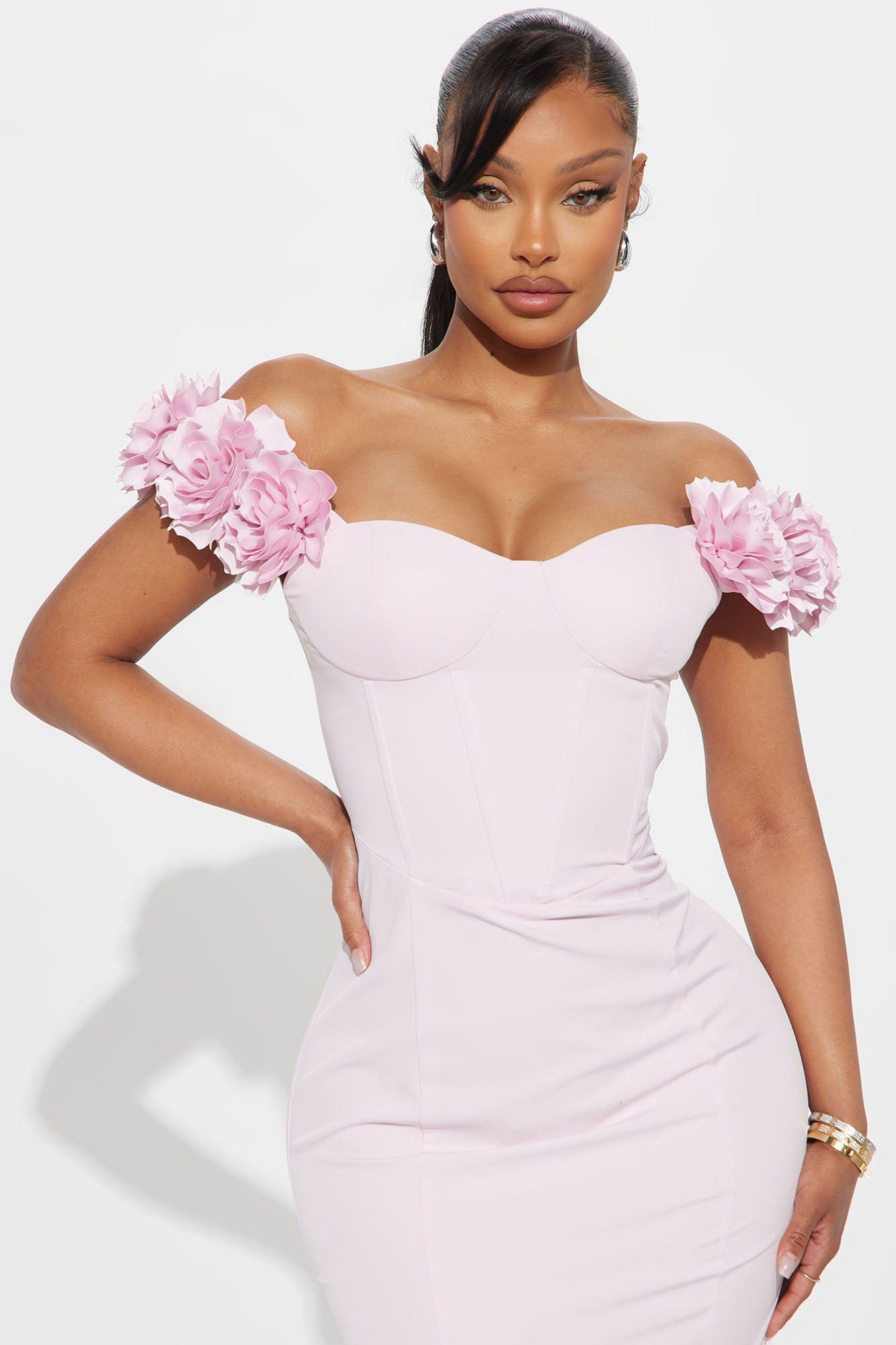 Available In Blush. Maxi Dress Off Shoulder Flower Applique Sweetheart Neckline Padded Bra Cups Corset Waist Hidden Back Zipper Lined Self 96% Polyester 4% Spandex Lining 100% Polyester Imported |