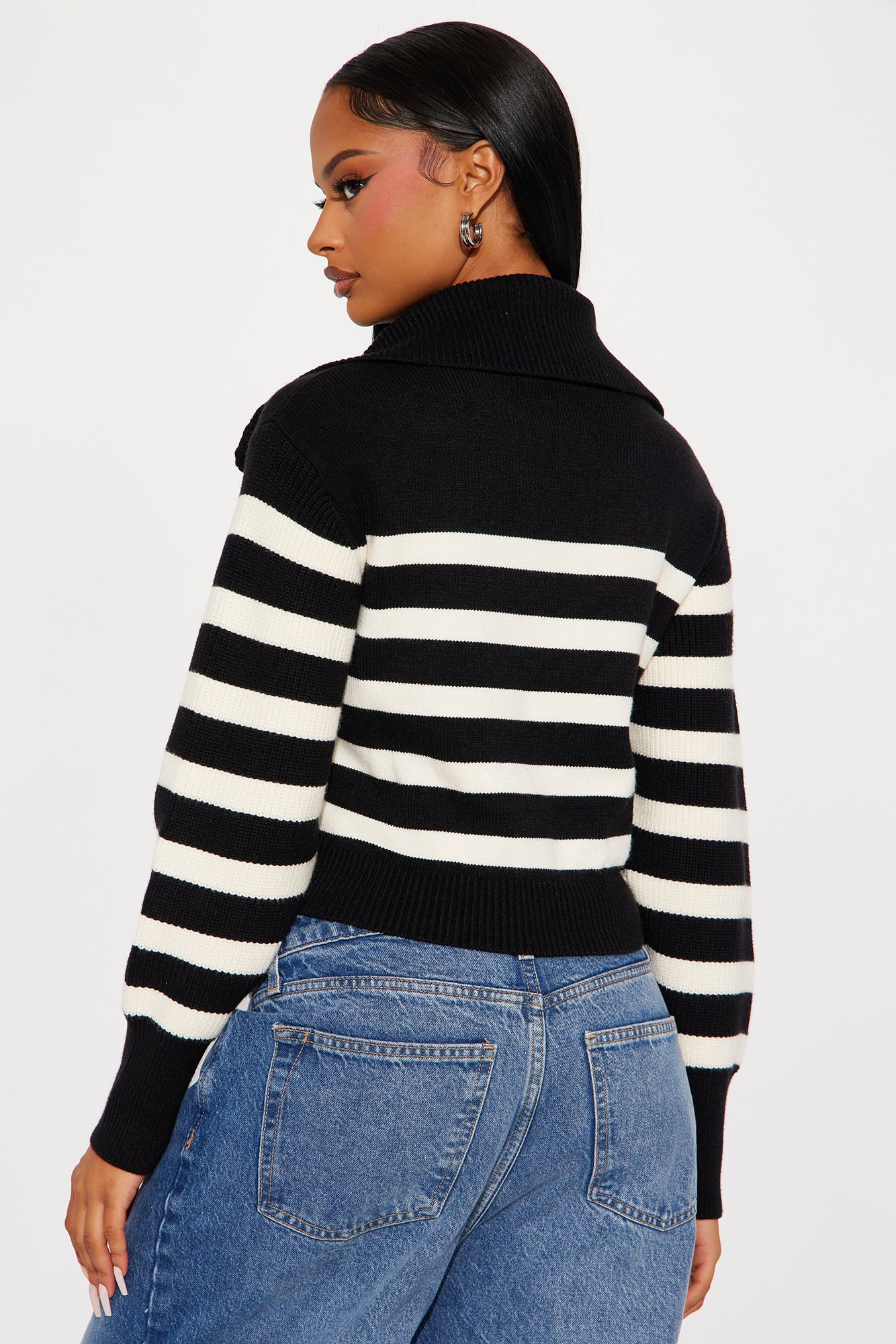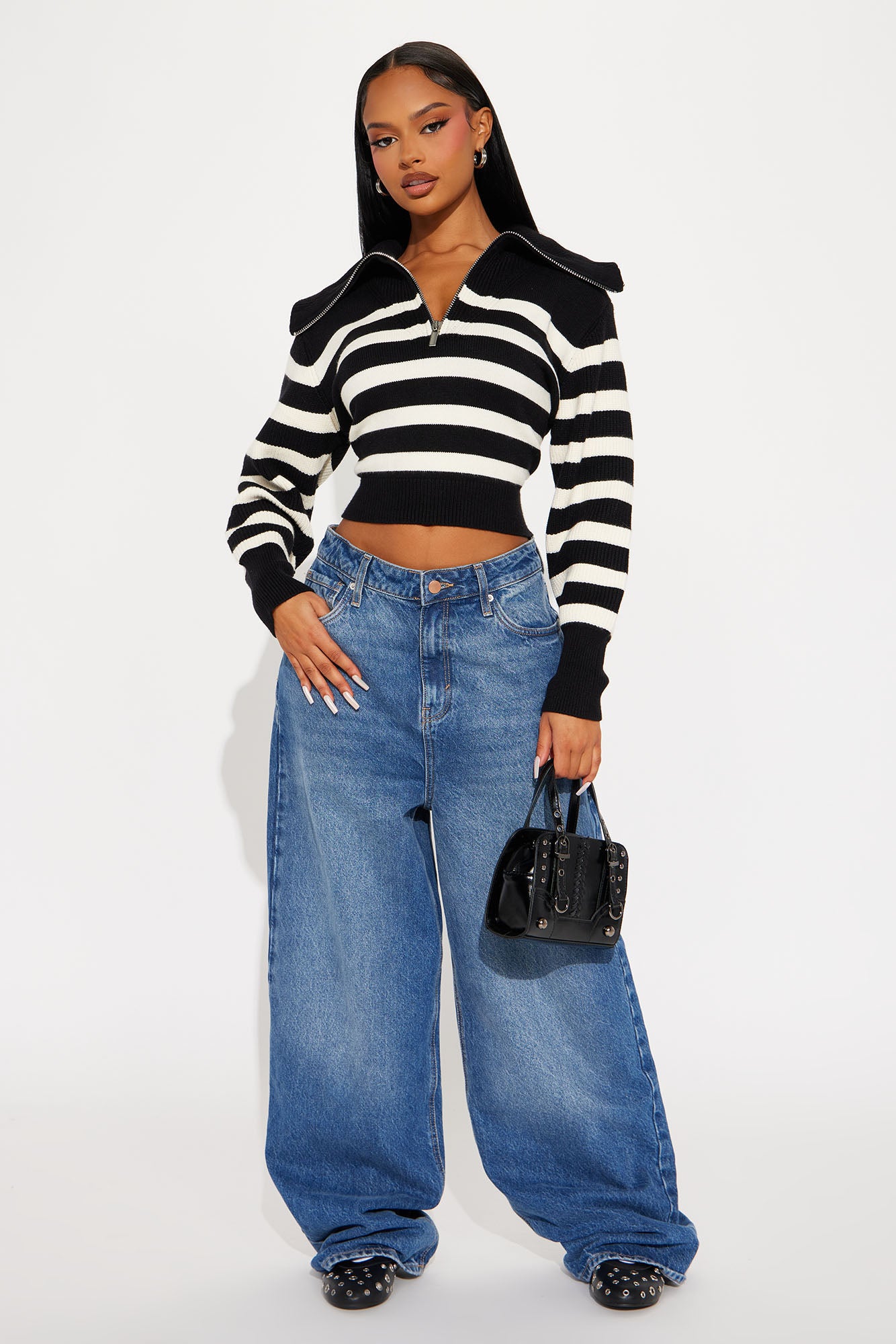 Available In Black/White. Striped Pullover Sweater Long Sleeve Balloon Sleeve Collar Quarter Zipper Ribbed Hem Self: 50% Rayon 28% Polyester 22% Nylon Imported |