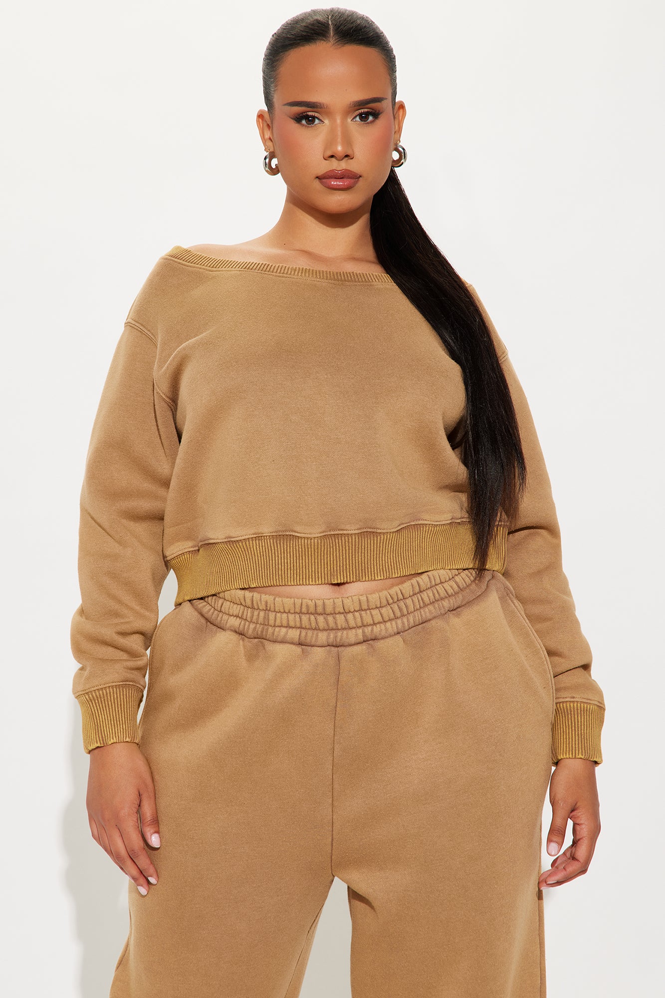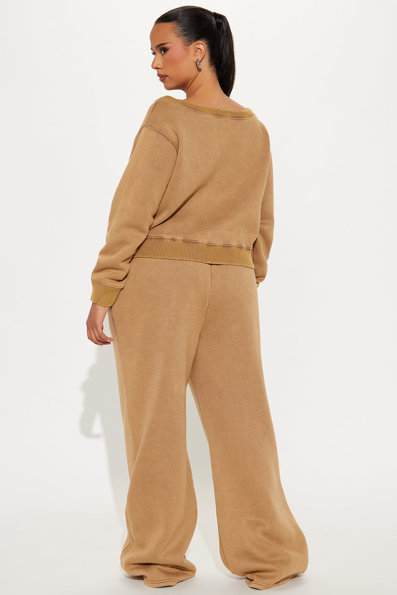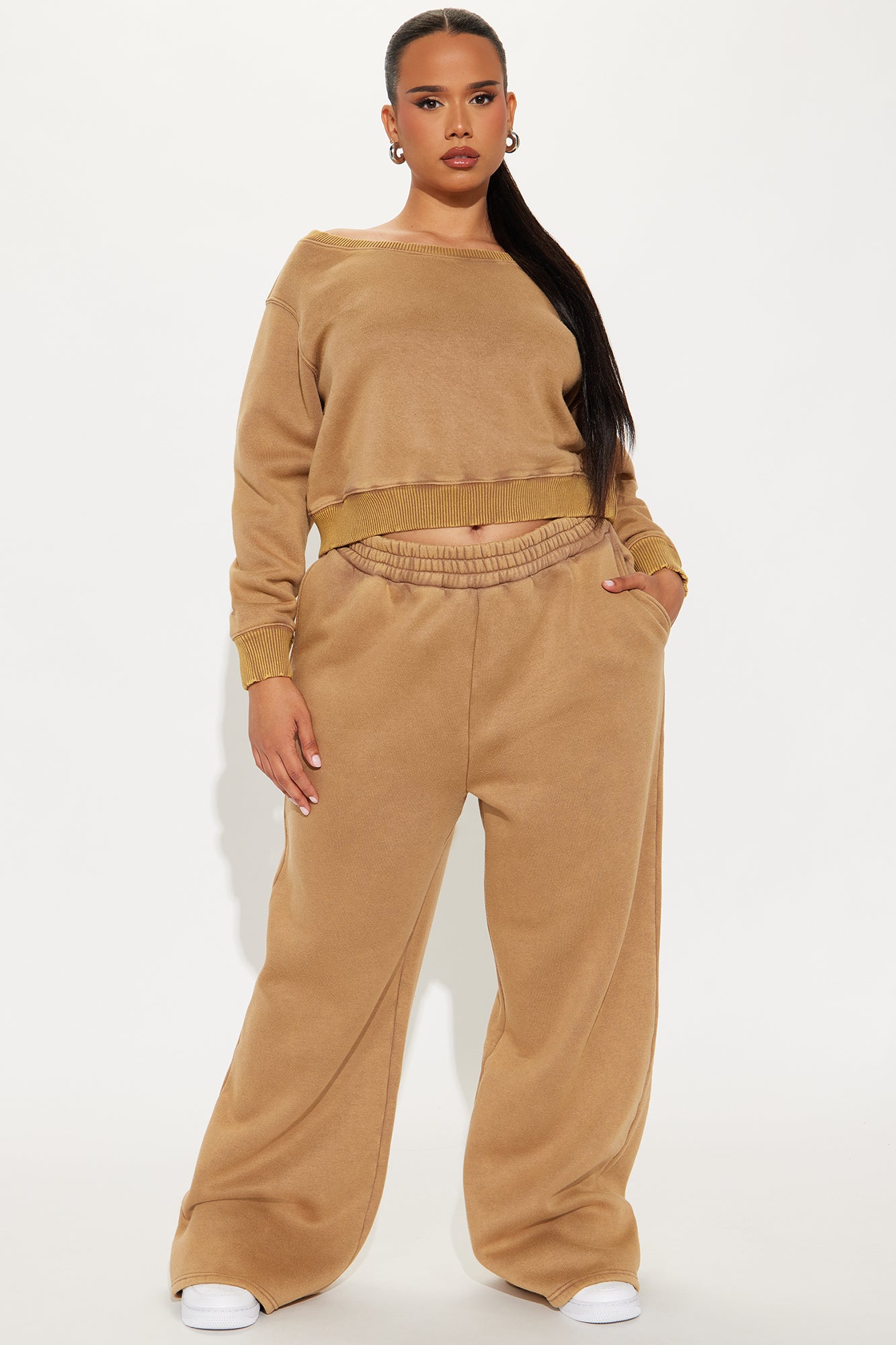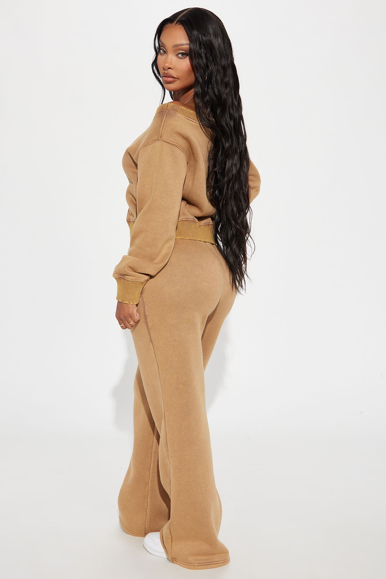 Available In Black, Sage, And Brown. Pant Set Washed Fleece Cropped High Neck Wide Leg Pant Elastic Waistband Stretch Self: 65% Polyester 35% Cotton Contrast: 65% Cotton 30% Polyester 5% Spandex Imported |