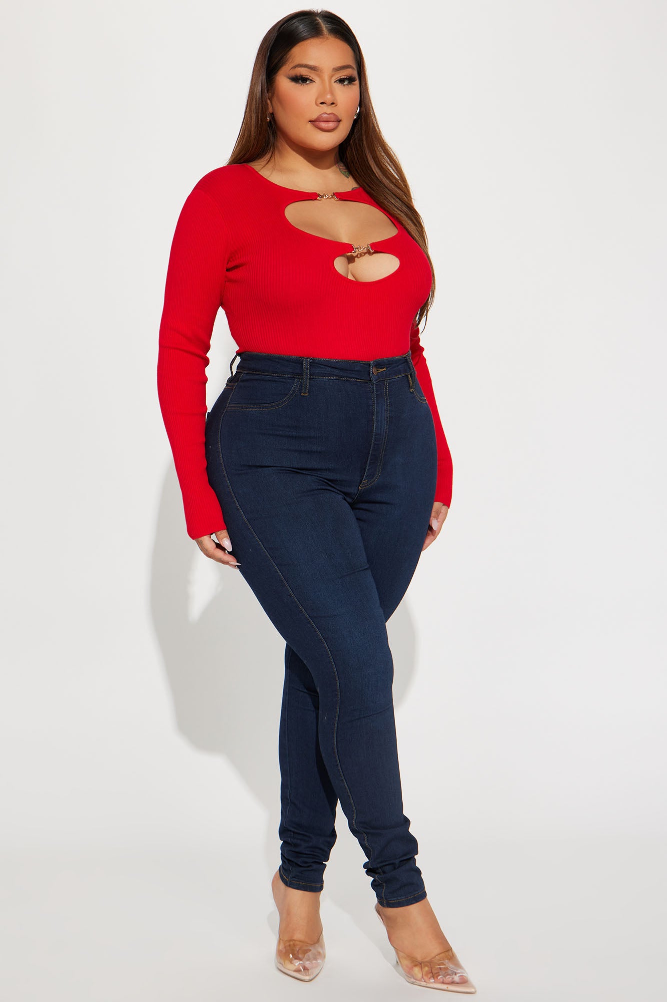 | Available In Red And Black. Bodysuit Crew Neck Long Sleeve Hardware Detail Cut Out Detail Thong Bottom Snap Button Closure Ribbed Stretch Final Sale 80% Viscose 20% Polyester Imported |