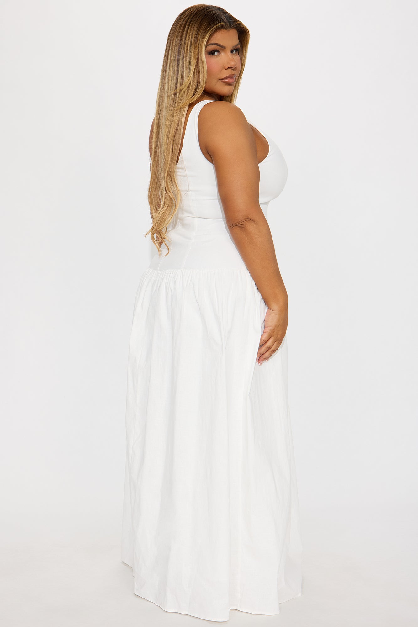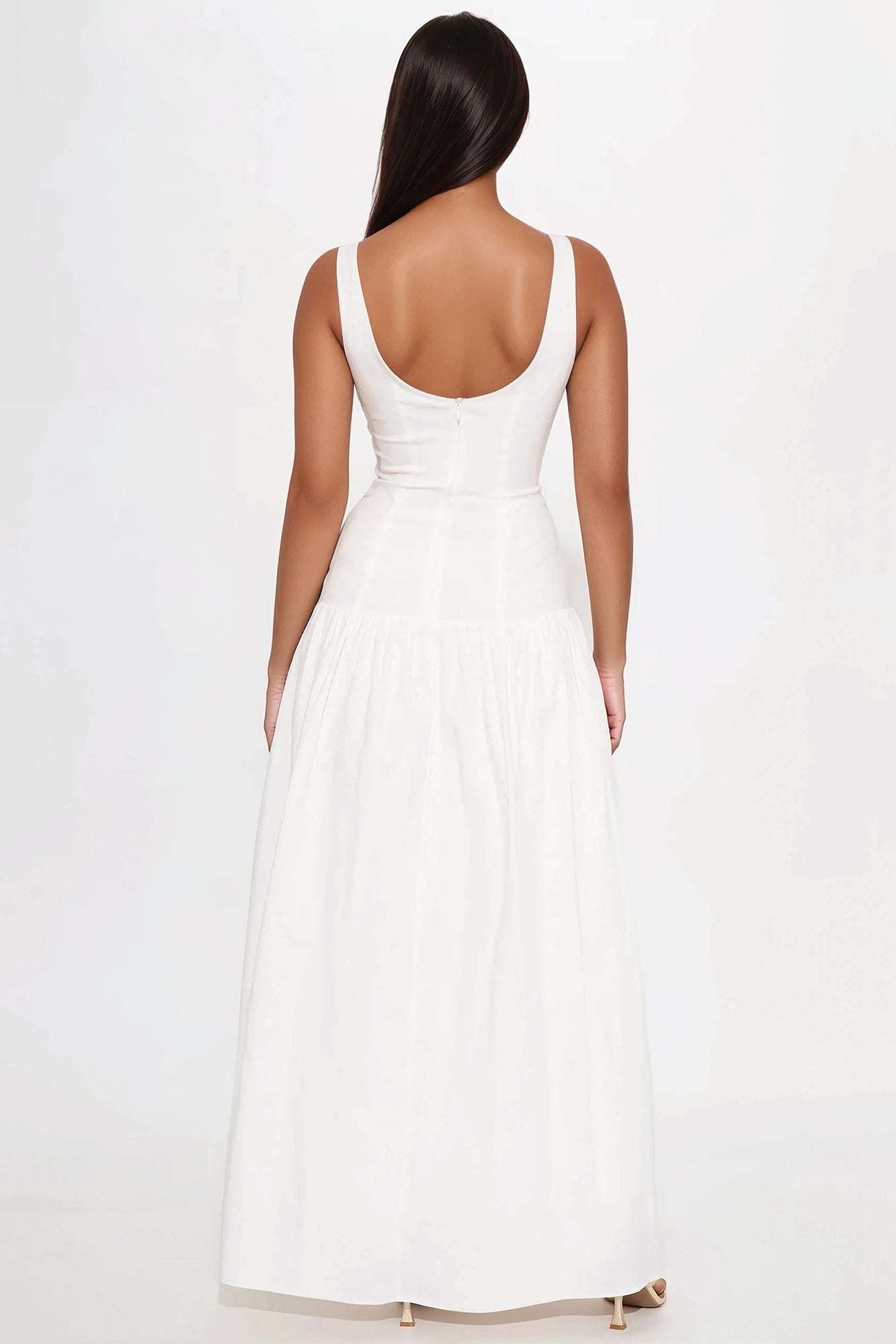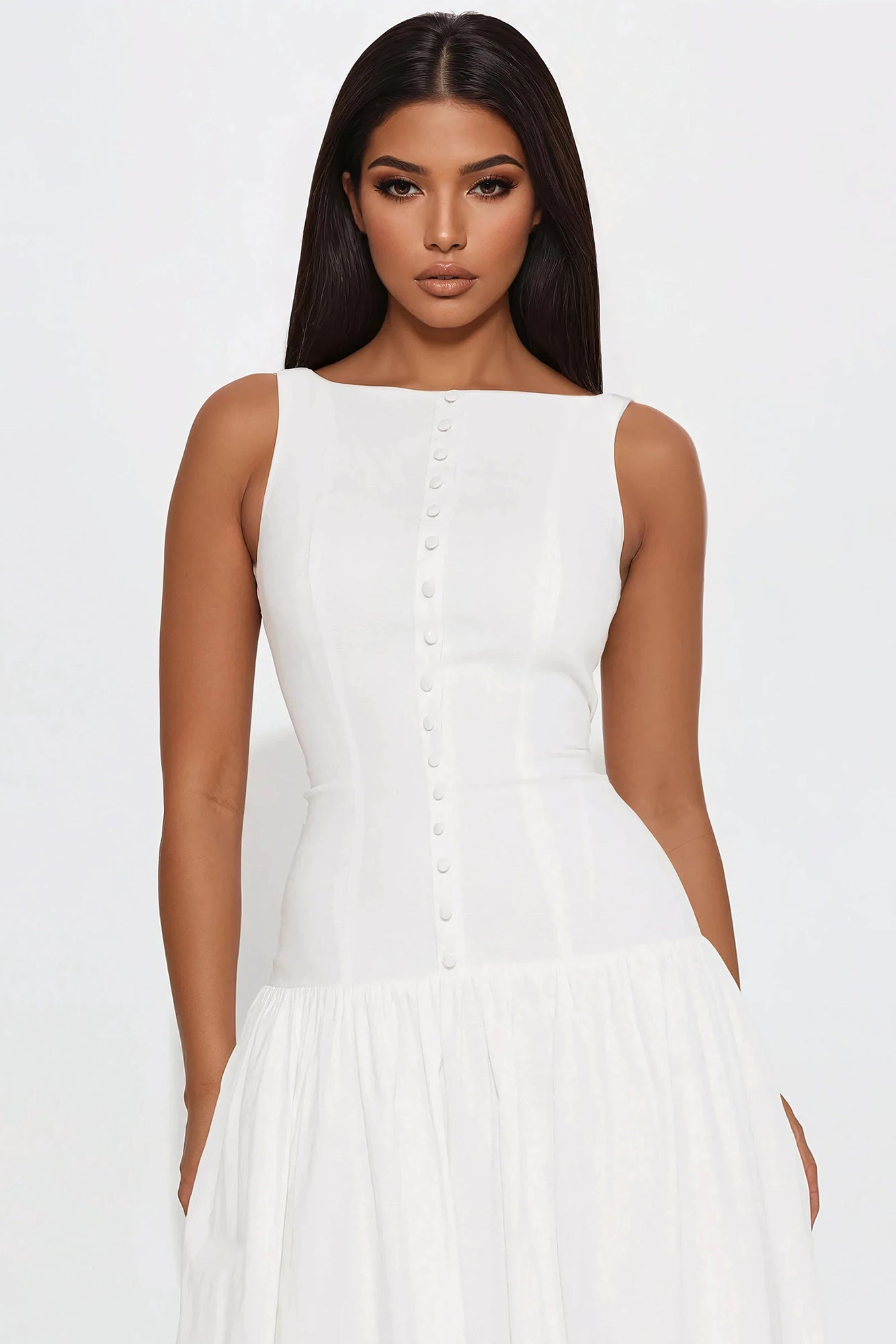 Available In White And Light Blue. Linen Maxi Dress High Neckline Button Up Front Low Back Hidden Back Zipper Drop Waist Lined Stretch Shell: 97% Cotton 3% Spandex Lining: 100% Polyester Imported |