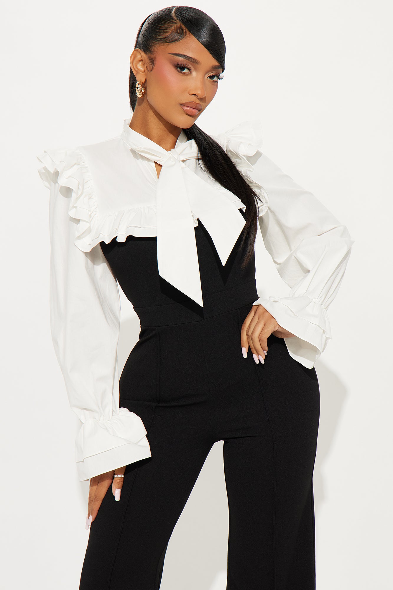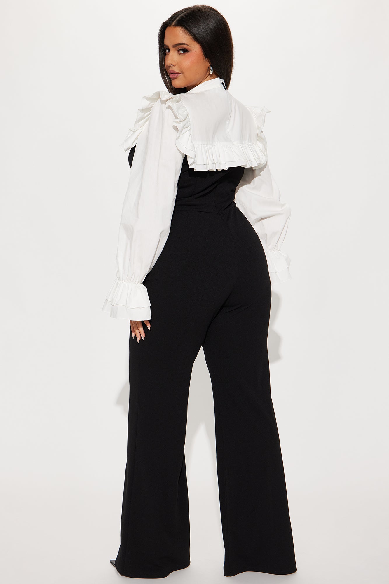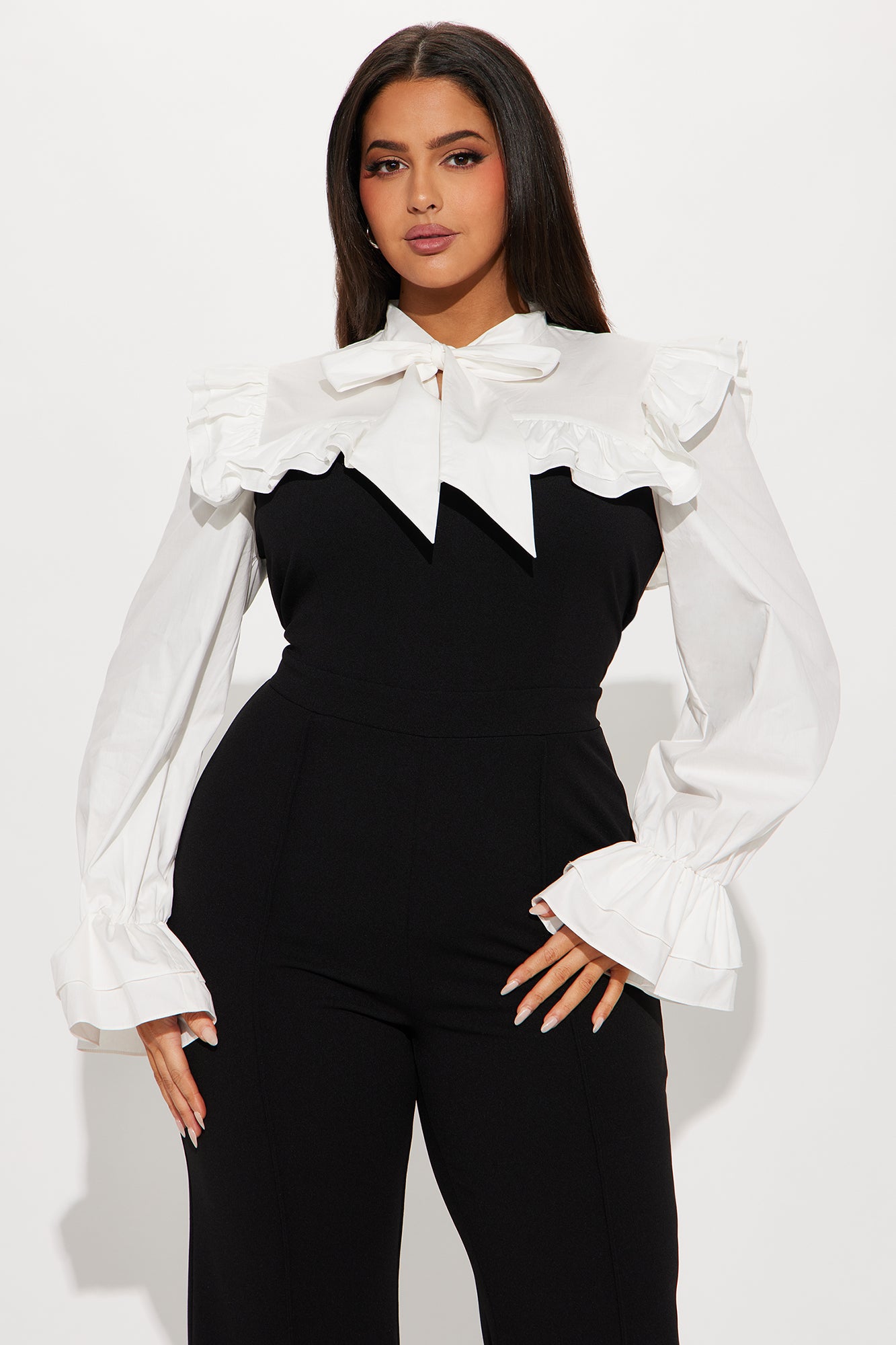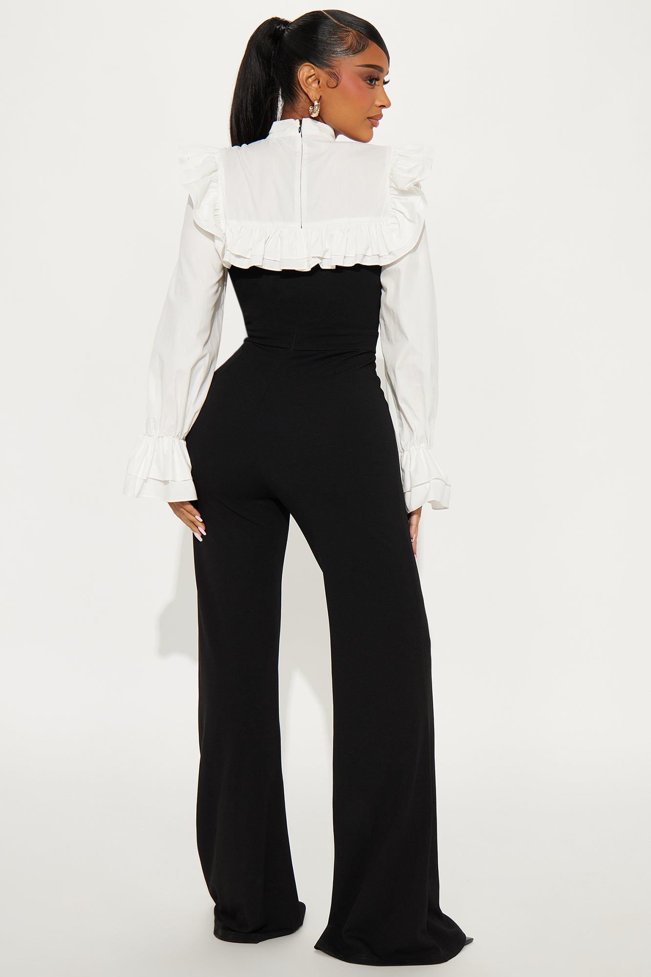 Available In Black. Jumpsuit Long Sleeve Ruffle Detail High Neck with Tie Back Zipper Stretch Self: 95% Polyester 5% Spandex Contrast: 100% Cotton Imported |