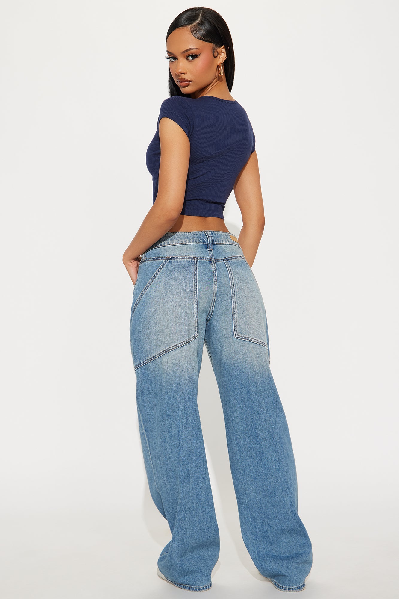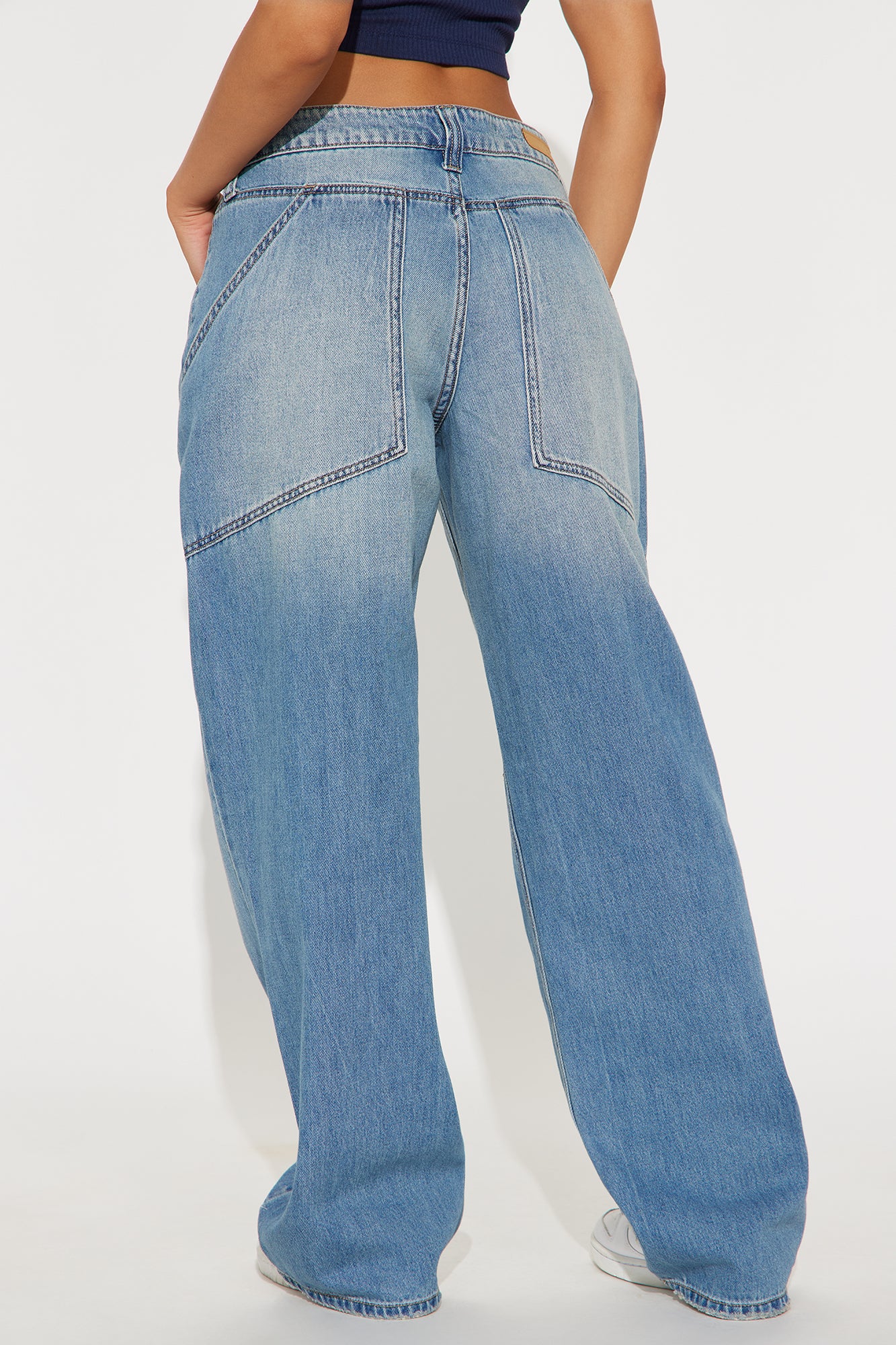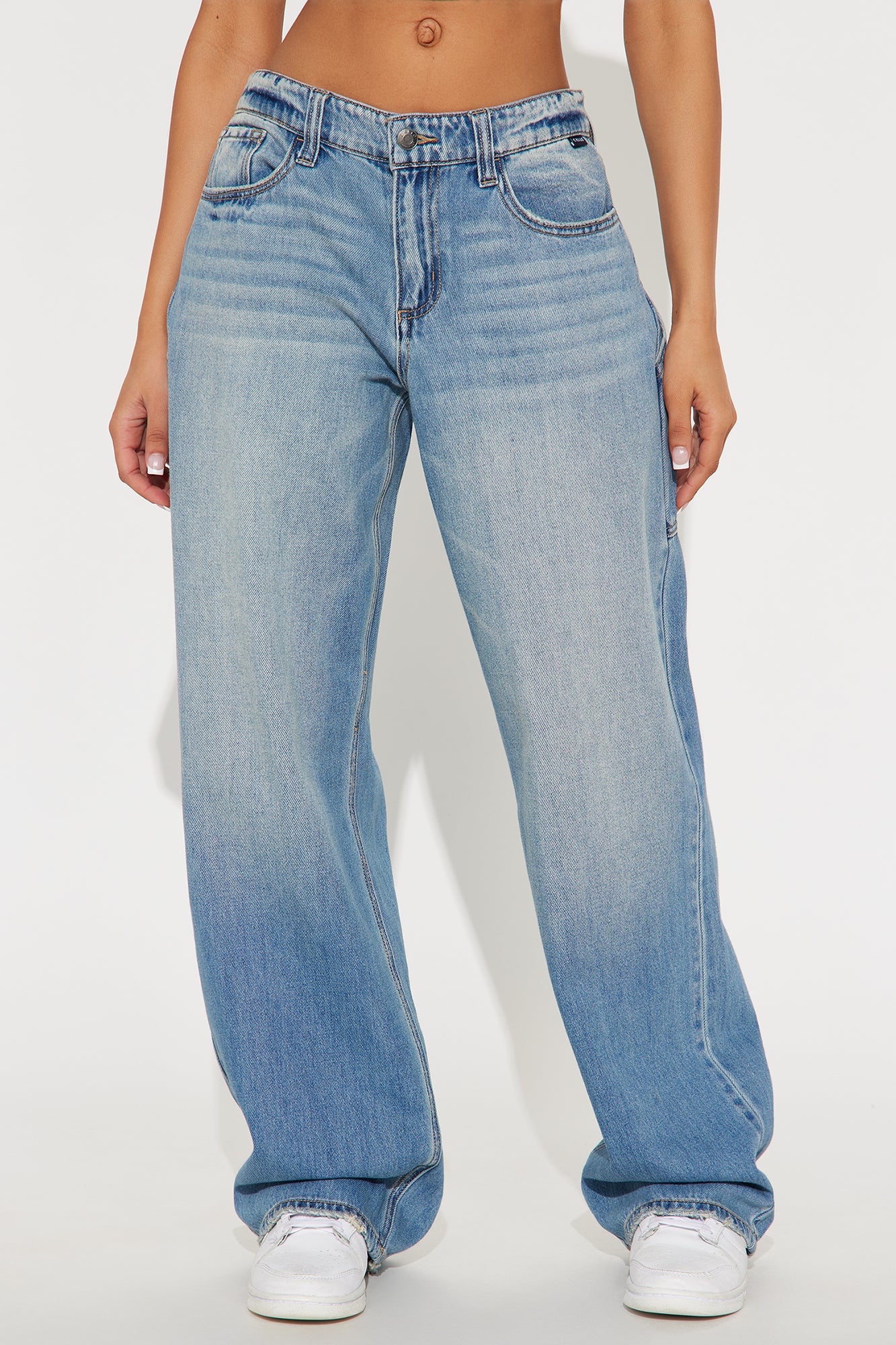 Available In Medium Wash. Wide Leg Jean 5 Pocket Non-Stretch 9.5" Rise 32" Inseam Disclaimer: Due To The Specialized Wash, Each Garment Is Unique. 100% Cotton Imported |