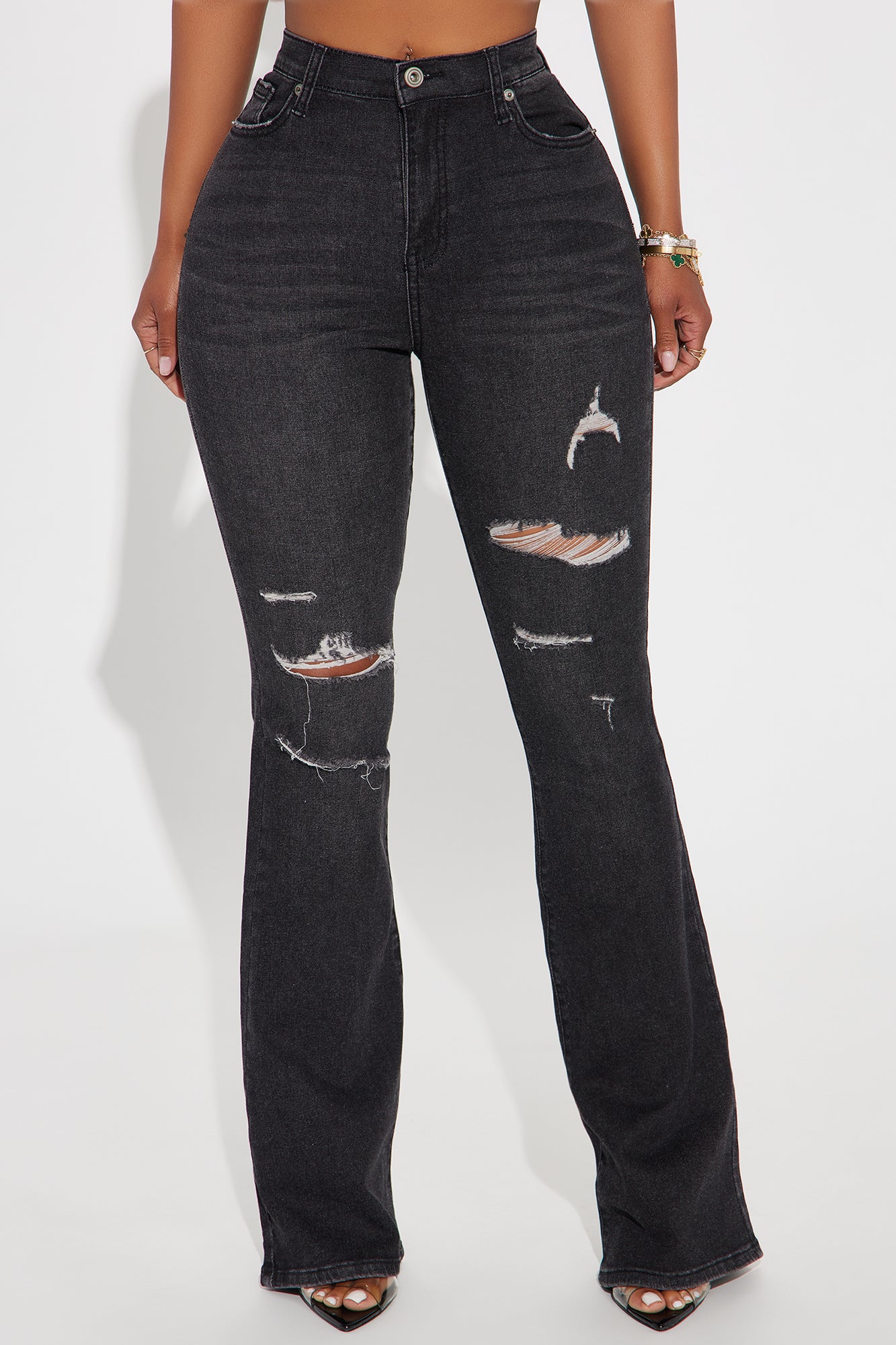 Available In Black Wash. Flare Jean 5 Pocket Ripped 11" High Rise 34" Inseam High Stretch Disclaimer: Due To The Specialized Wash, Each Garment Is Unique. 70% Cotton 28% Polyester 2% Spandex Imported |