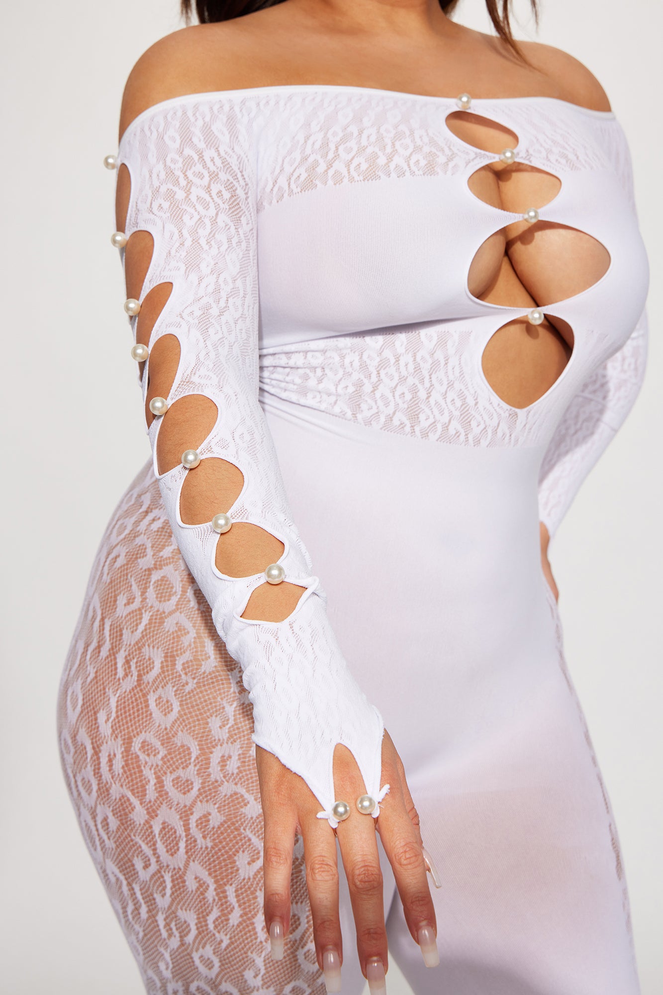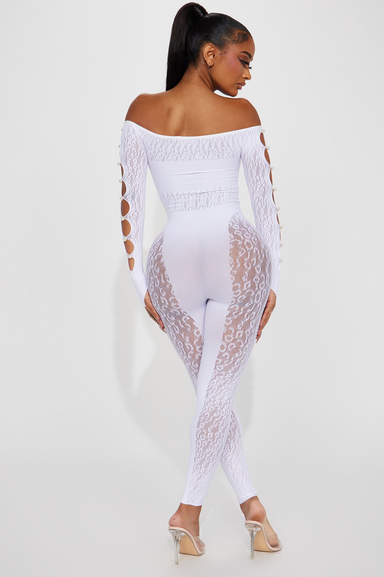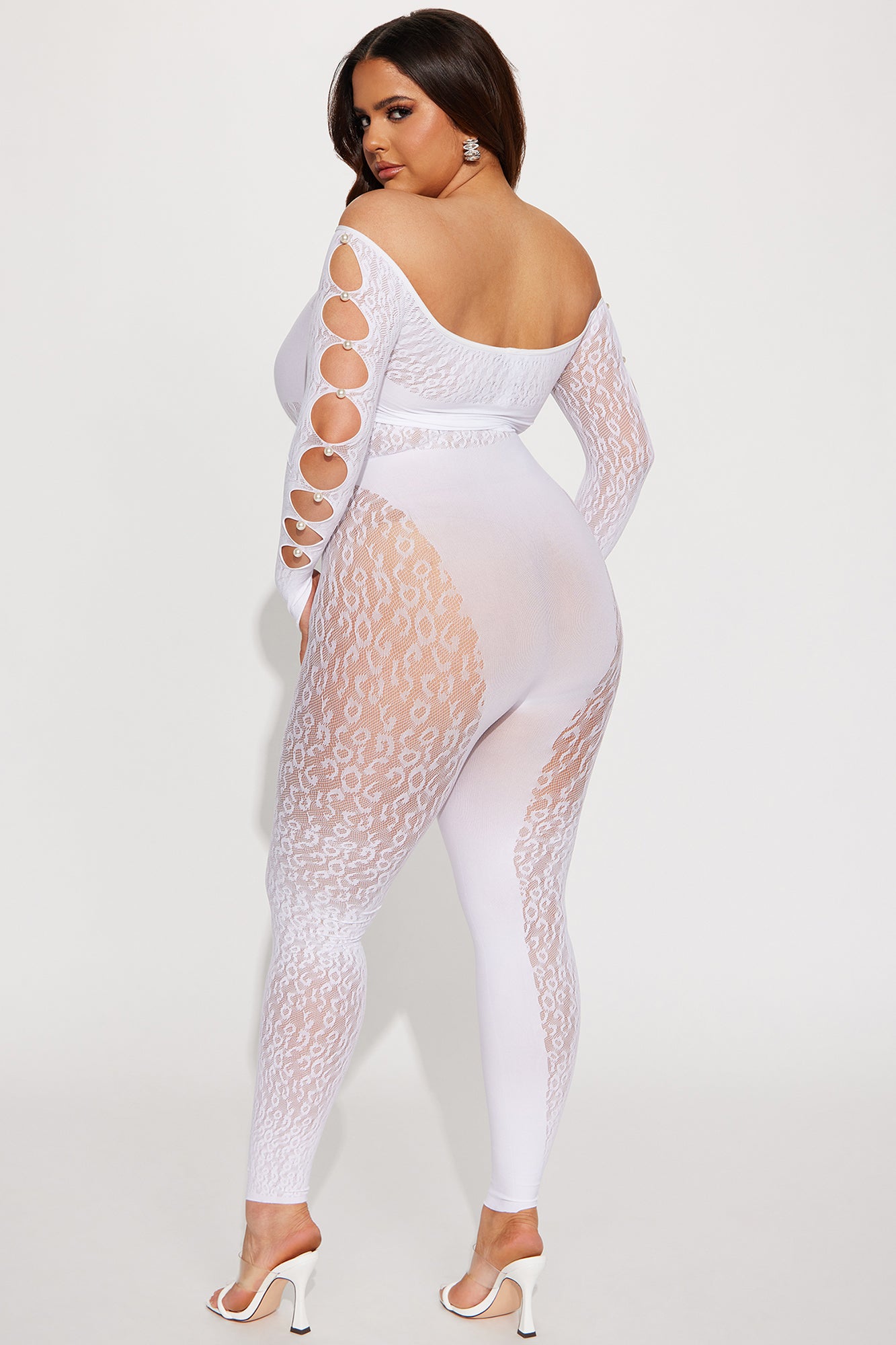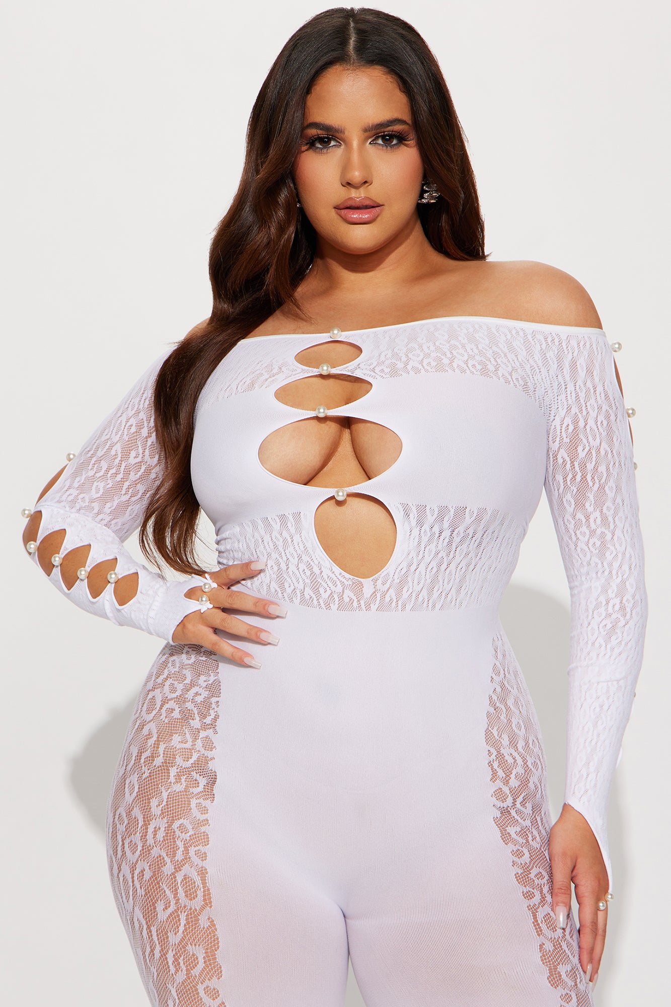 Available In White And Aqua. Seamless Jumpsuit Animal Print Off Shoulder Long Sleeve Sexy Cut Outs Pearl Detail Legging Partially Sheer Stretch 90% Nylon 10% Spandex Imported |
