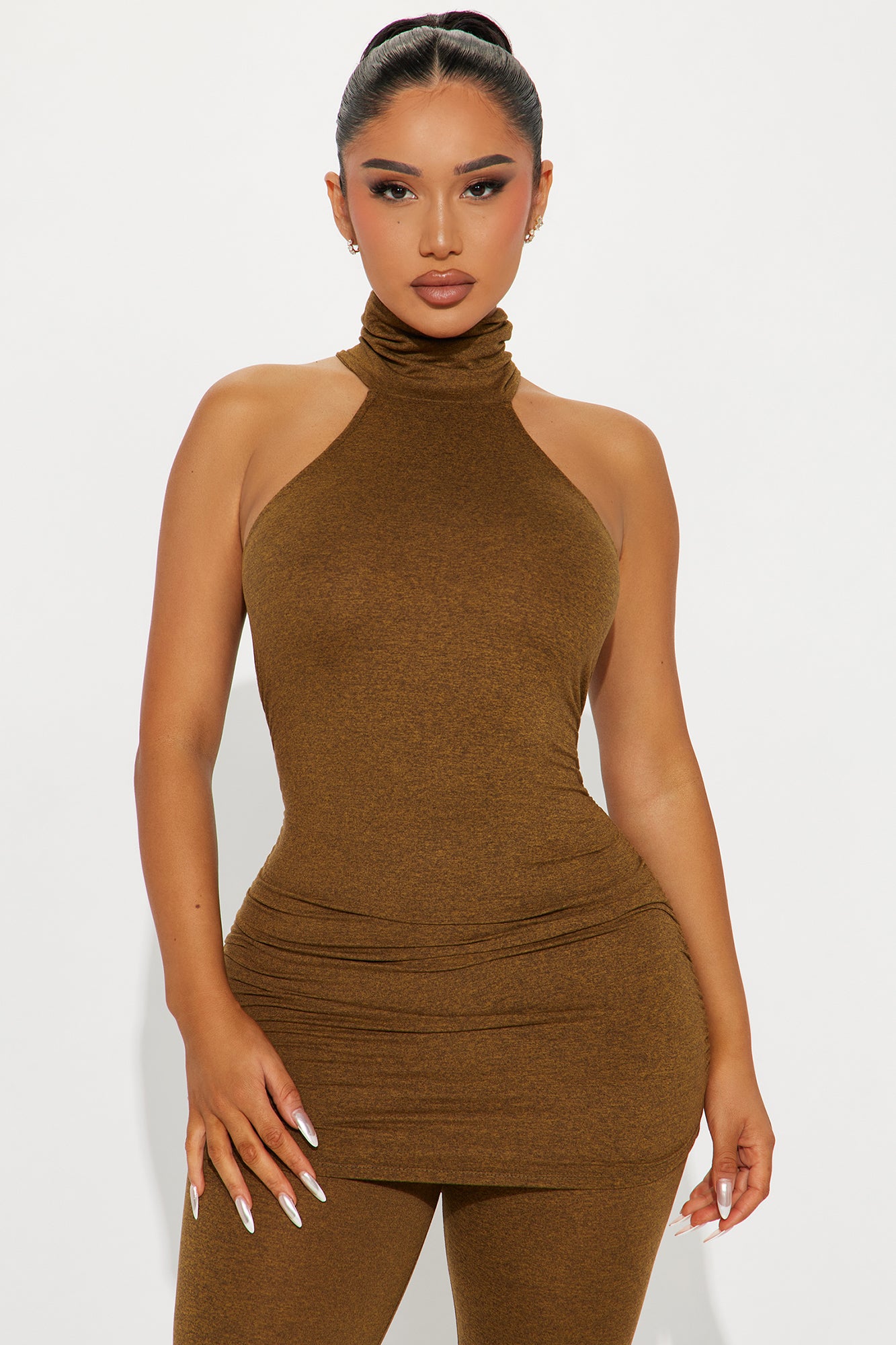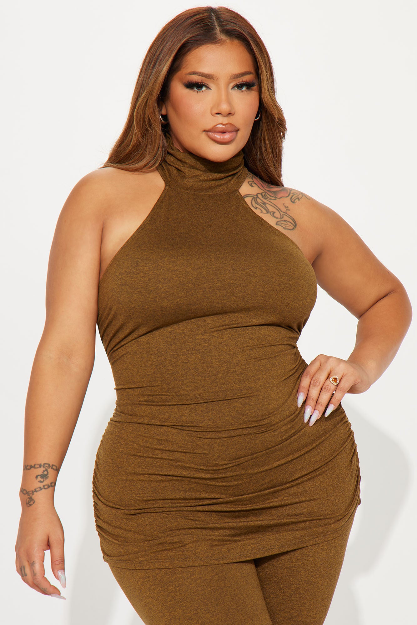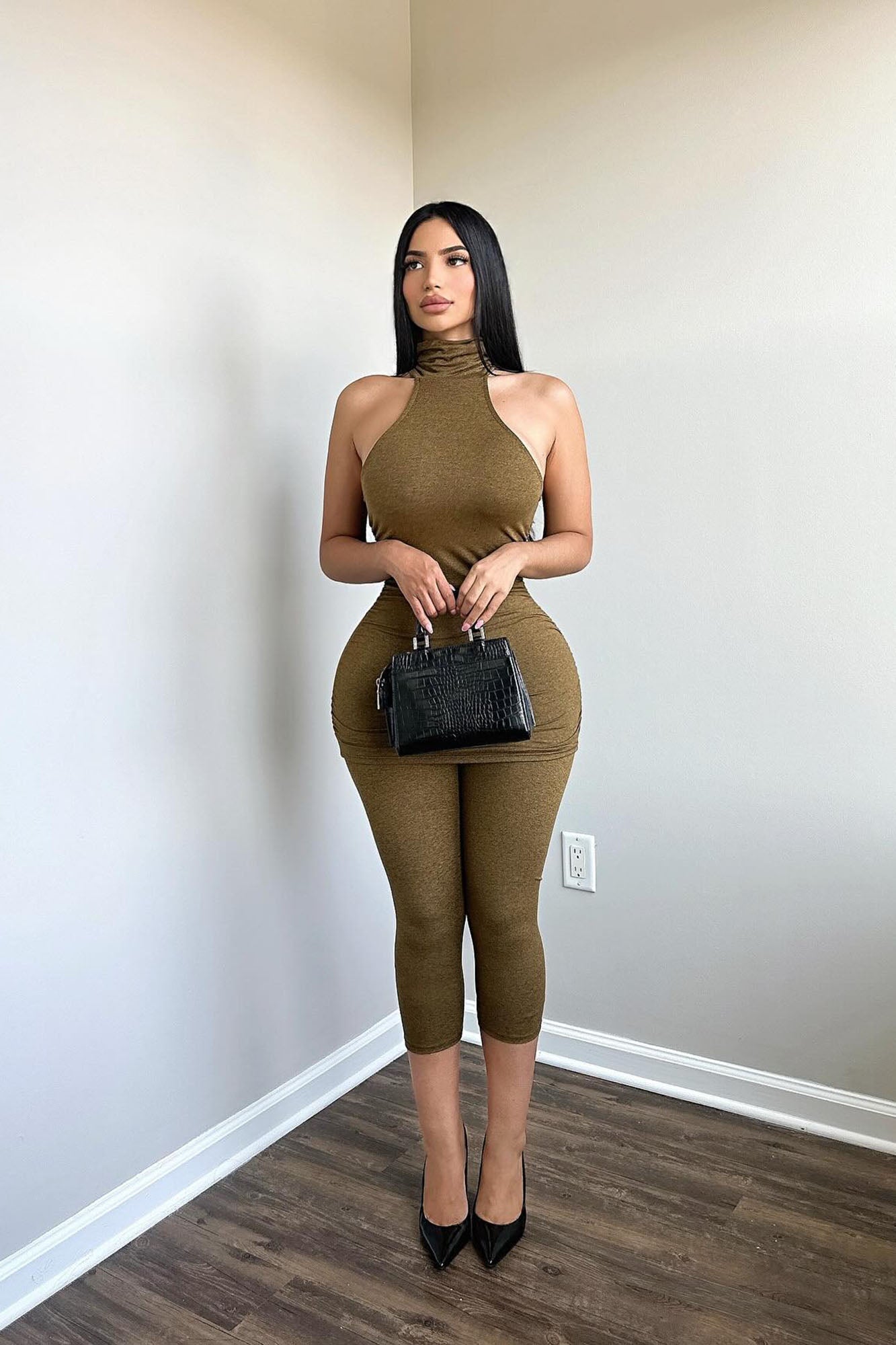 Available In Olive And Black. Legging Set Tank Top Sleeveless Turtle Neck Ruched Detail Leggings Elastic Waistband Stretch 92% Polyester 8% Spandex Imported |
