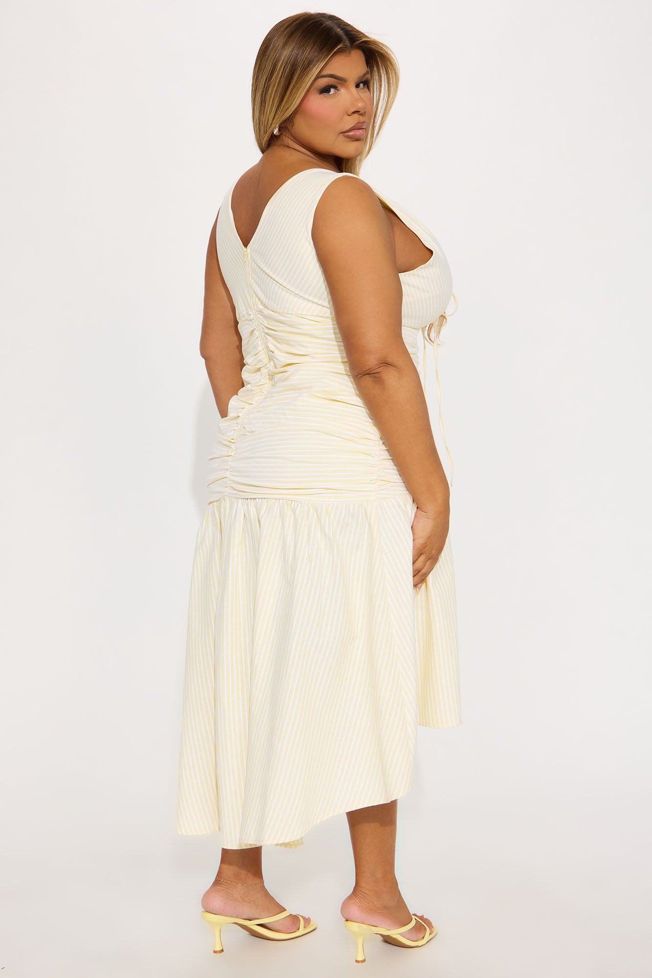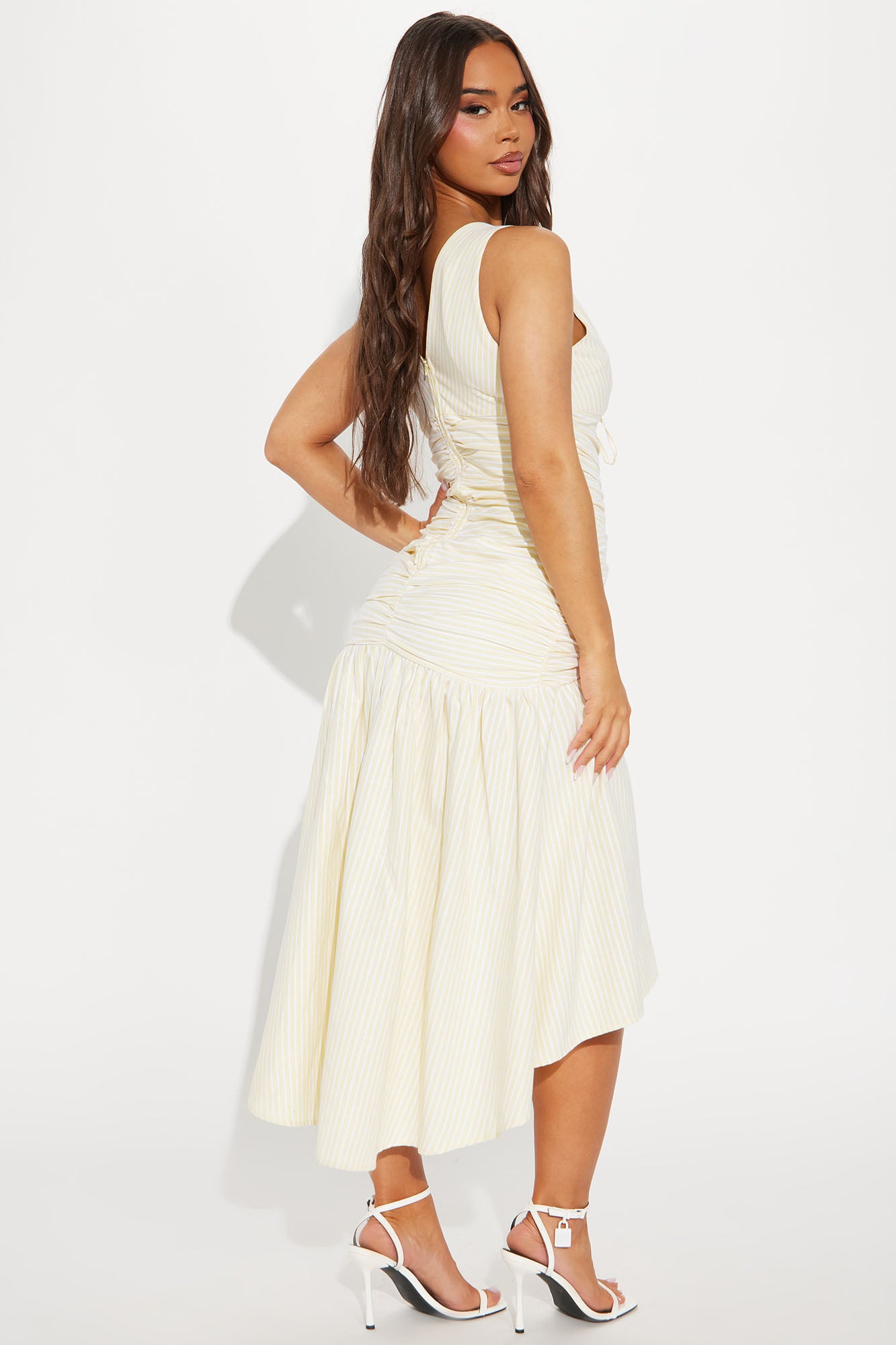 Available In White/combo And Yellow. Striped Linen Midi Dress V-neck Sleeveless Tie front. Ruched Back zipper Stretch Length = 44" Self: 70% Cotton 30% Polyester Lining: 100% Polyester Imported |