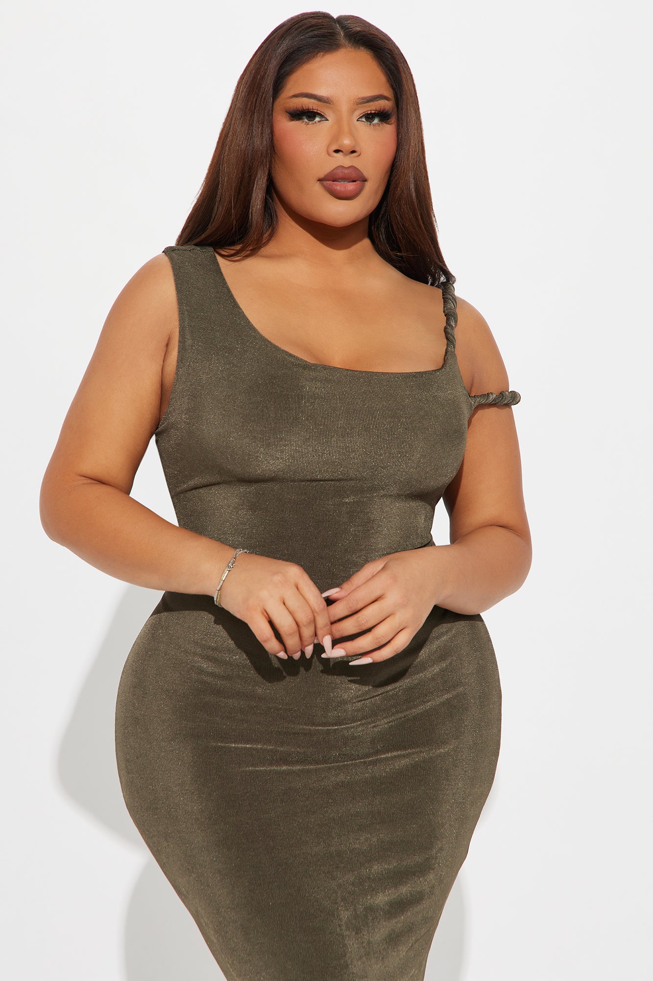 Available In Olive And Blue. Slinky Double Lined Midi Dress One shoulder Sleeveless Twist detail Double lined Stretch Length measured flat = 45" 95% Polyester , 5% Spandex Imported |