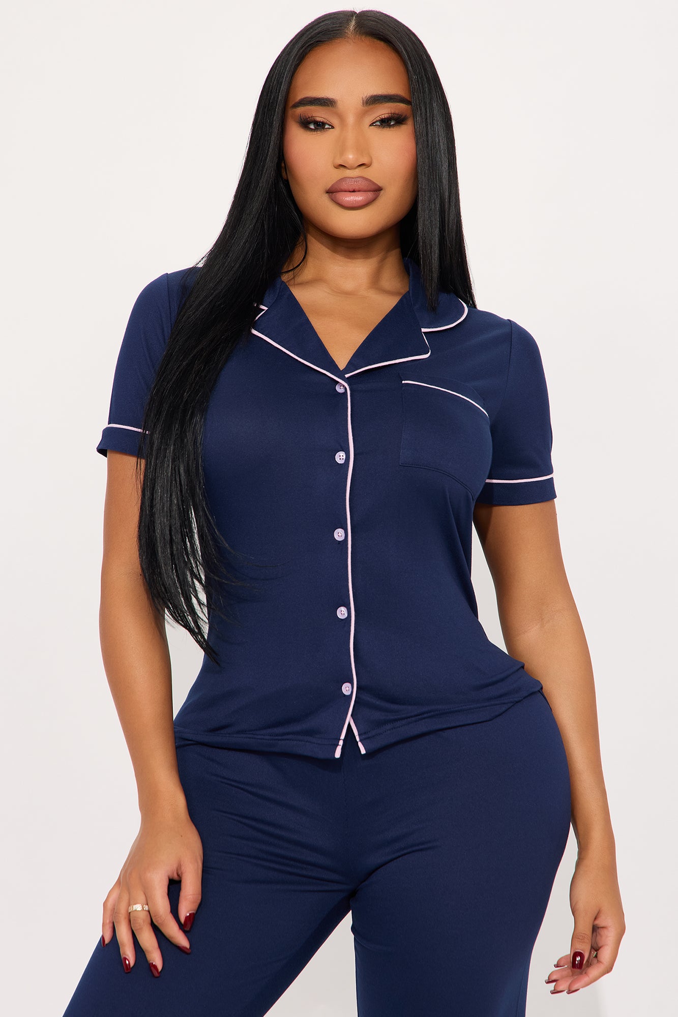 Available In Navy And Red. PJ Pant Set Short Sleeve Collared Shirt Chest Pocket Matching Pants Straight Leg Elastic Waistband Stretch Final Sale 95% Polyester , 5% Spandex Imported |