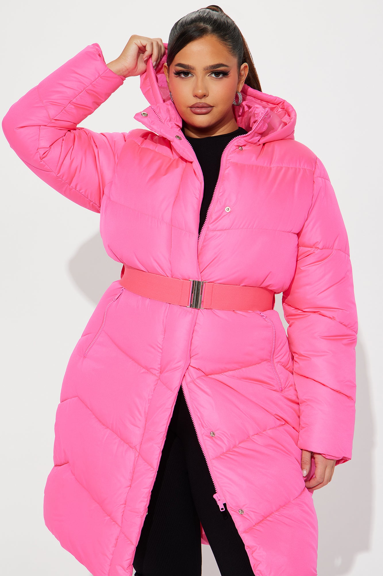 Available In Black, Hot Pink, And White. Puffer Jacket Front Zip Belted Nylon Pockets Hooded Cold Weather Shell: 100% Polyester Filling: 100% Polyester Lining: 100% Polyester Imported |