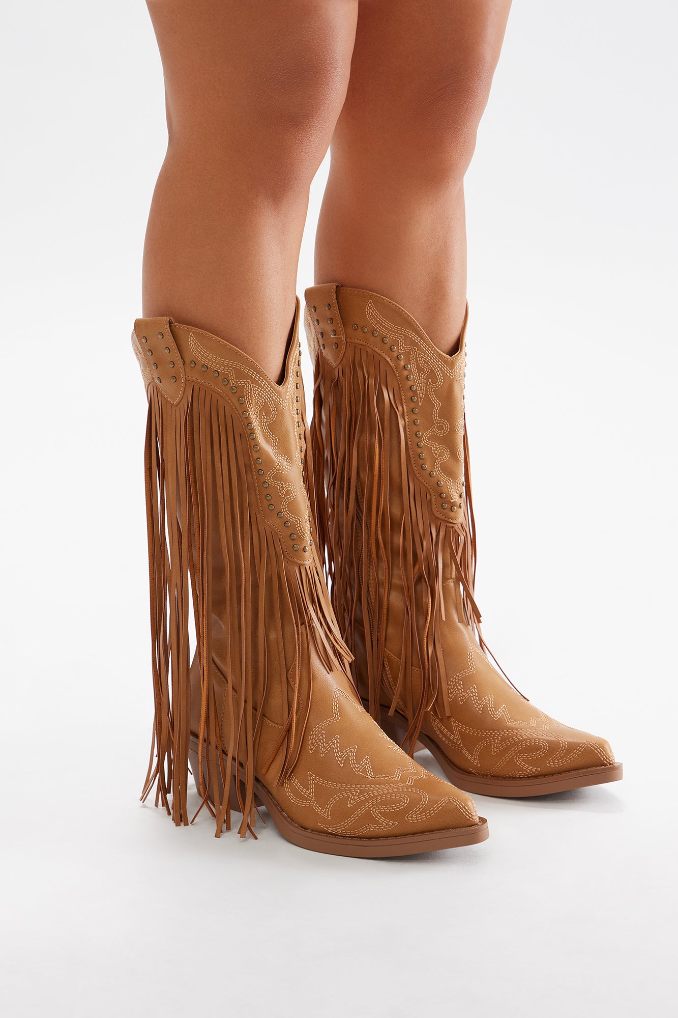 Available In Black And Tan. Knee High Heeled Boots Cowboy Boots Fringe Detail Pointed Toe 2" Mid Block Heel Imported |