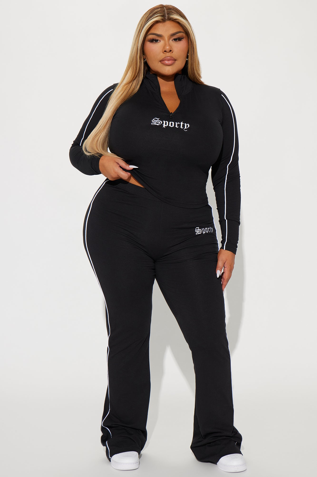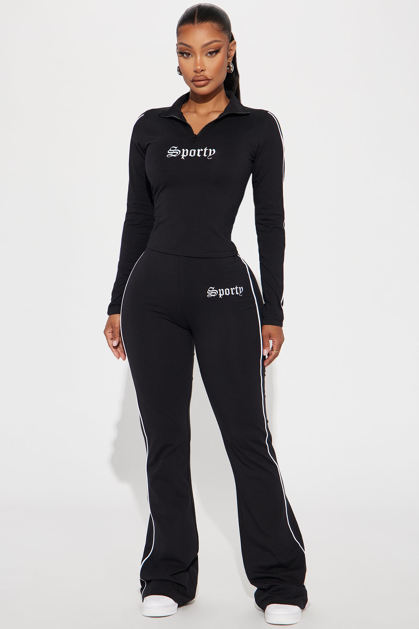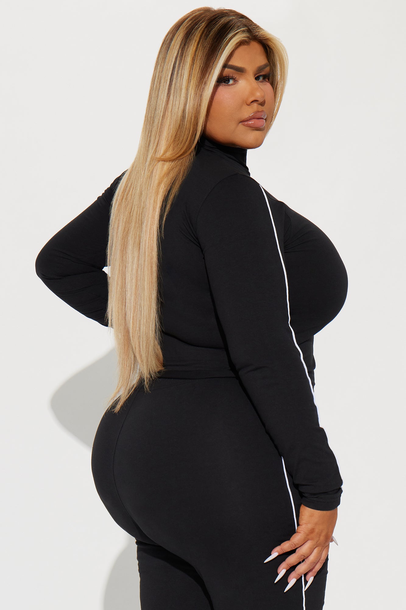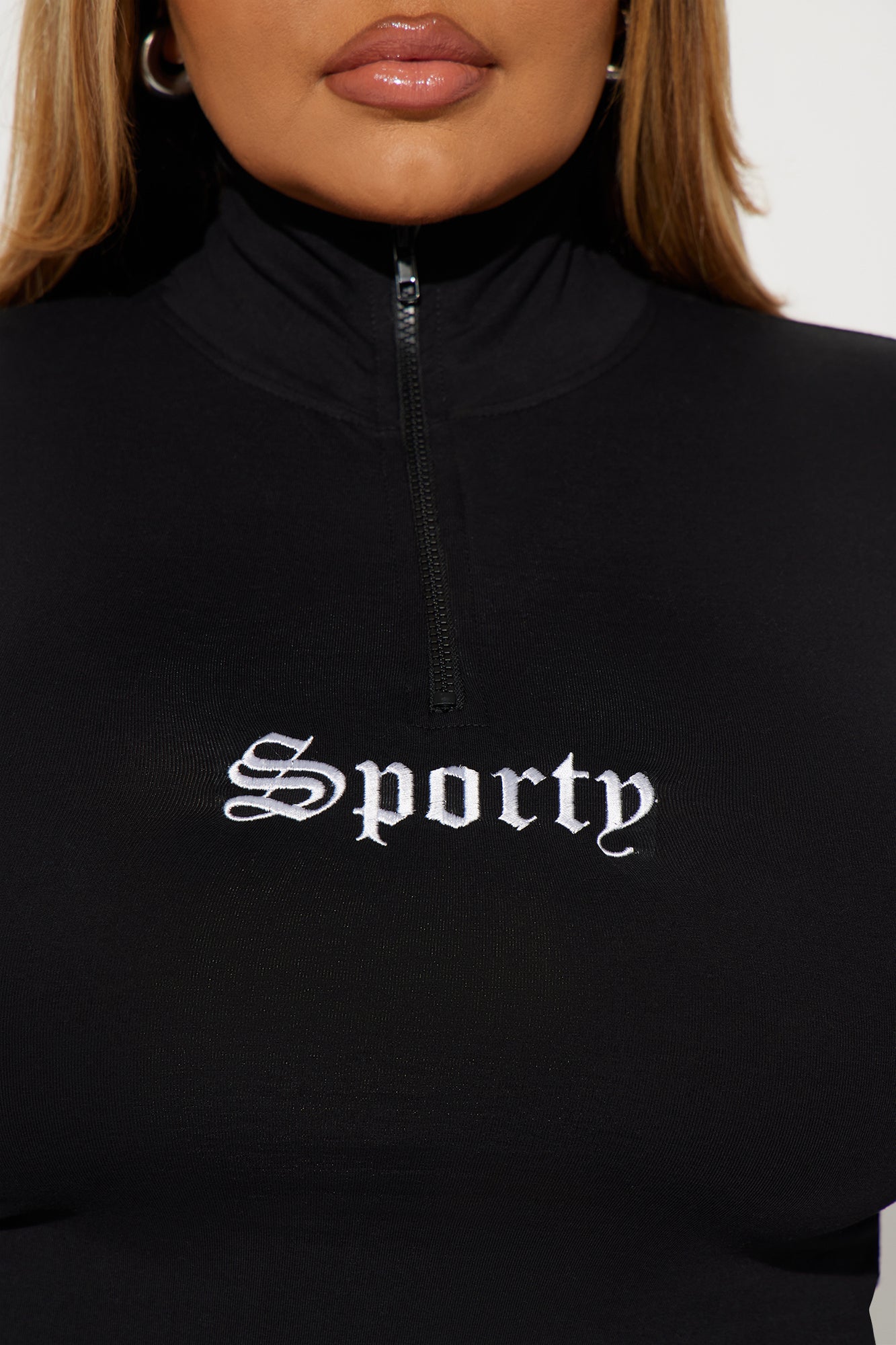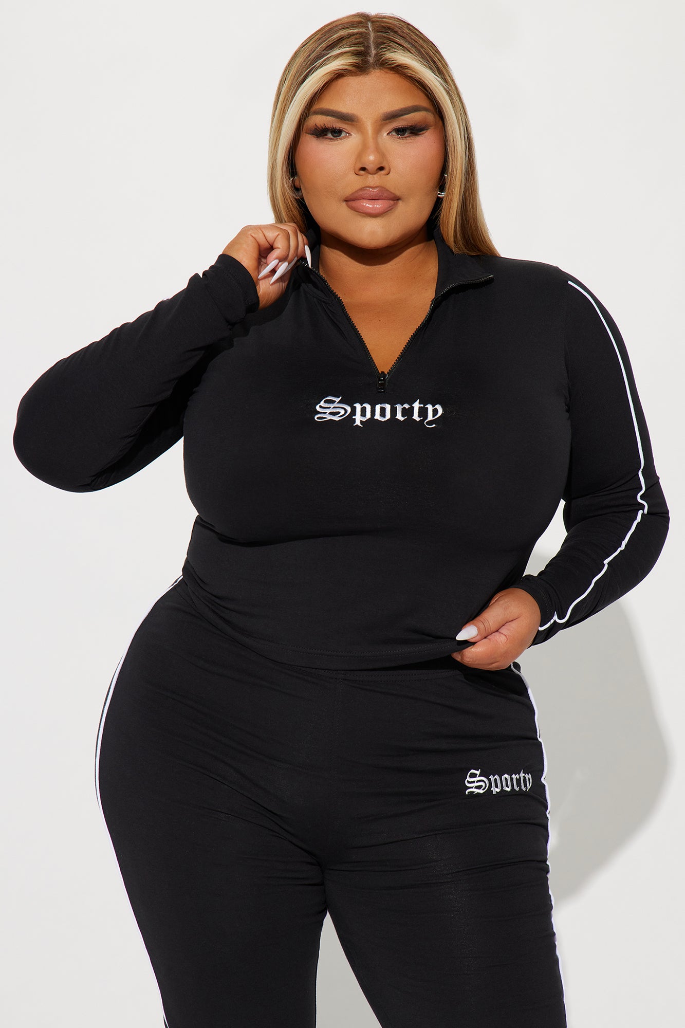 Available In Black/White. Mock Neck Zipper Detail "Sporty" Embroidered Long Sleeve Piping Detail Pair Back To "Sporty Girl Flare Pants" 95% Cotton 5% Elastane Imported |