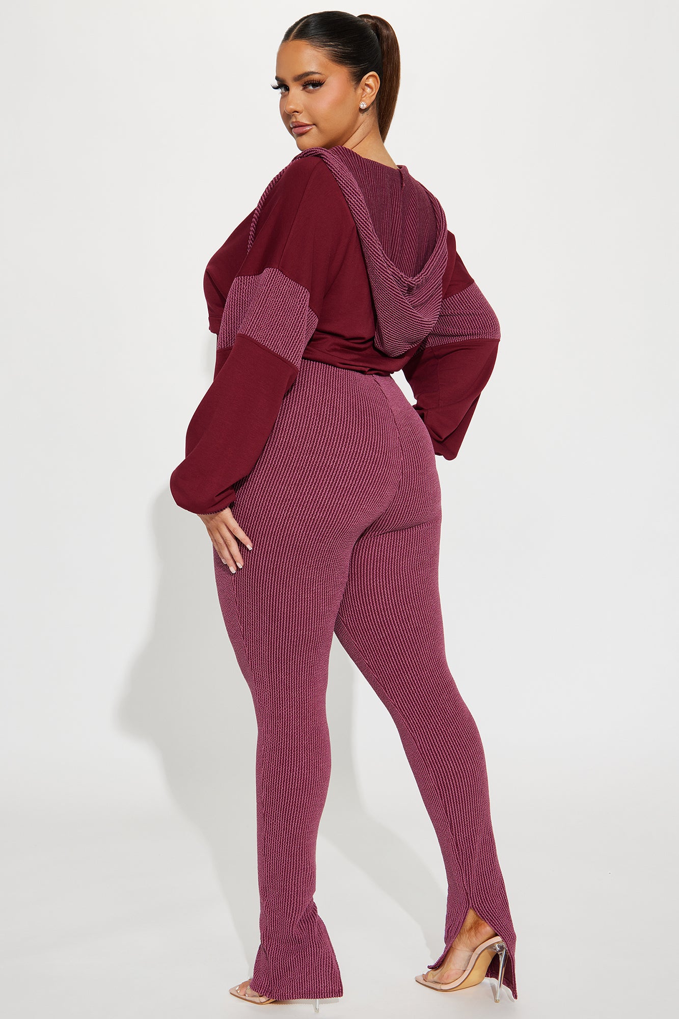Available In Charcoal And Burgundy. Jumpsuit Long Sleeve Front Zipper Hooded Legging Ankle Split Stretch Self: 72% Polyester 25% Rayon 3% Spandex Contrast: 76% Polyester 21% Rayon 3% Spandex Imported |
