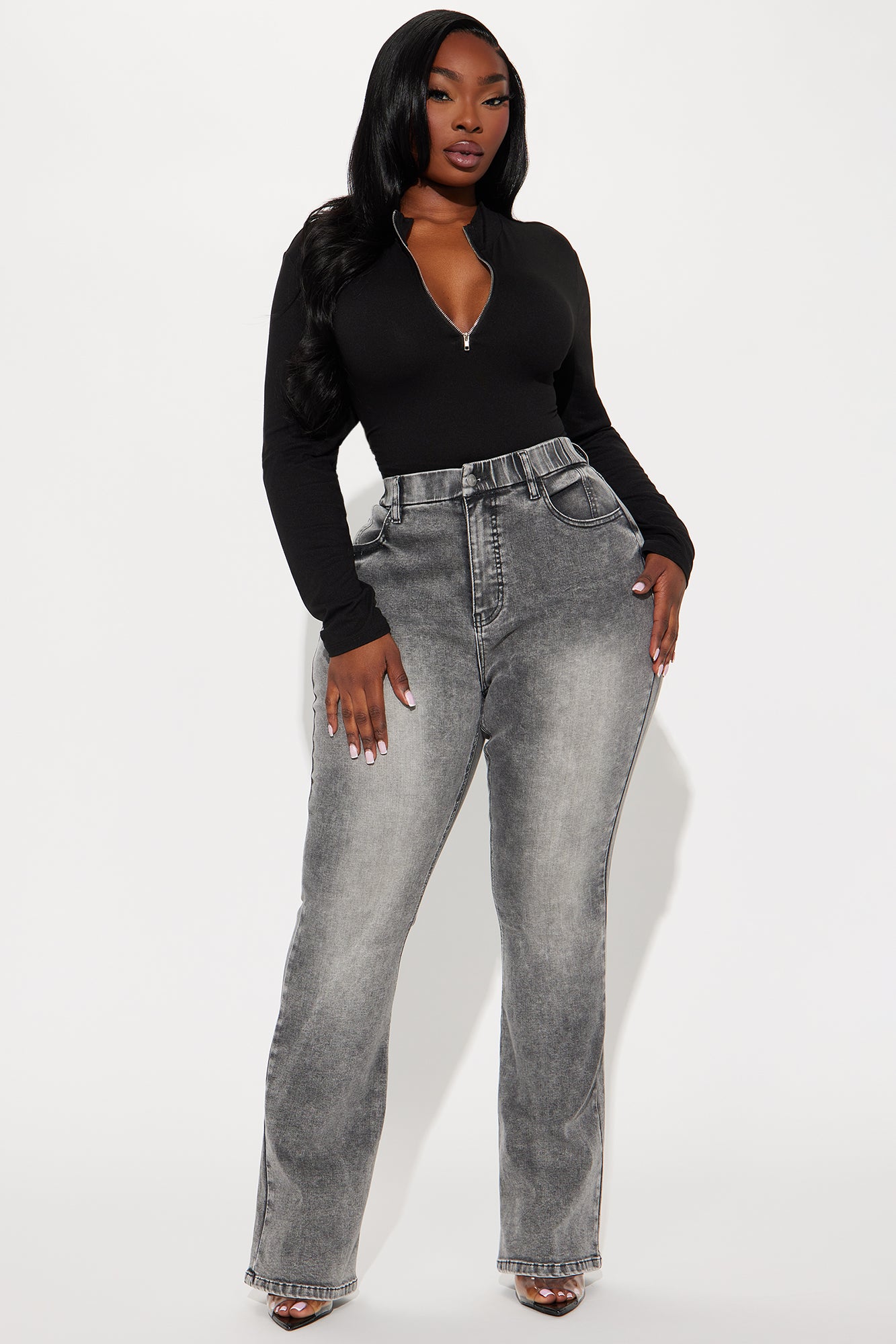 Available In Grey. Available In Regular 33" Inseam & Tall 36" Inseam. Bootcut Jean Pockets Tummy Control No Gap Waistband 11" High Rise High Stretch Disclaimer: Due To The Specialized Wash Process, Each Garment Is Unique. 64% Cotton 31% Polyester 3% Spandex 2% Spandex Imported |