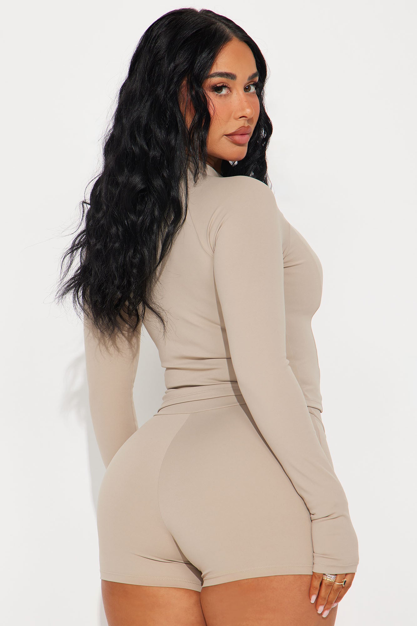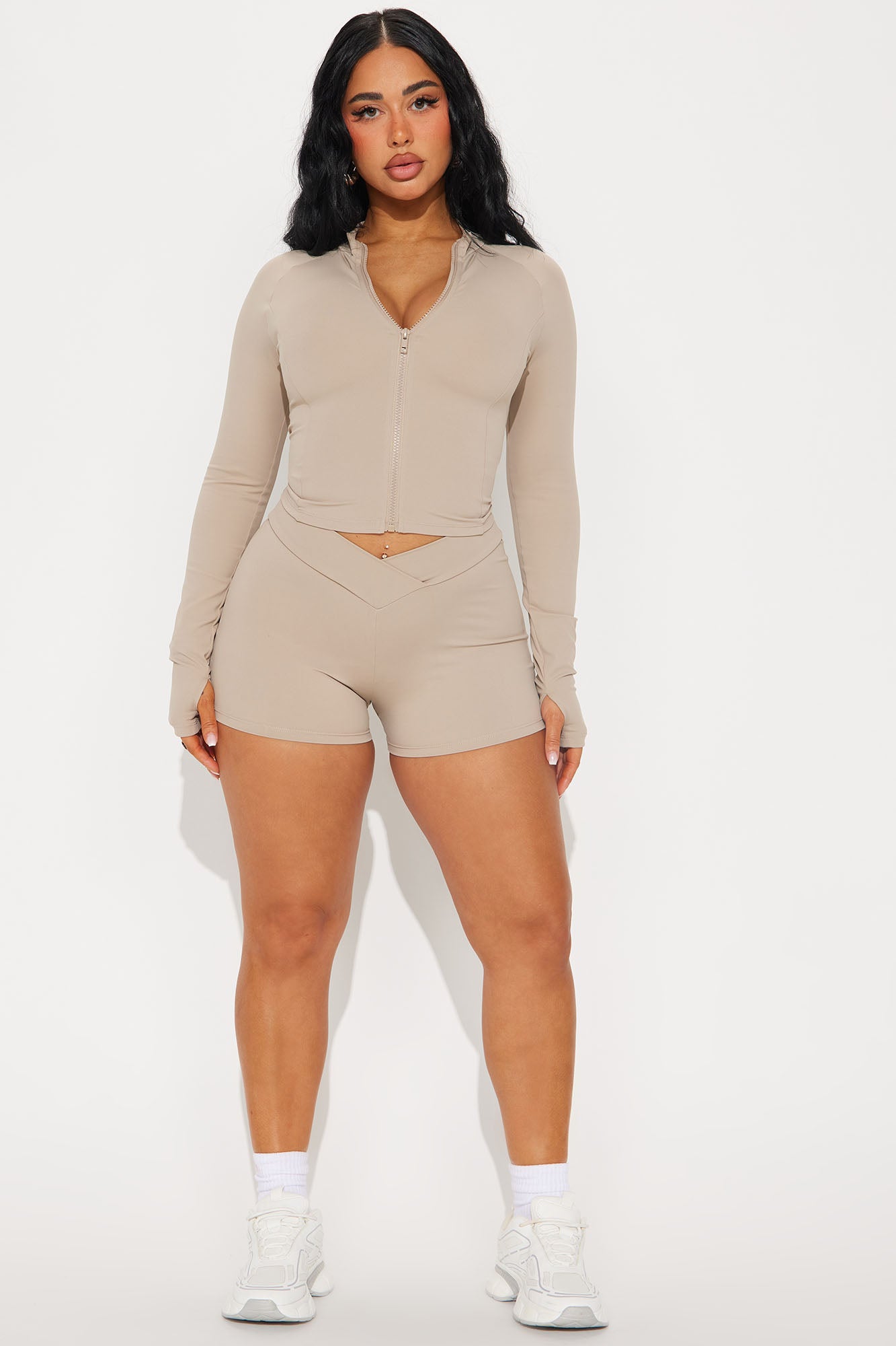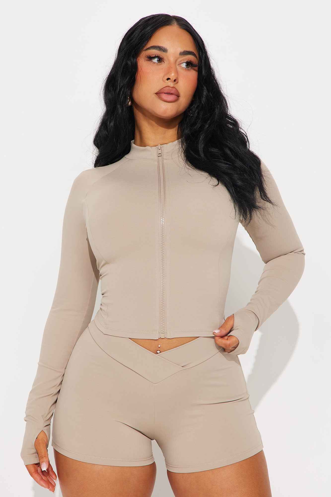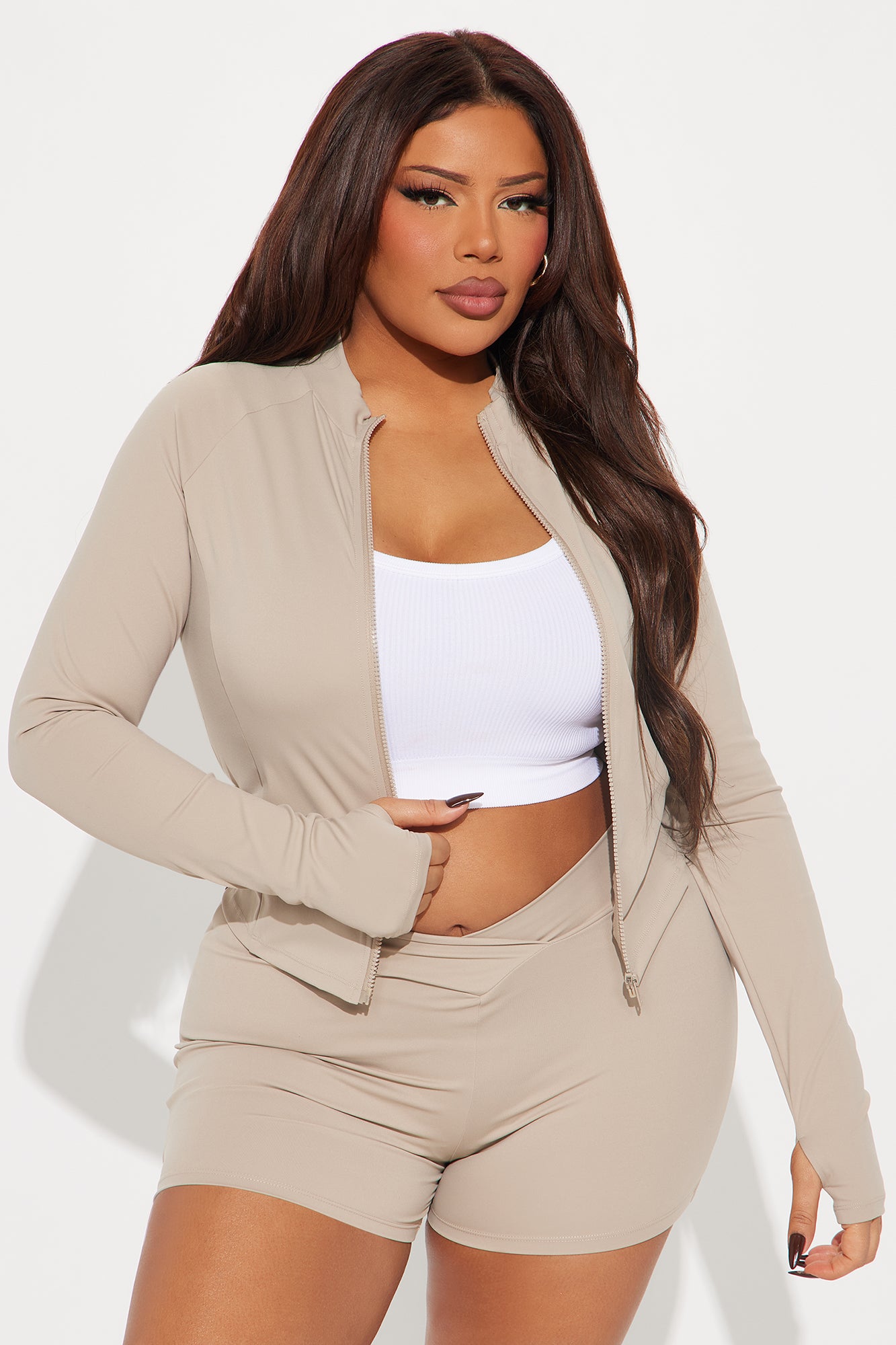 Available In Sage And Taupe. Active Jacket Mock Neck Long Sleeve Tricot Full Zip Thumbholes Low Impact Stretch Pair With "Stay Snatched Active Yoga Pant" "Stay Snatched Active Short" Shell: 77% Nylon 23% Spandex Imported |