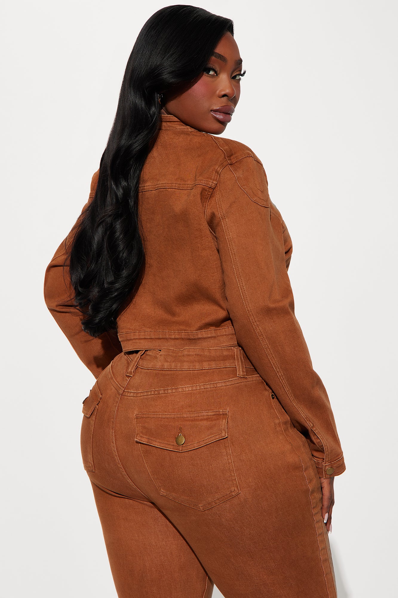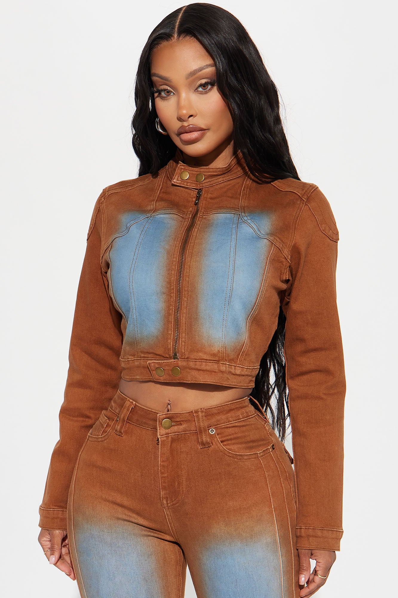 Available In Brown. Pair With Switch Lanes Tinted Moto Flare Jeans Moto Jacket Zipper Closure Tinted Cropped Medium Stretch Disclaimer: Due To The Specialized Wash Process, Each Garment Is Unique. 70% Cotton 28% Polyester 2% Spandex Imported |