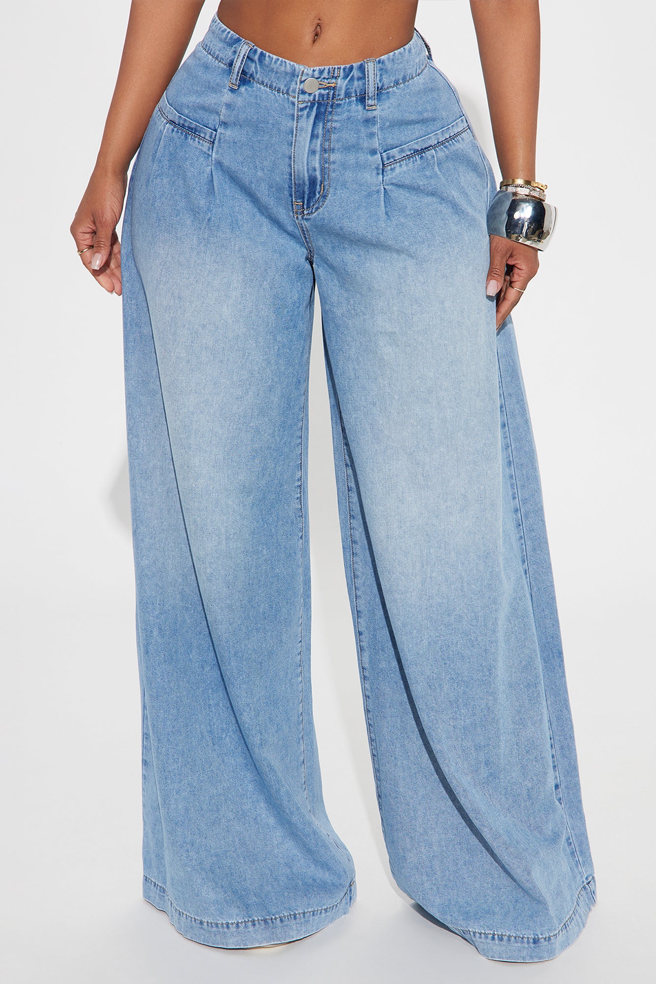 Available In Medium Wash. Wide Leg Jean Pockets Pleated 10.5" High Rise 33" Inseam Non Stretch Disclaimer: Due To The Specialized Wash Process, Each Garment Is Unique. 80% Cotton 10% Rayon 10% Polyester Imported |