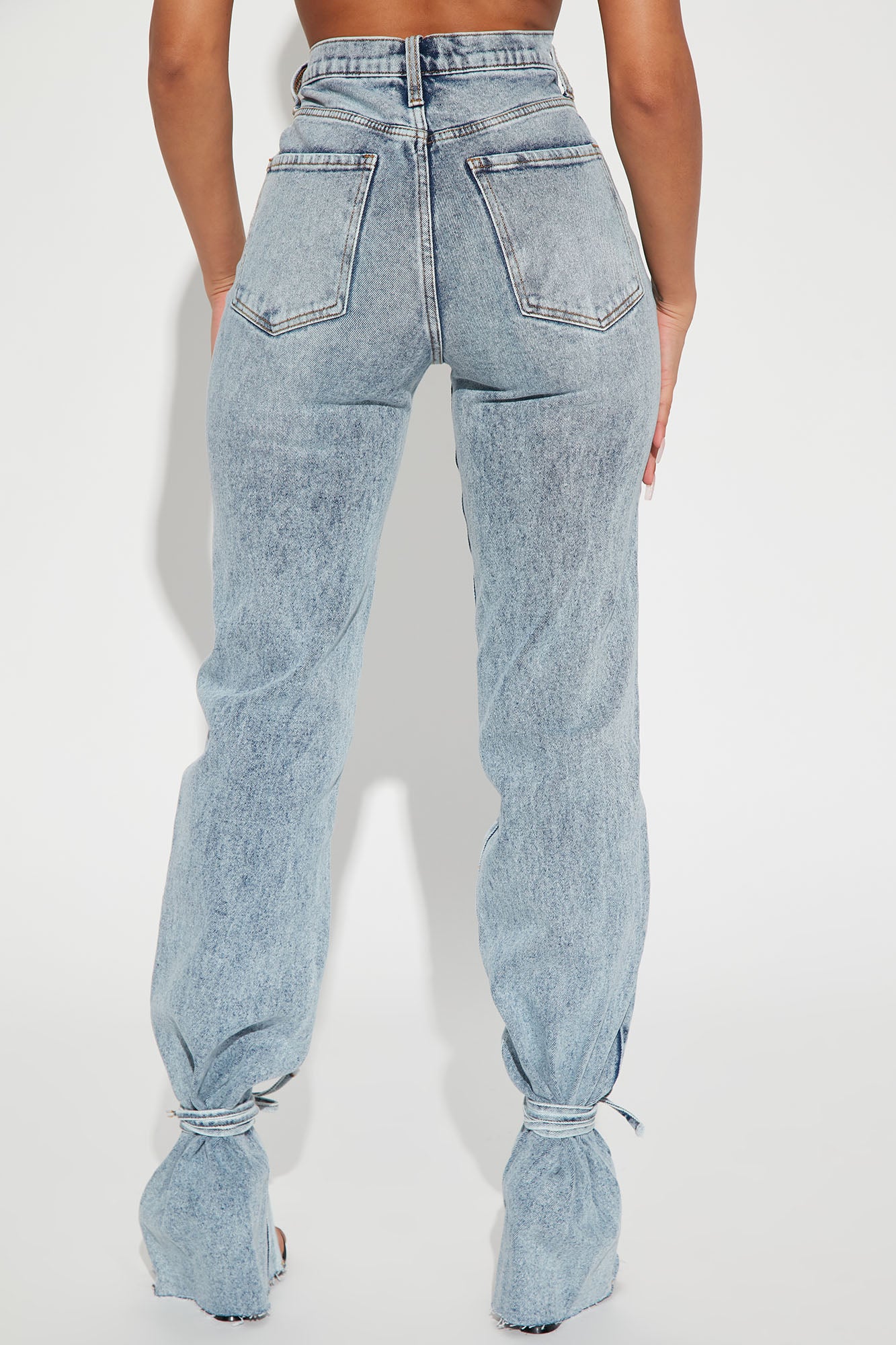 Available In Medium Wash. Available In Petite 31" Inseam, 34" Regular Inseam, & Tall 37" Inseam Straight Leg Jean Low Stretch Functional Ankle Tie Split Hem 5 Pocket 11" High Rise Disclaimer: Due To The Specialized Wash Process, Each Garment Is Unique. 99% Cotton 1% Spandex Imported |