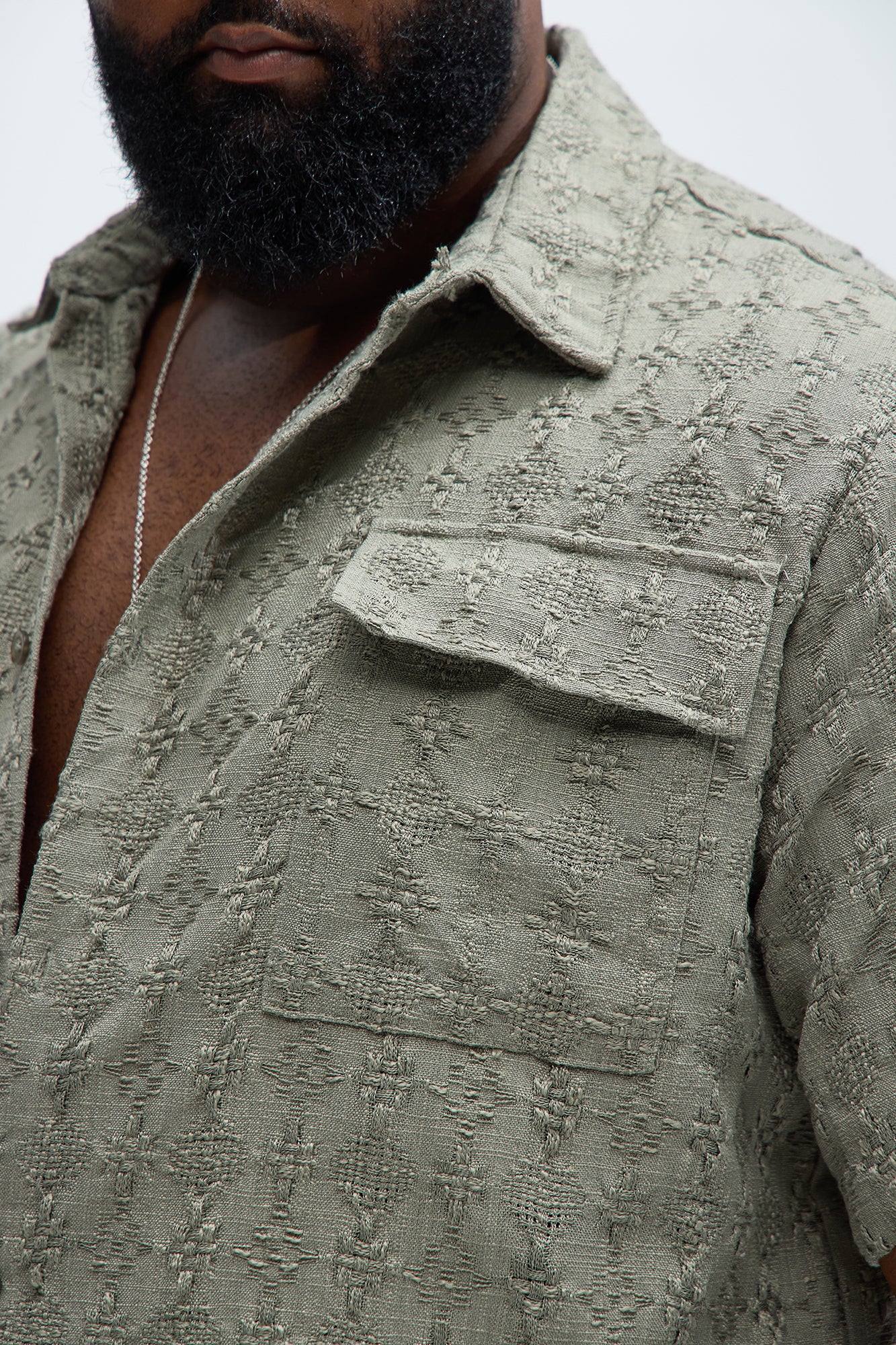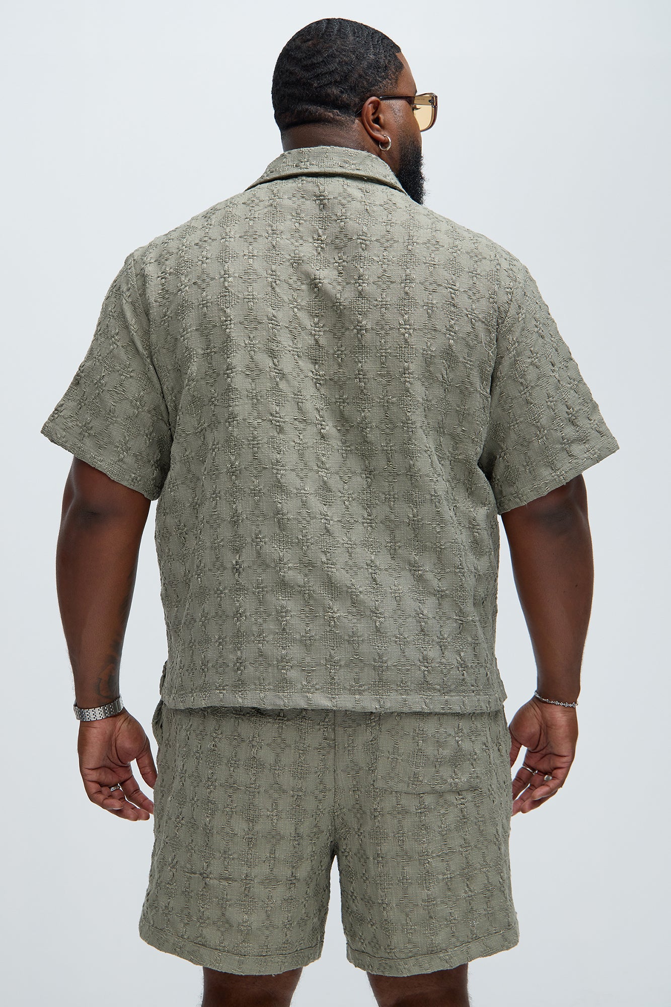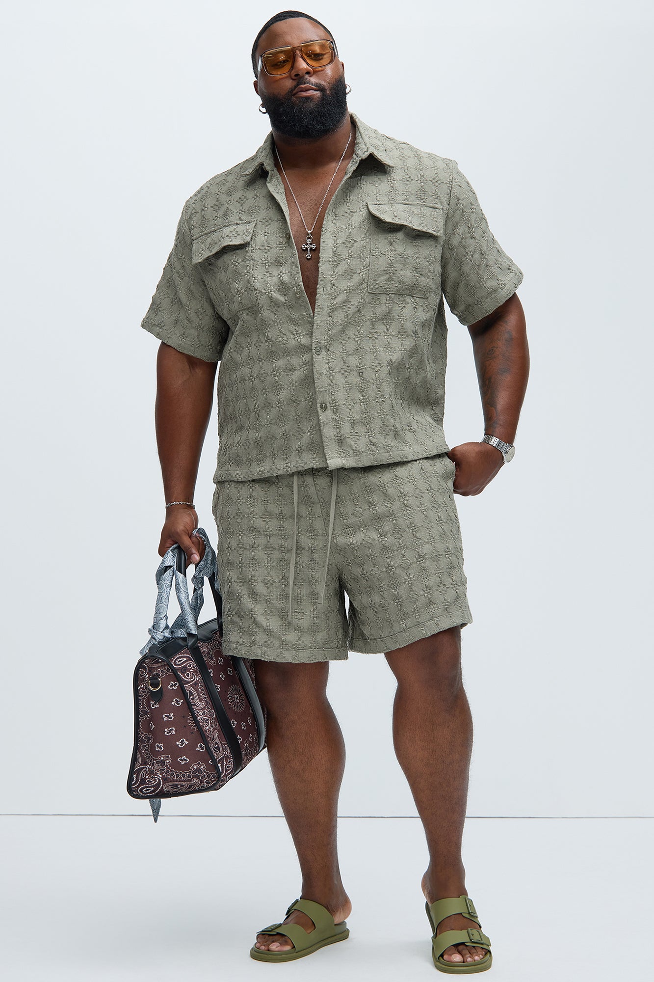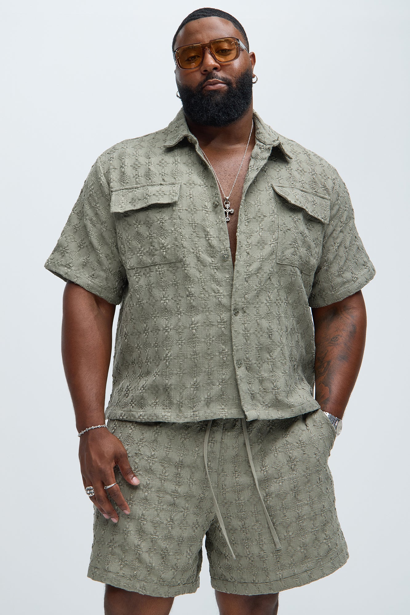 Available In Olive. Fold Down Collar Front Button Closure Chest Pockets Short Sleeve Bottom Side Slit Pair With "Mav Textured Shorts" 100% Polyester Imported |