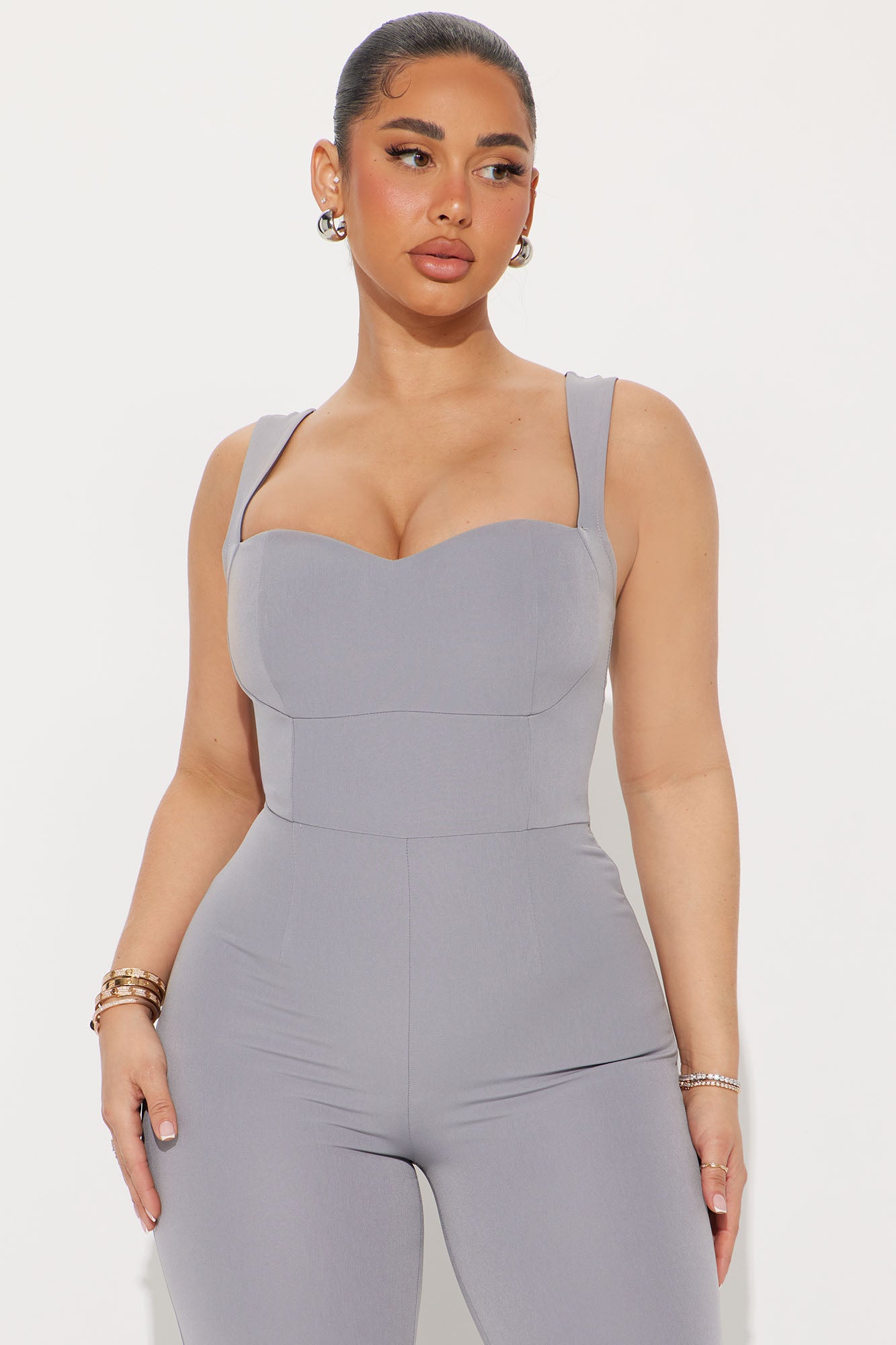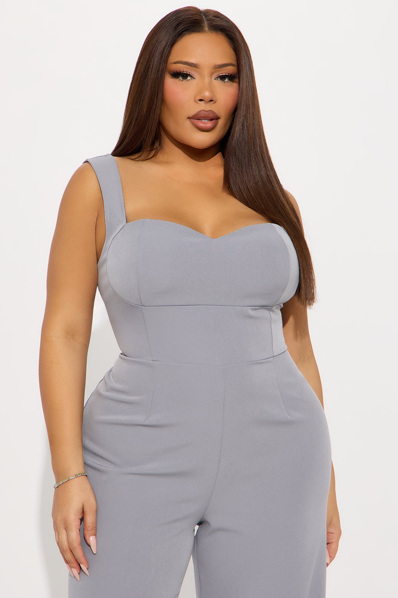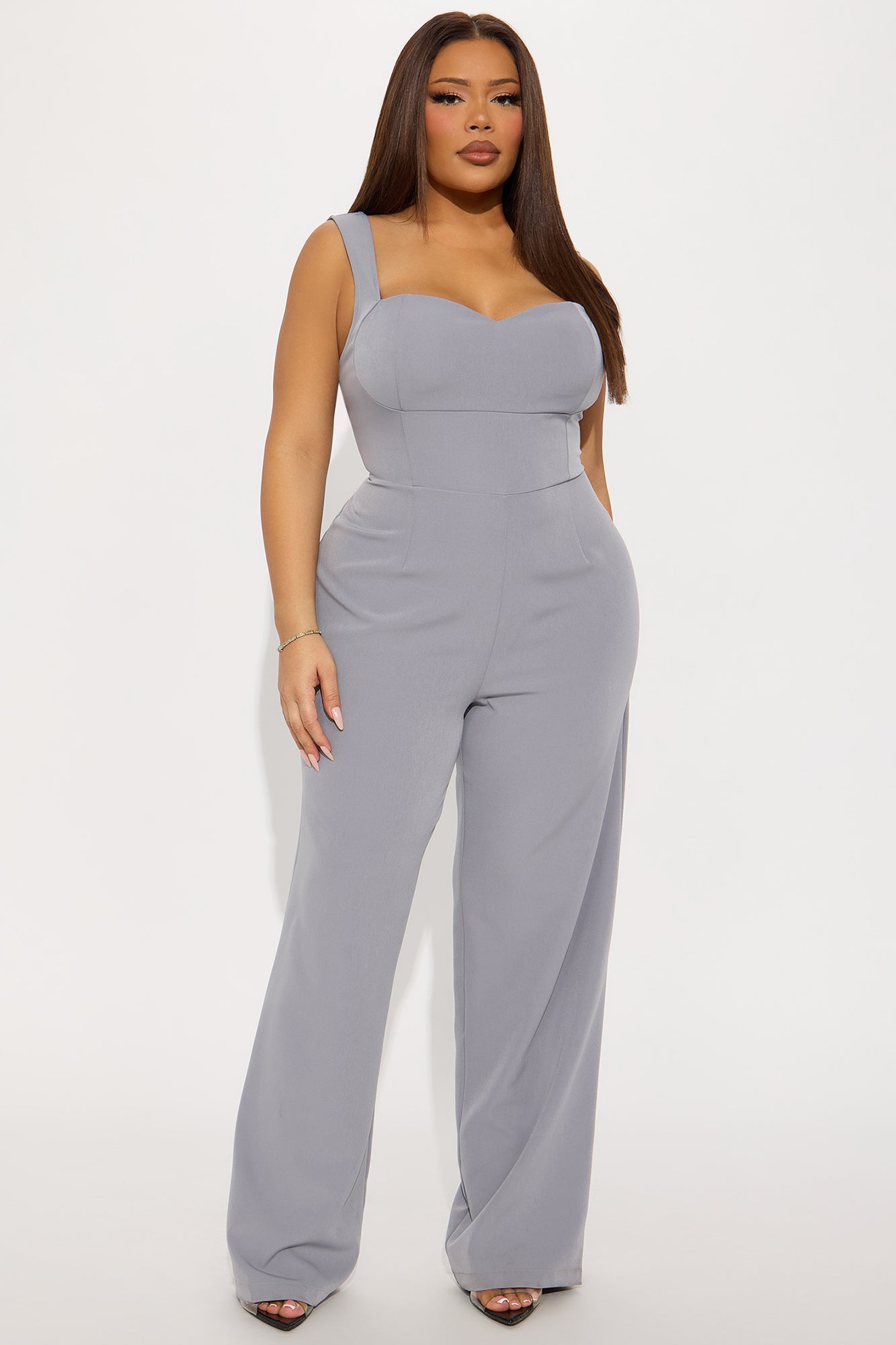 Available In Grey. Jumpsuit Invisible Side Zip Closure Wide Leg Non Stretch Inseam = 33" 88% Polyester 12% Spandex Imported |