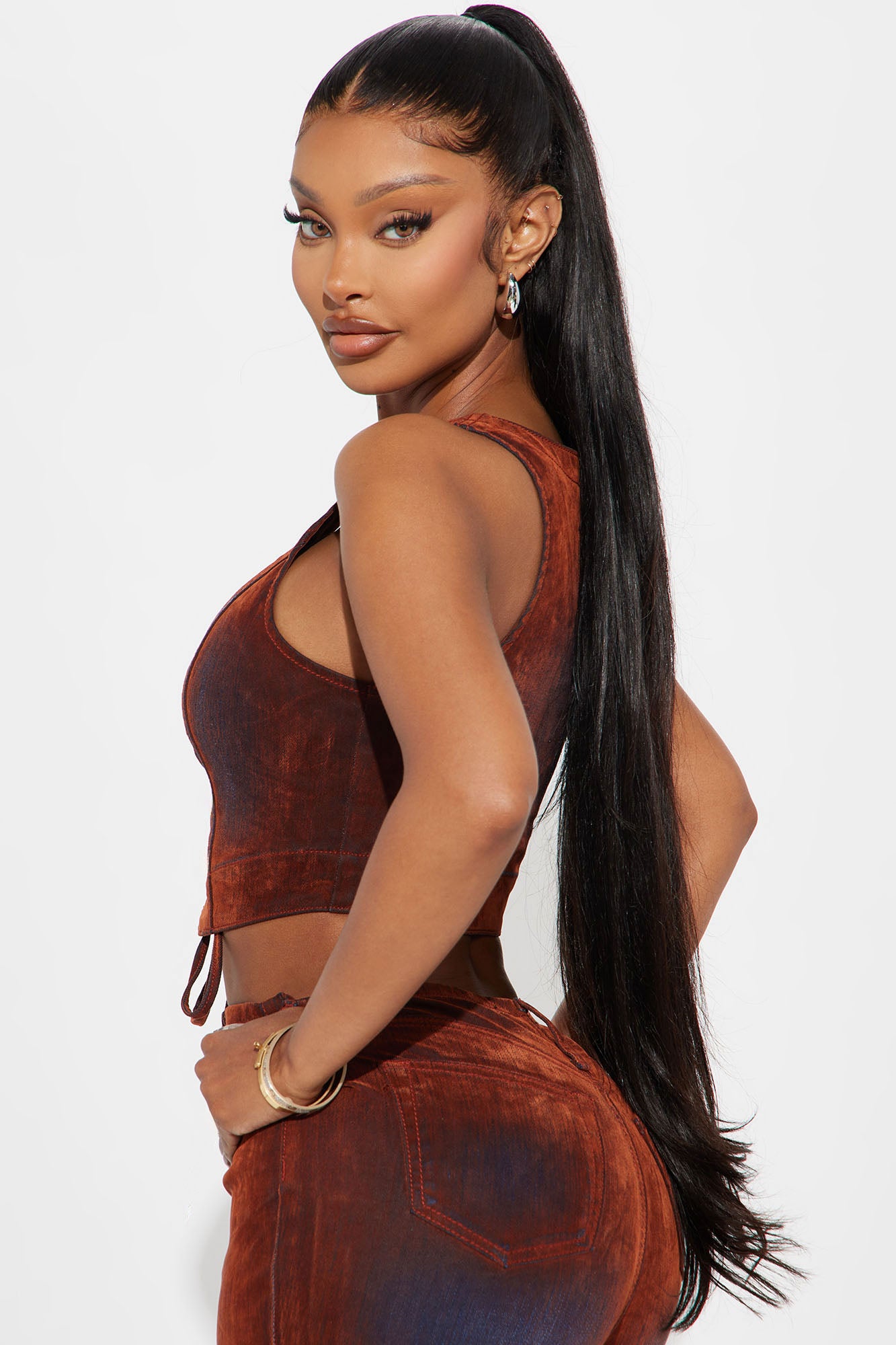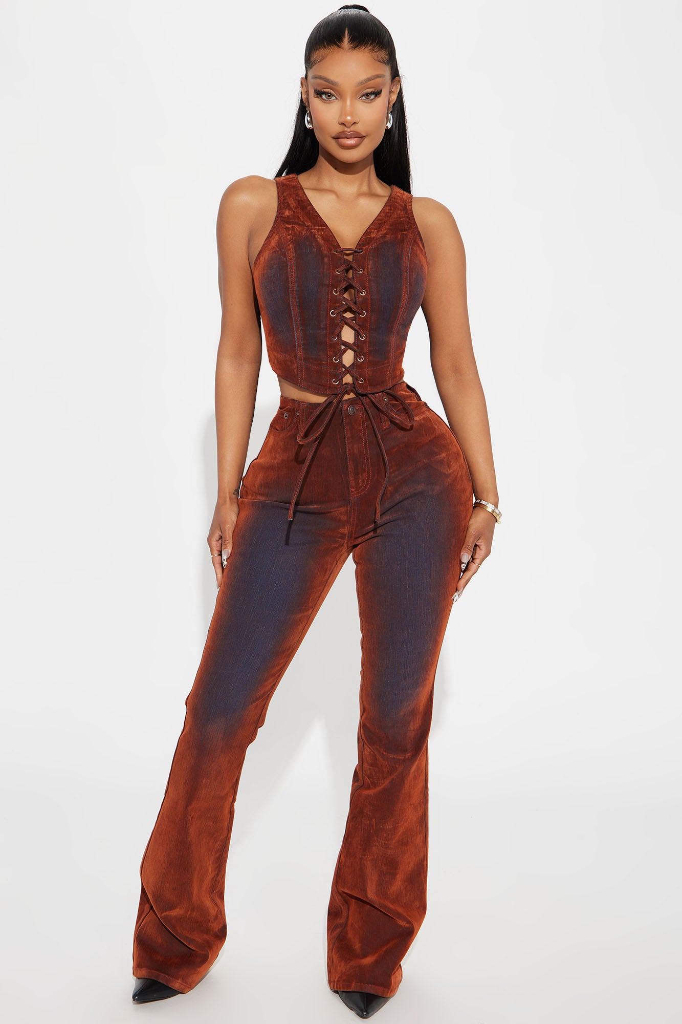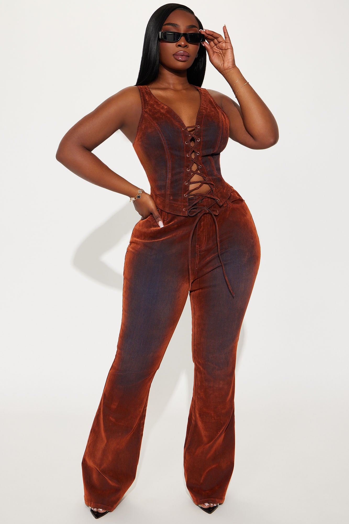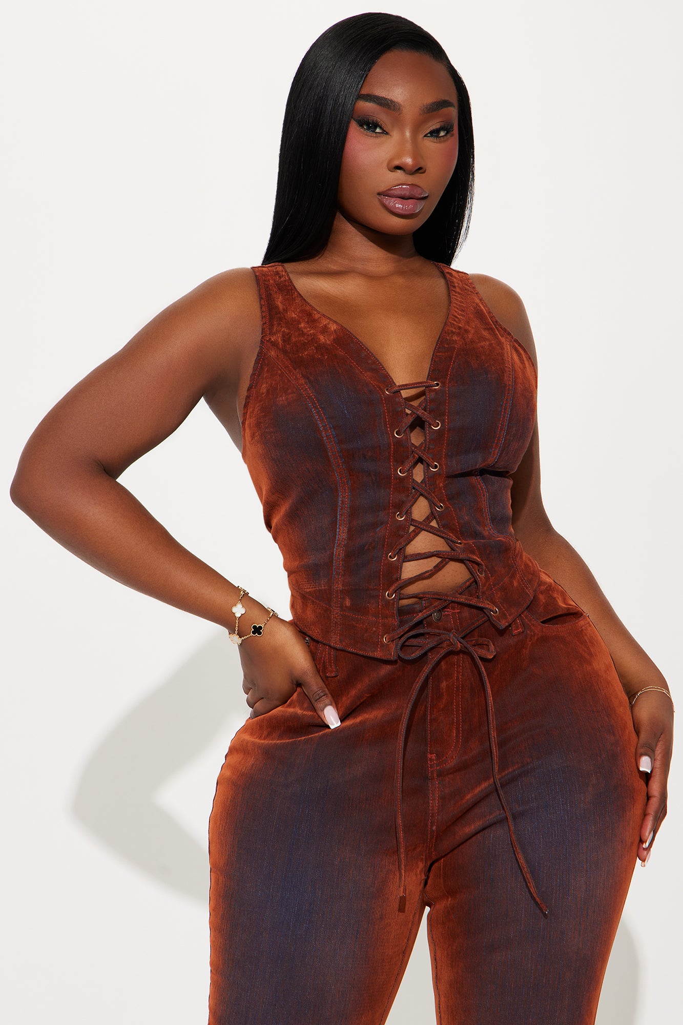 Available In Copper And Brown. Pair With They're Not Like Us Stretch Velvet Flare Jeans Denim Vest Lace Up Detail Sleeveless Velvet Flocked Denim Low Stretch Disclaimer: Due To The Specialized Wash Process, Each Garment Is Unique. Self: 70% Cotton 24% Polyester 4% Viscose 2% Spandex Flock: 100% Viscose Imported |