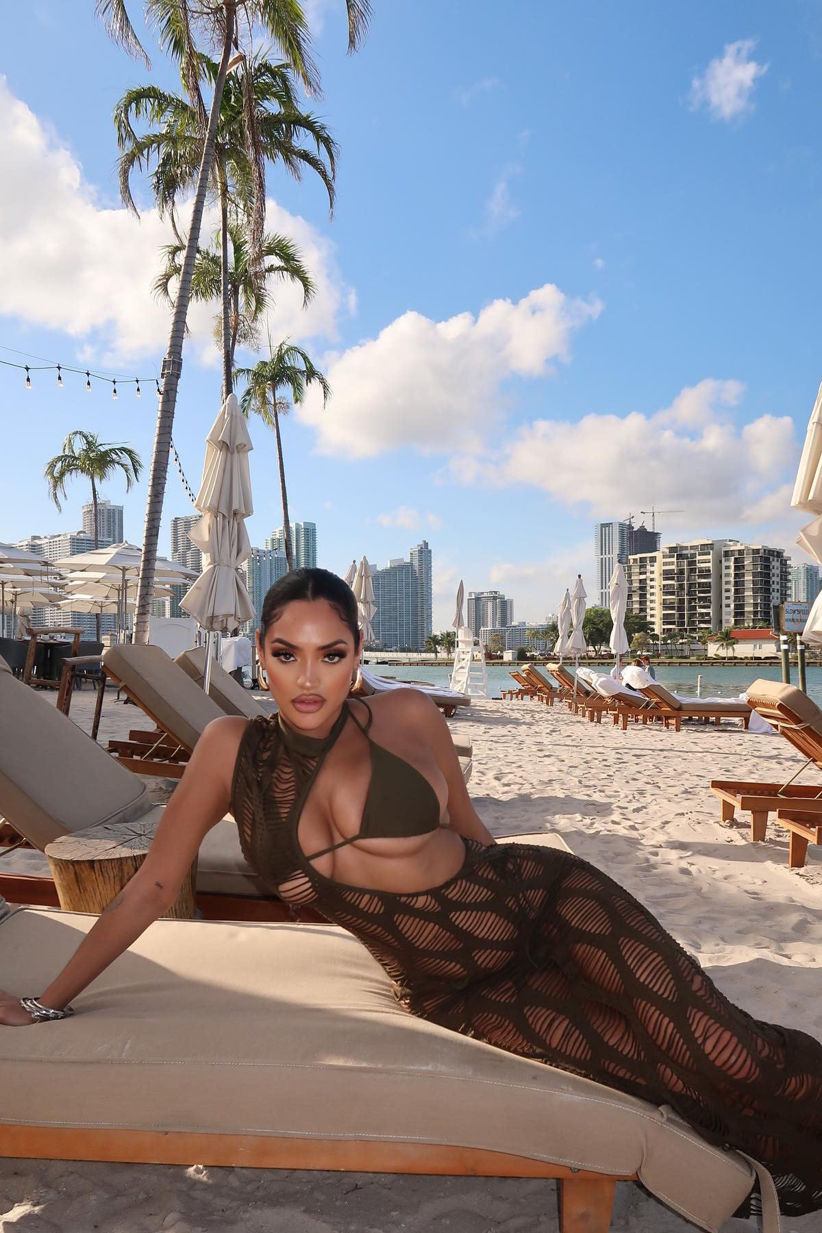 Available In Olive And Black. 3 Piece Bikini Set Triangle Bikini Top Adjustable Tunneled Straps Side Tie Bikini Bottom Mid Rise Cheeky Coverage Maxi Coverup Dress Cut Out Detail Full Stretch Final Sale Self: 87% Nylon 13% Spandex Lining: 95% Polyester 5% Spandex Cover Up: 95% Polyester 5% Spandex Imported |