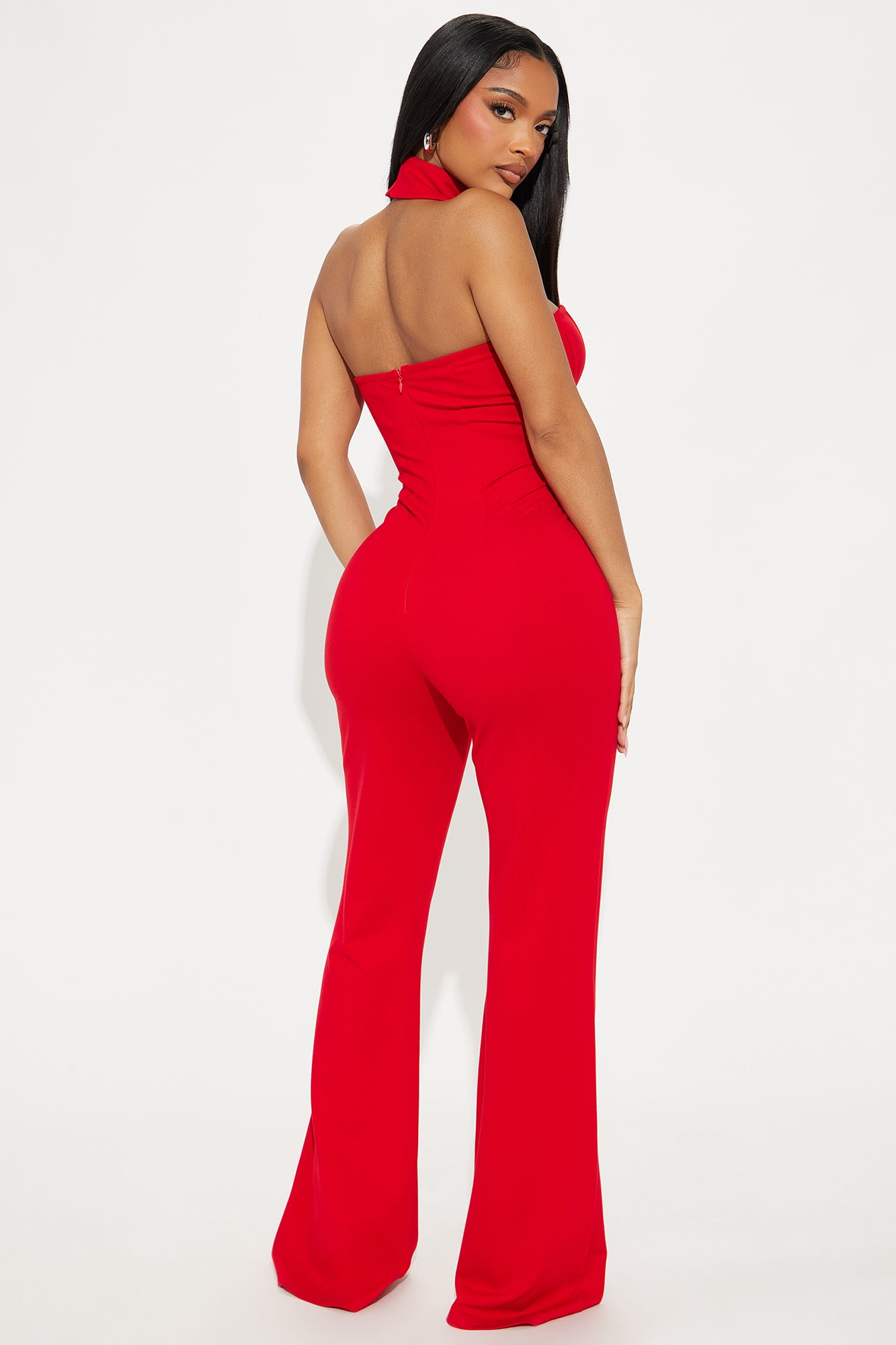 Available In Black/White And Red. Jumpsuit Strapless Mesh Panel Corset Waist Choker Included Hidden Back Zipper Flare Leg Stretch Inseam 34" Self/Contrast 1: 60% Rayon 30% Nylon 5% Spandex Contrast 2: 100% Nylon Imported |