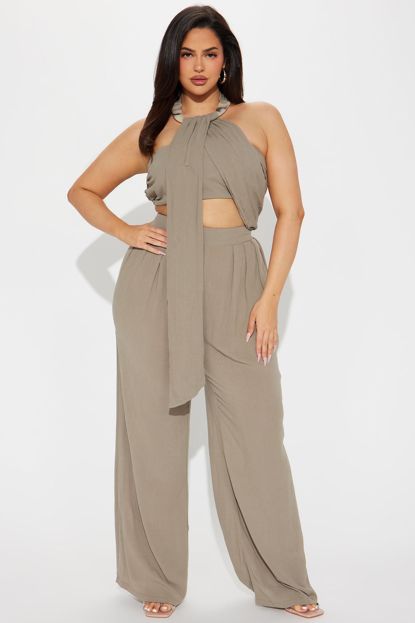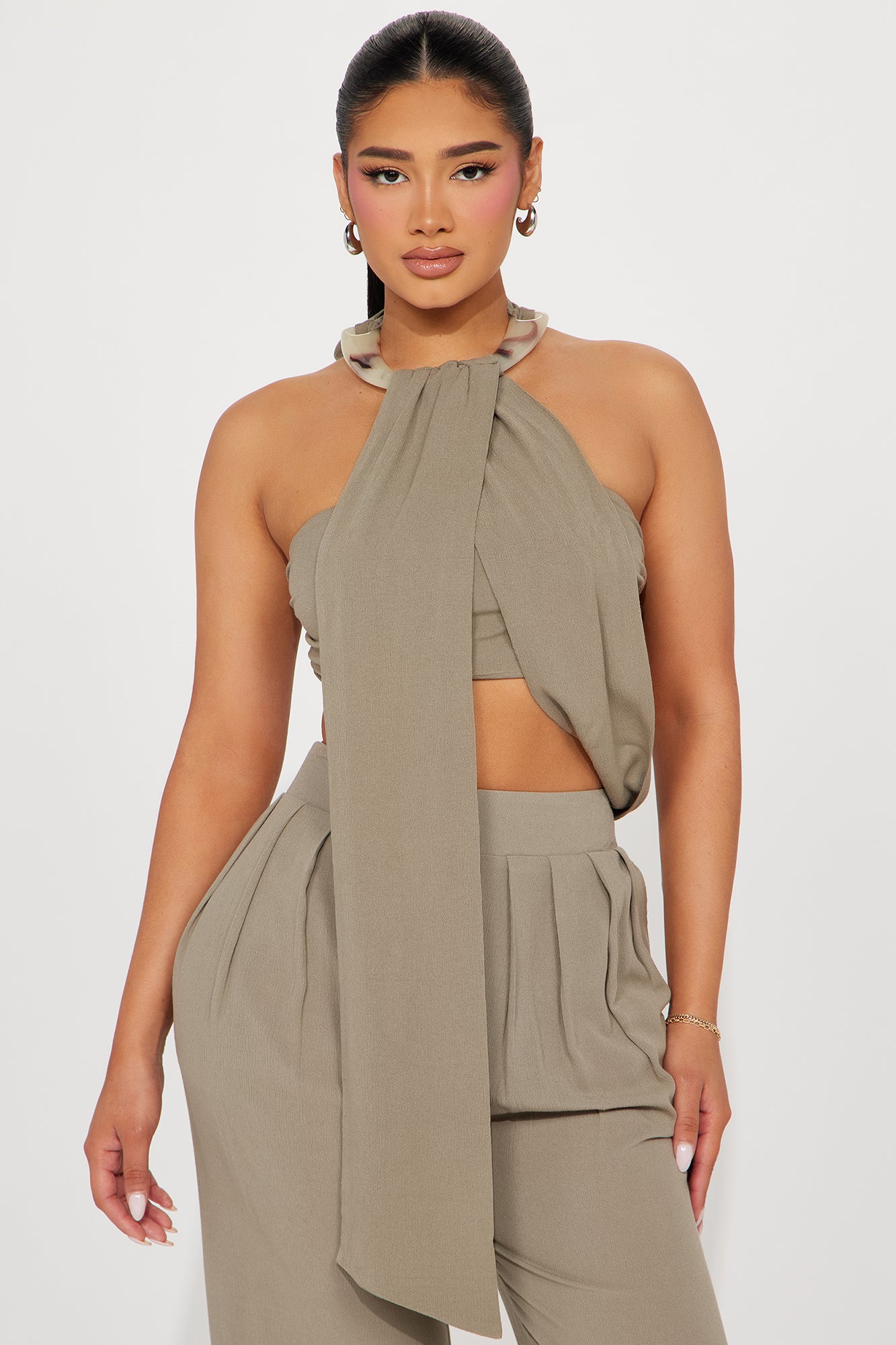 Available In Mocha And Olive. Pant Set Halter Top Hardware Detail Draped Smocked Back Wide Leg Pant Partial Elastic Waistband Pockets Invisible Zipper Non Stretch 31" Inseam Self: 100% Rayon Lining: 100% Polyester Imported |