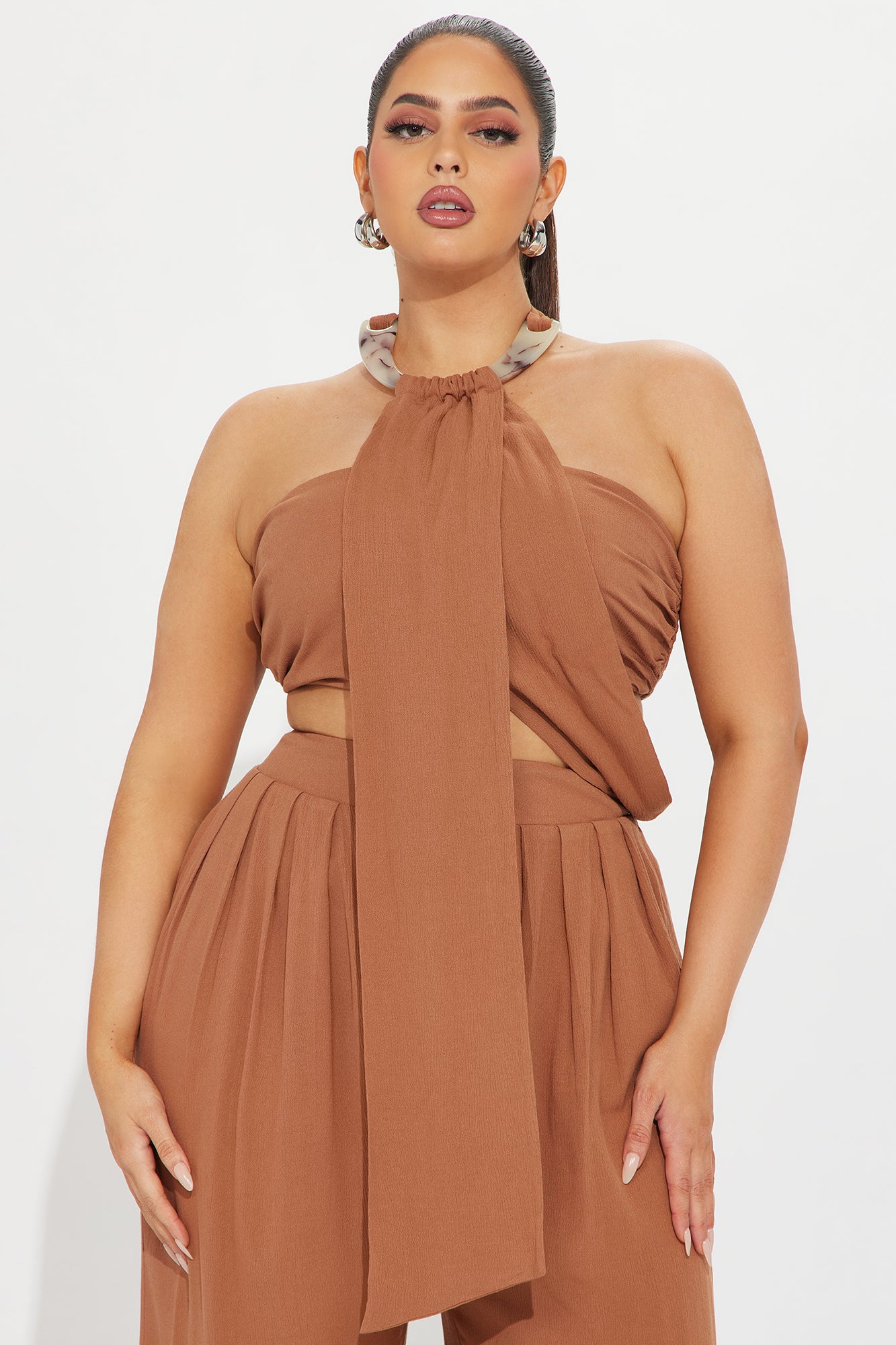 Available In Mocha And Olive. Pant Set Halter Top Hardware Detail Draped Smocked Back Wide Leg Pant Partial Elastic Waistband Pockets Invisible Zipper Non Stretch 31" Inseam Self: 100% Rayon Lining: 100% Polyester Imported |