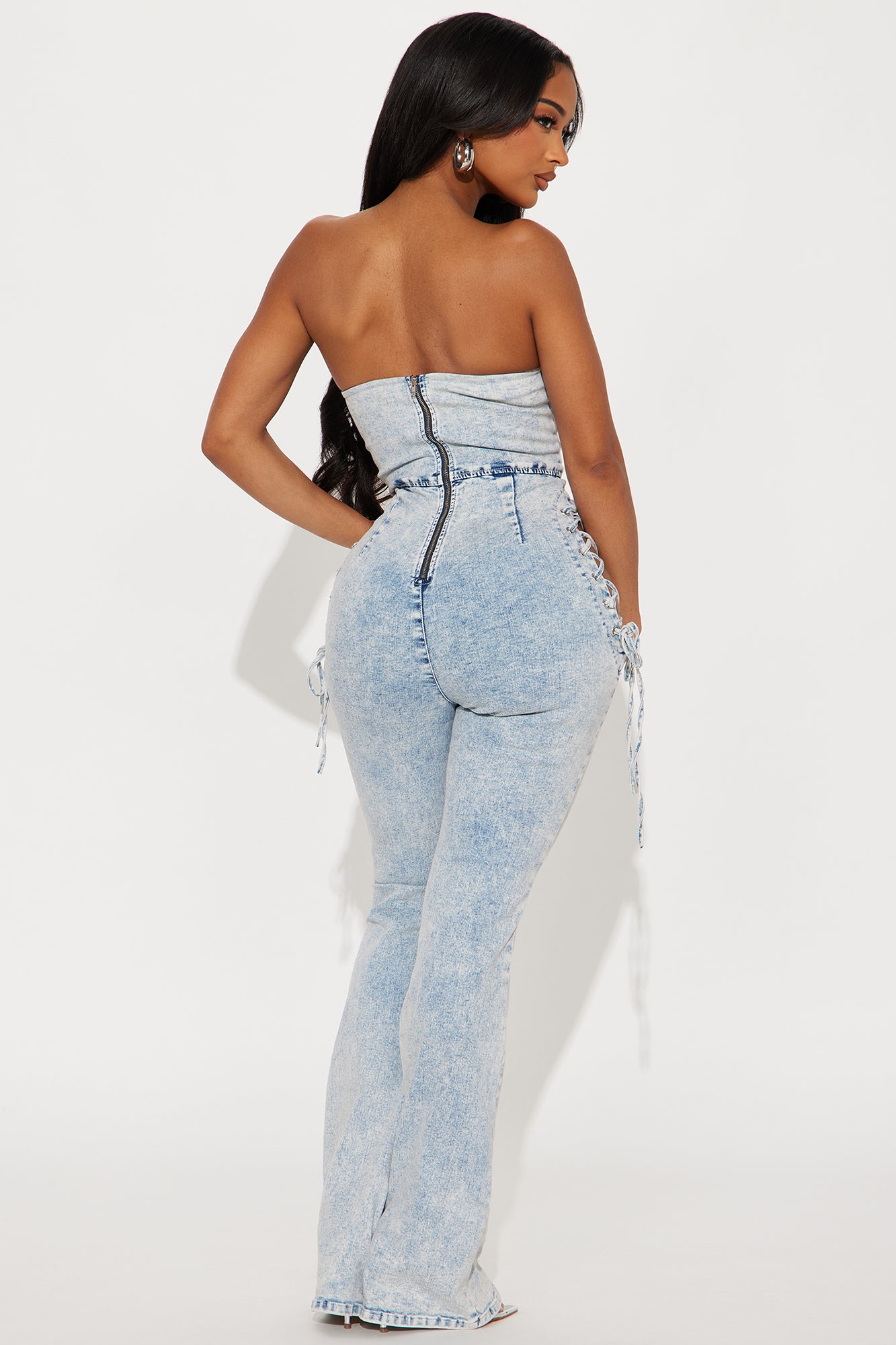 Available In Light Wash. Denim Jumpsuit Strapless Lace Up Detail Flare Leg Back Zipper Inseam = 34" Disclaimer: Due To The Specialized Wash & Distressing Process, Each Garment Is Unique. Self :73.5% Cotton 23% Polyester 2.5% Viscose 1% Spandex Imported |
