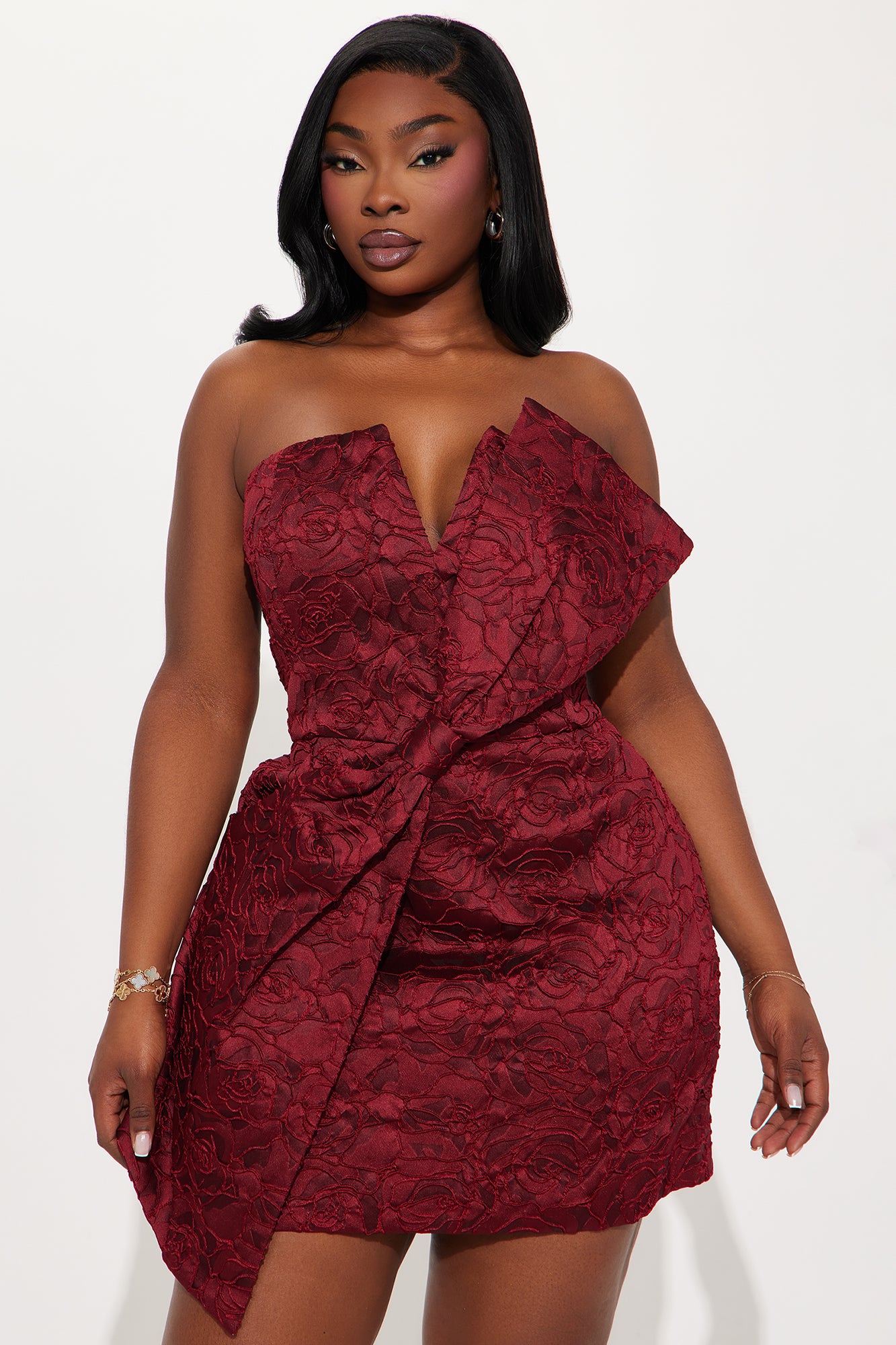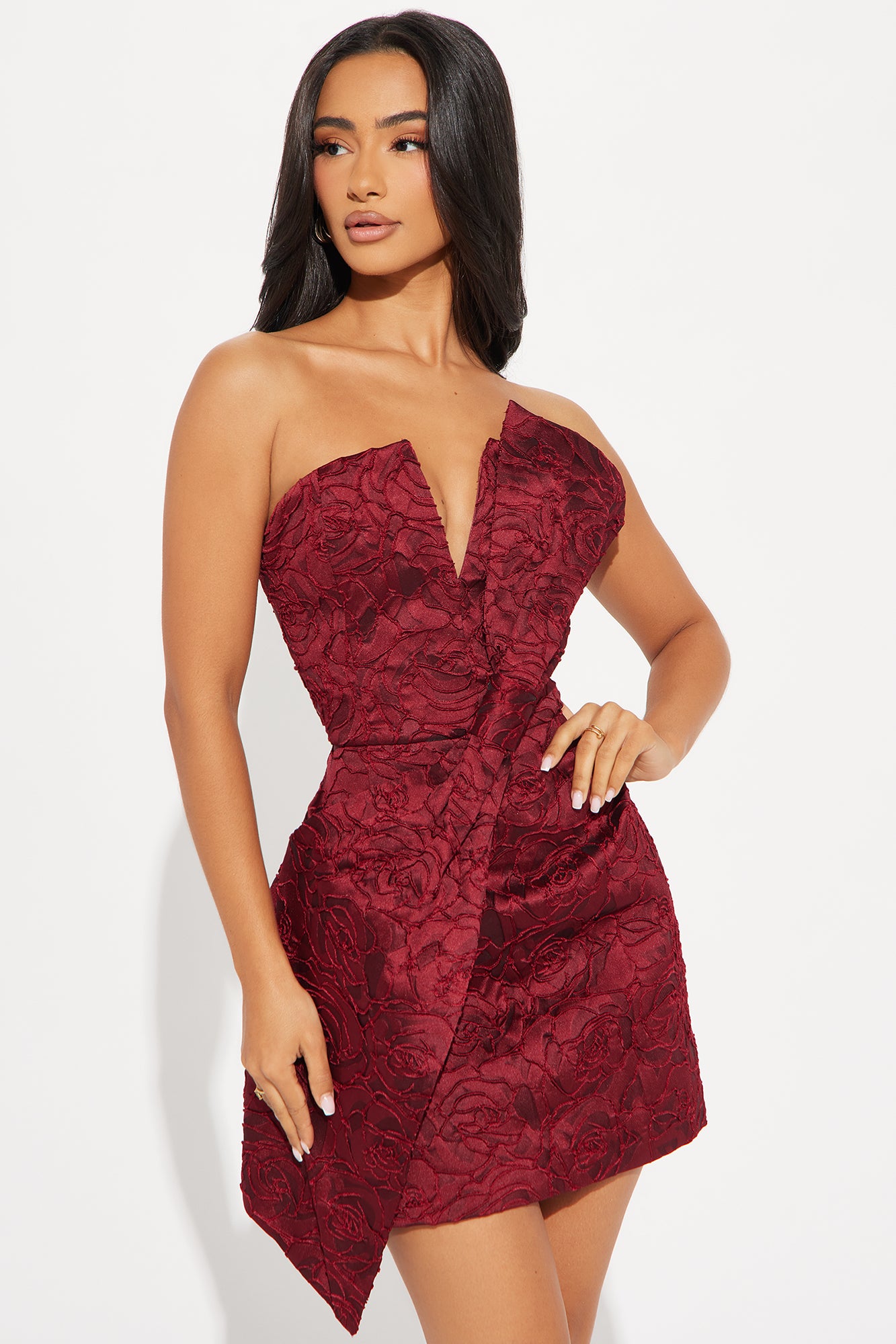 Available In Wine. Jacquard Mini Dress Notchneckline Strapless Knot/twist detail Back zipper Lined Length measured flat = 25" Disclaimer: Design Placement Will Vary Self / Lining 100% Polyester Imported |