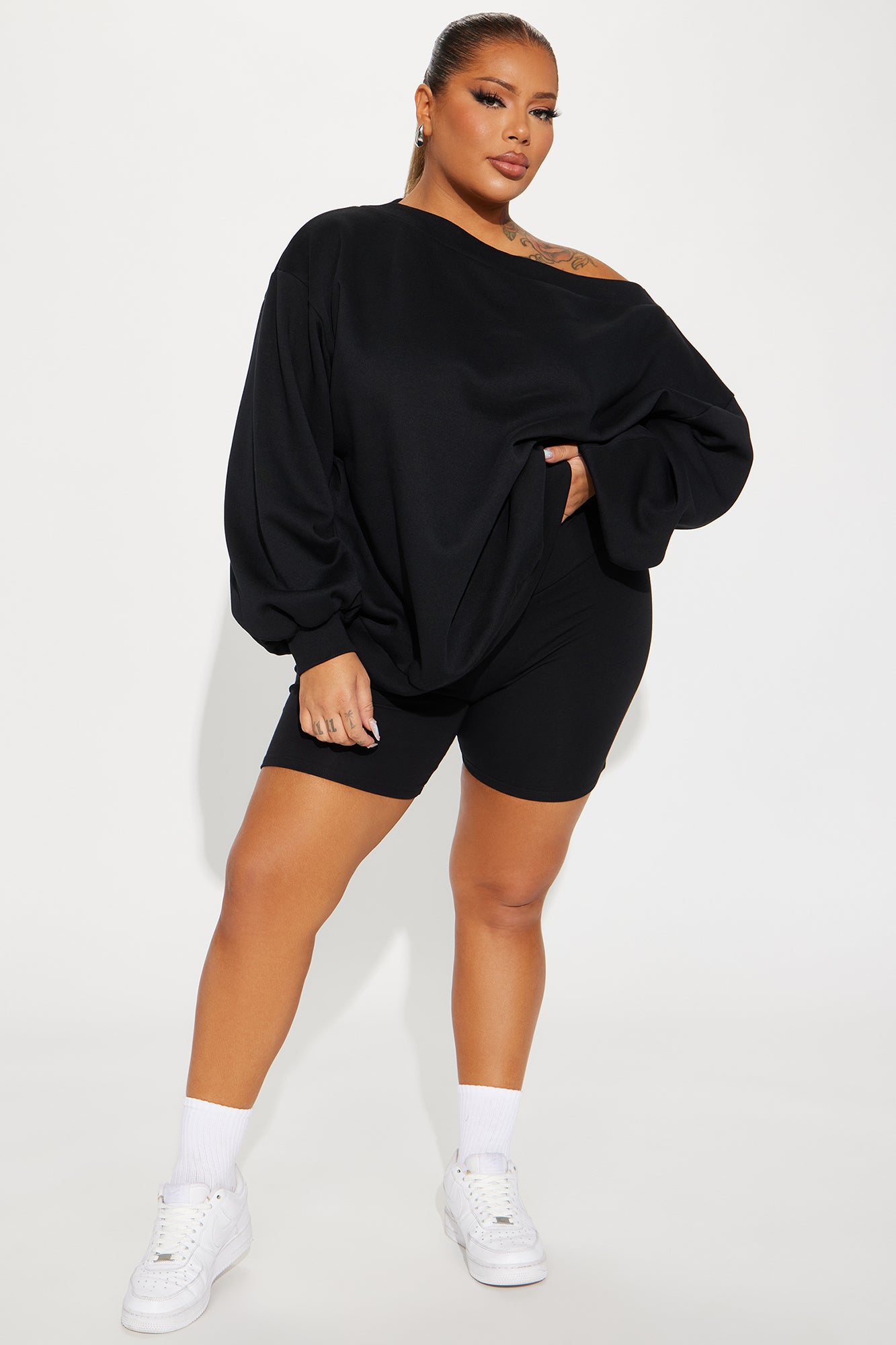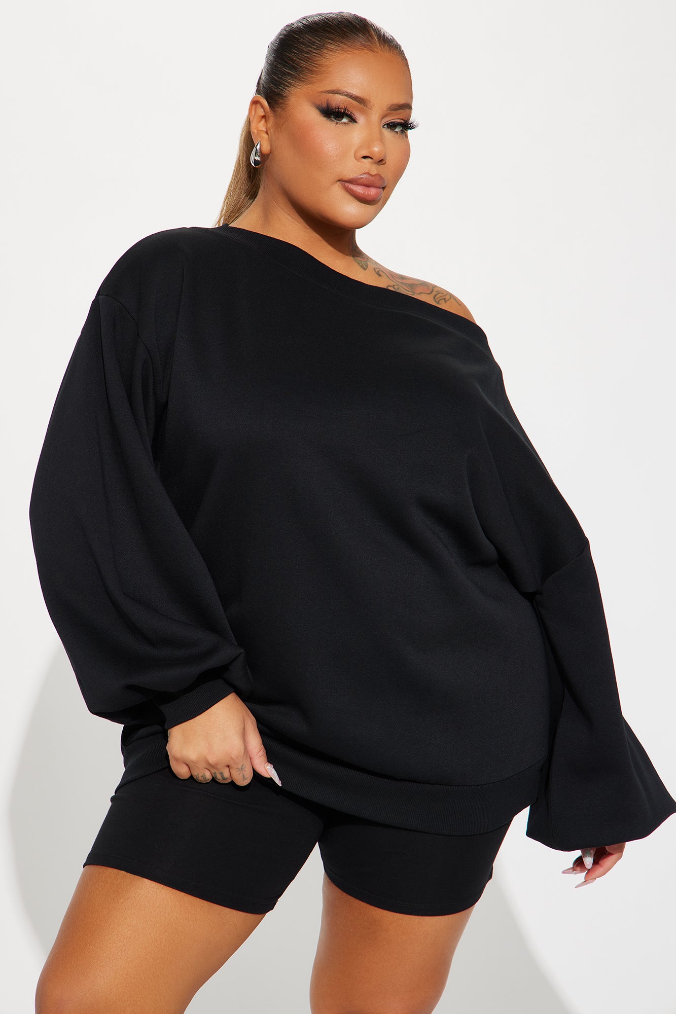 Available In Black. Lounge Sweatshirt Off Shoulder Long Sleeve Fleece Oversized Stretch 60% Cotton 40% Polyester Imported |