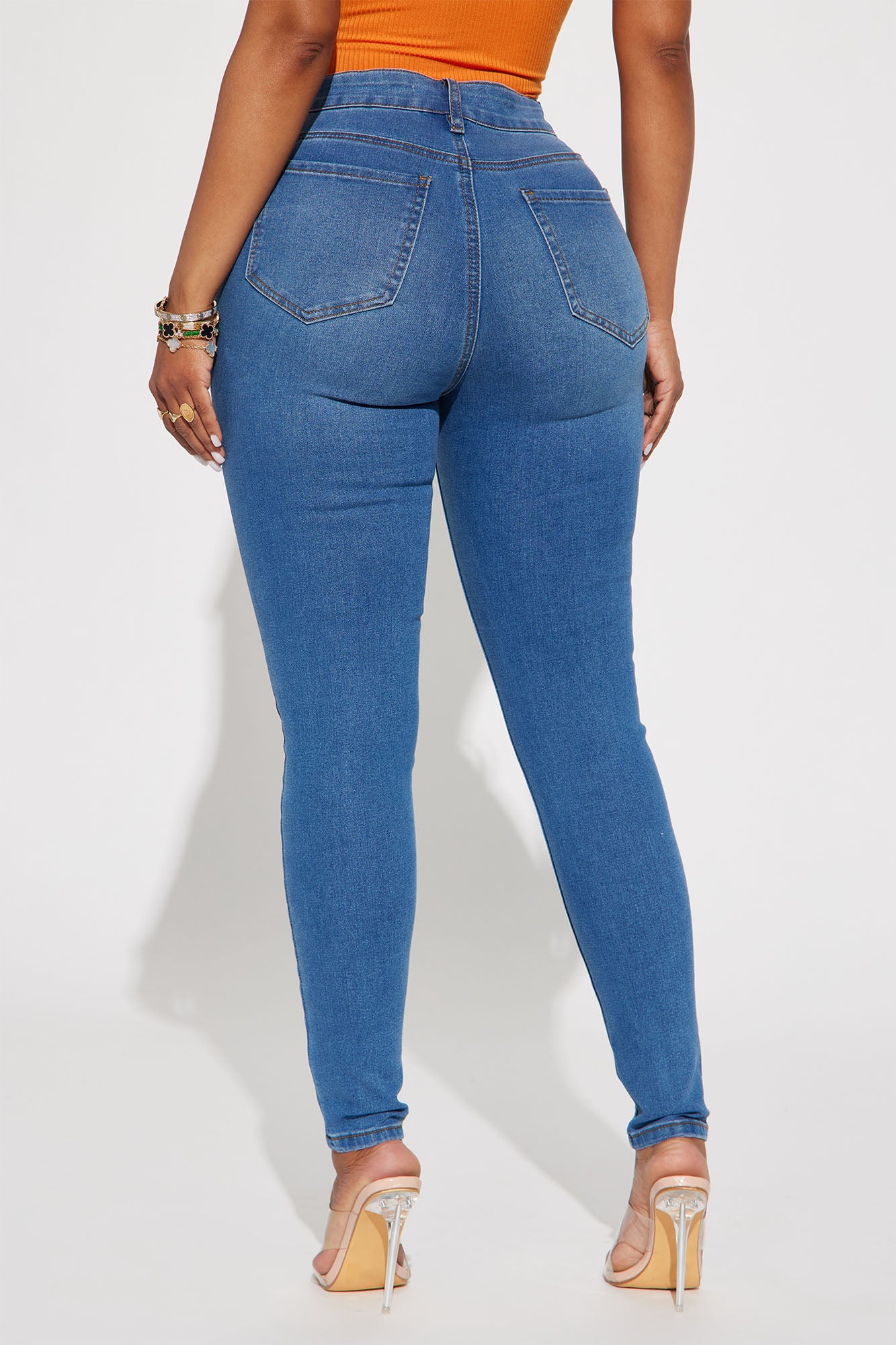 Available In Multiple Washes. Runs Small, Size Up Skinny Jean Medium Stretch 5 Pocket Back Dart Shaping Detail 27.5" Inseam 10" Mid Rise Disclaimer: Due To The Specialized Wash Process, Each Garment Is Unique. 54% Cotton 26% Polyester 18% Rayon 2% Spandex Imported |