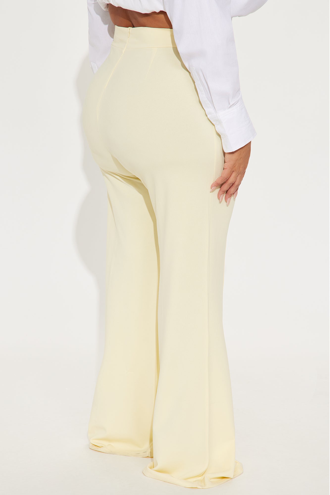 Available In Butter Yellow And Oatmeal. High Rise Crepe Knit Pintuck On Front Back Hidden Zipper 35 Inseam. Based On A Size Small 95% Polyester 5% Spandex Imported |